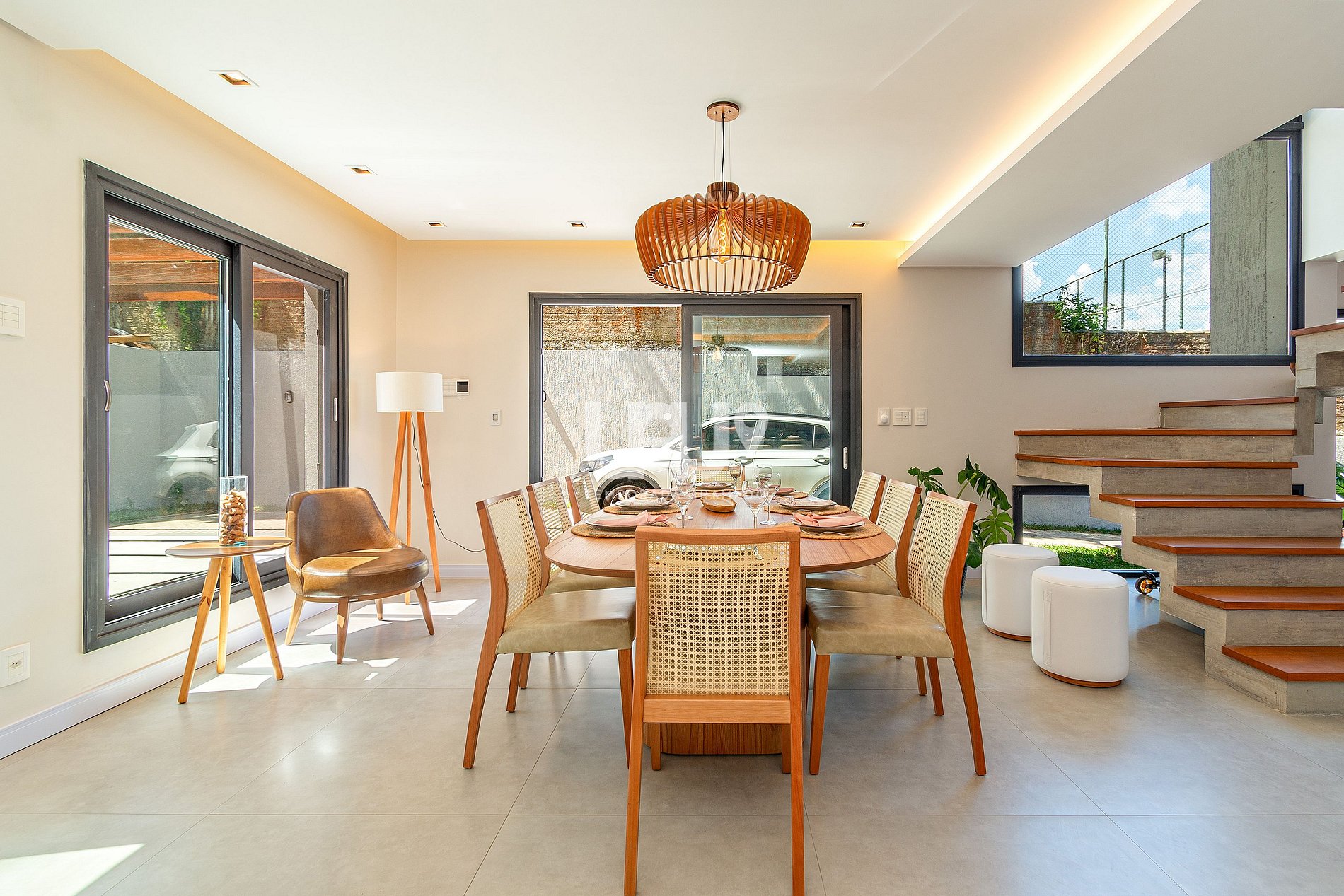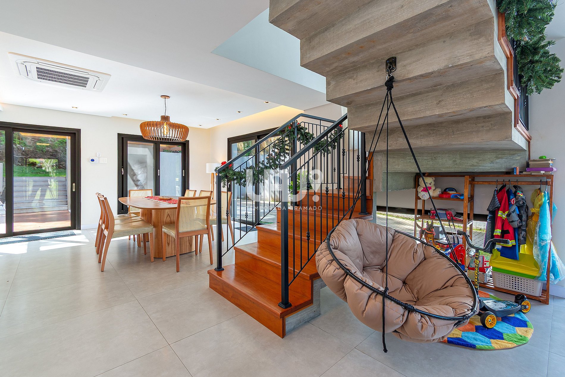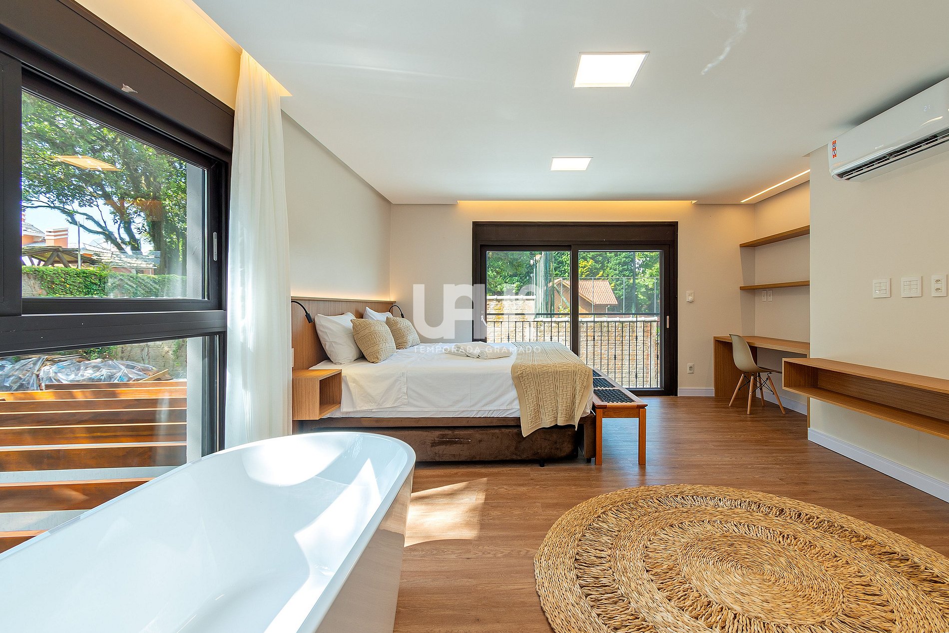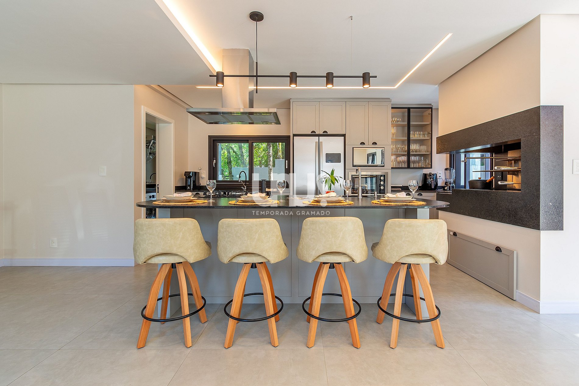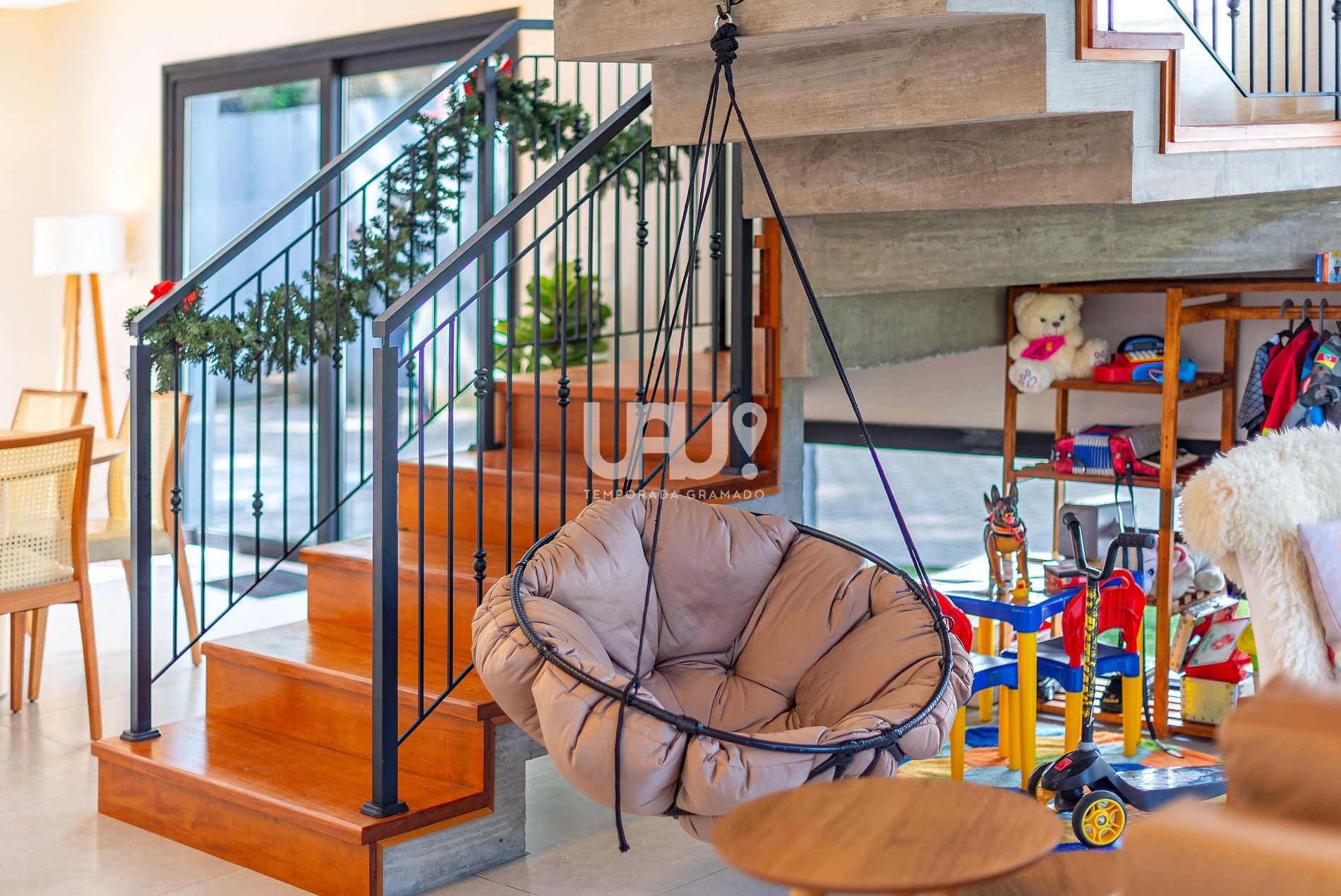 • Piscina térmica privativa (temperatura 28º a 30ºC). Em dias com temperatura externa inferior a 10ºC o aquecimento não é possível.• 4 suítes elegantes, incluindo uma master com banheira de imersão;• Living aconchegante com lareira, Smart TV 55”, sofá em couro, cadeira ninho suspensa e brinquedoteca integrada para os pequenos;• Cozinha gourmet equipada, com refrigerador side by side, forno elétrico, air fryer, cafeteira elétrica, sanduicheira, liquidificador, jarra elétrica, purificador de água refrigerado e utensílios completos;• *Living e cozinha também climatizadas com ar-condicionado quente e frio;*• Espaço para churrasco, com grelha, espetos rotativos e bifeteira;• Wi-Fi ultra-rápido (1.000Mb);• Garagem para até 5 carros;No térreo, além do living integrado, a casa possui um lavabo requintado e uma suíte.