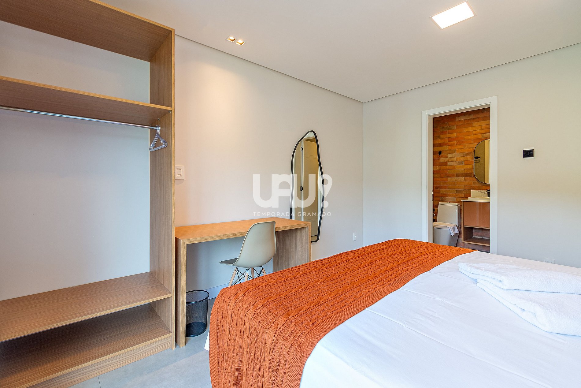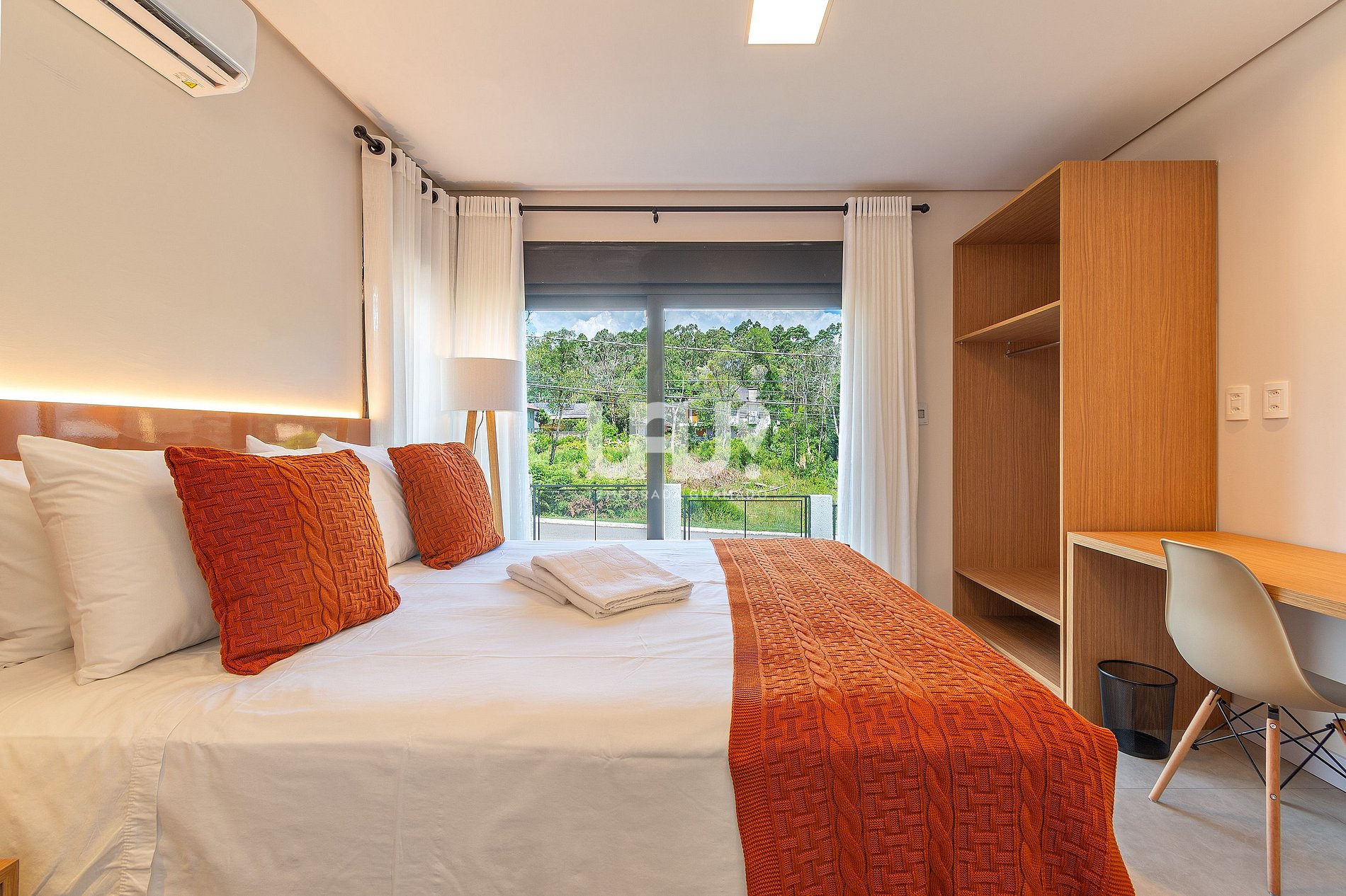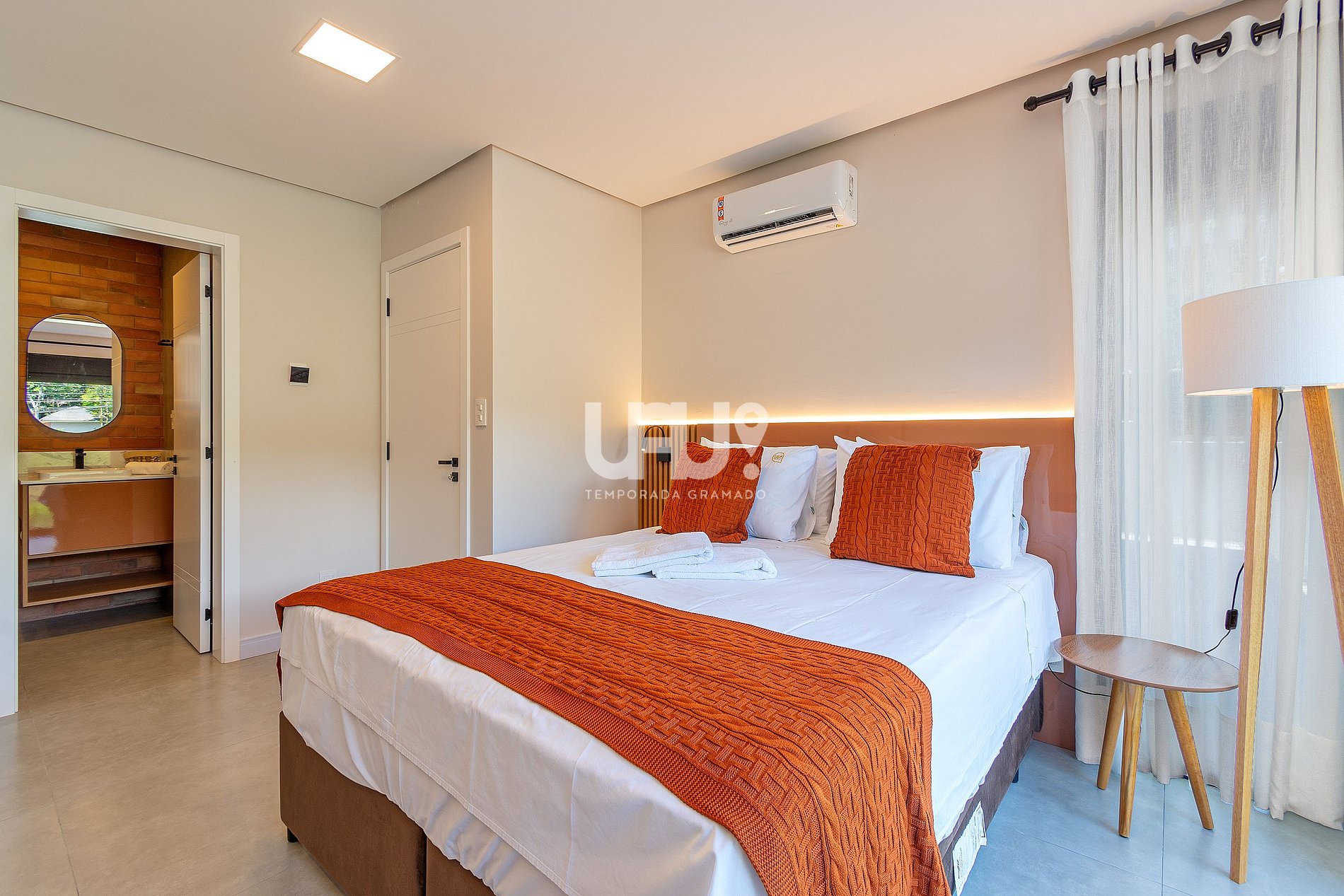 Cama King Size, (1) cama auxiliar de solteiro, ar-condicionado quente e frio, rouparia completa, escrivaninha, amplo banheiro completo com cuba dupla, e secador de cabelo;