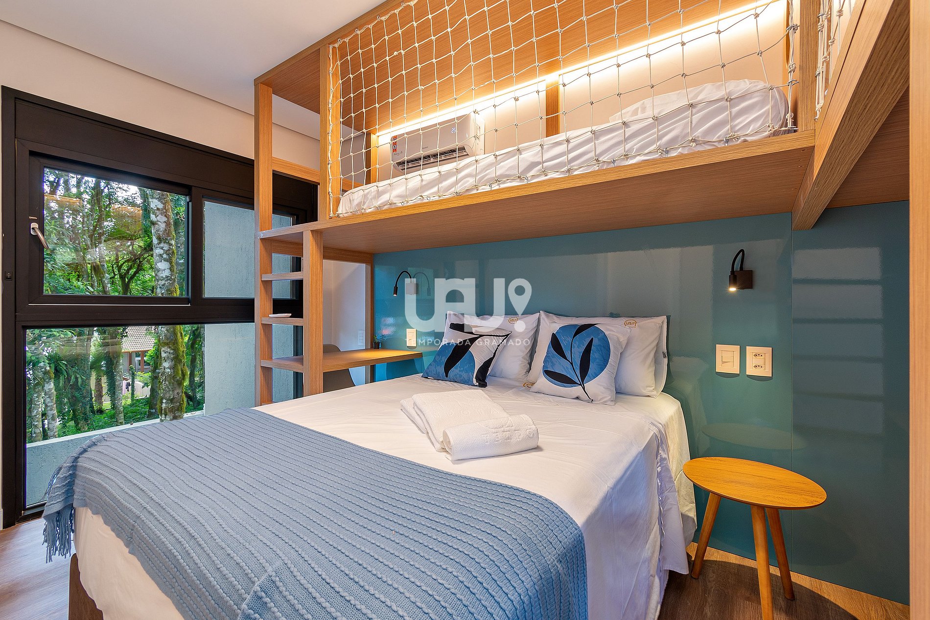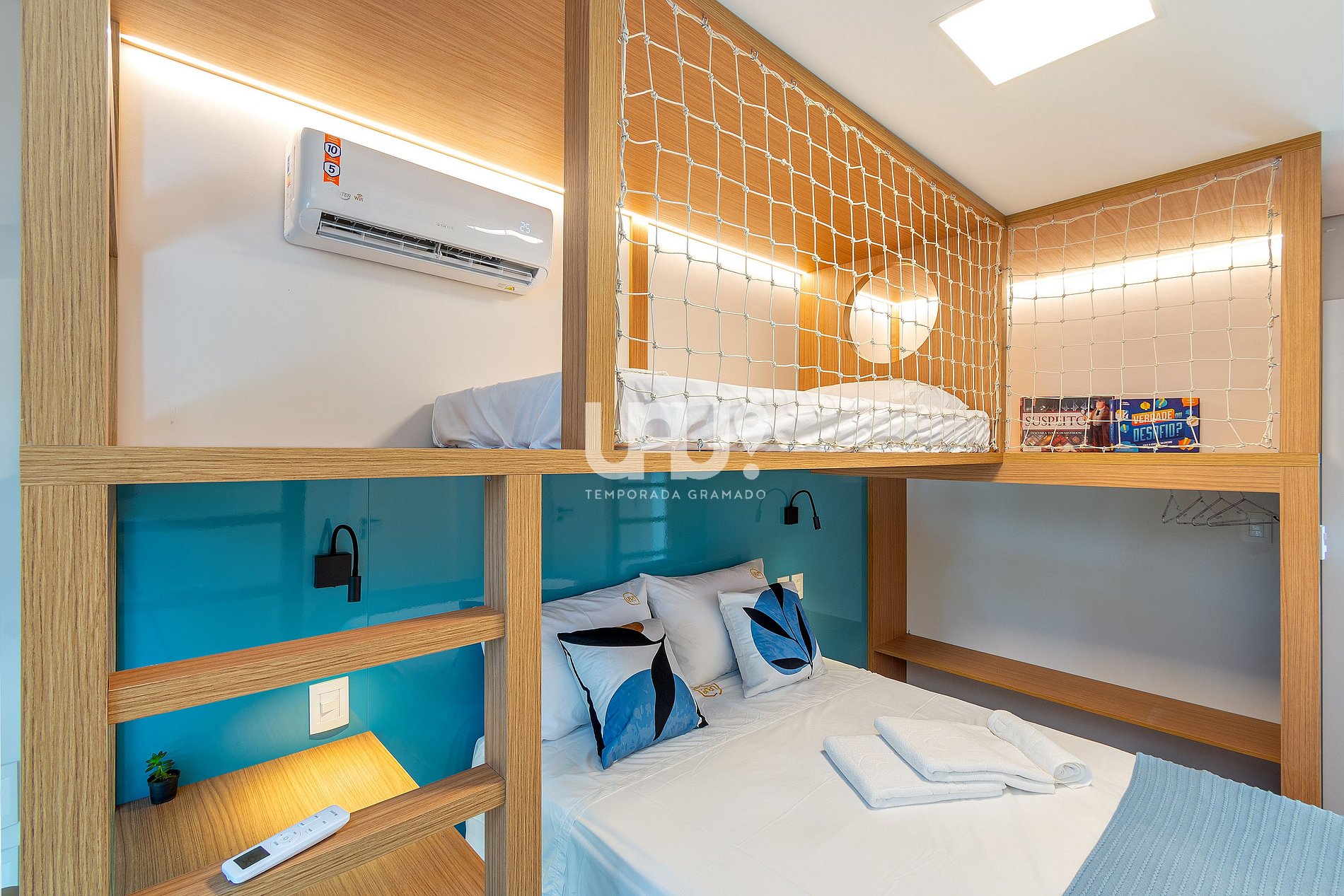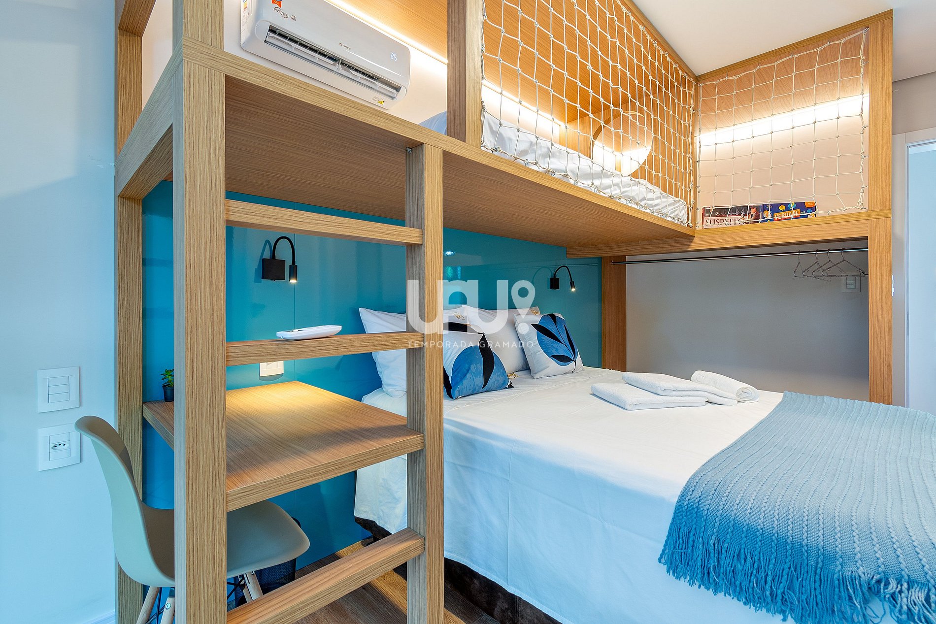 Suíte com uma abordagem que também agrada um público infanto/juvenil contendo (1) Cama casal, (1) beliche cama de solteiro e espaço para interação infantil e jogos, ar-condicionado quente e frio, rouparia completa e banheiro completo.