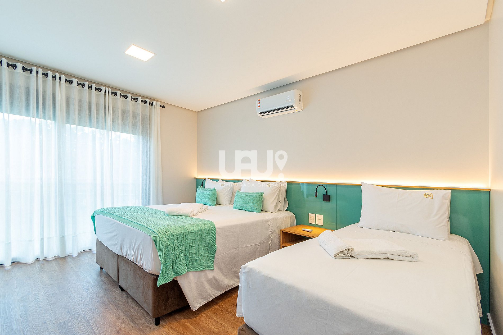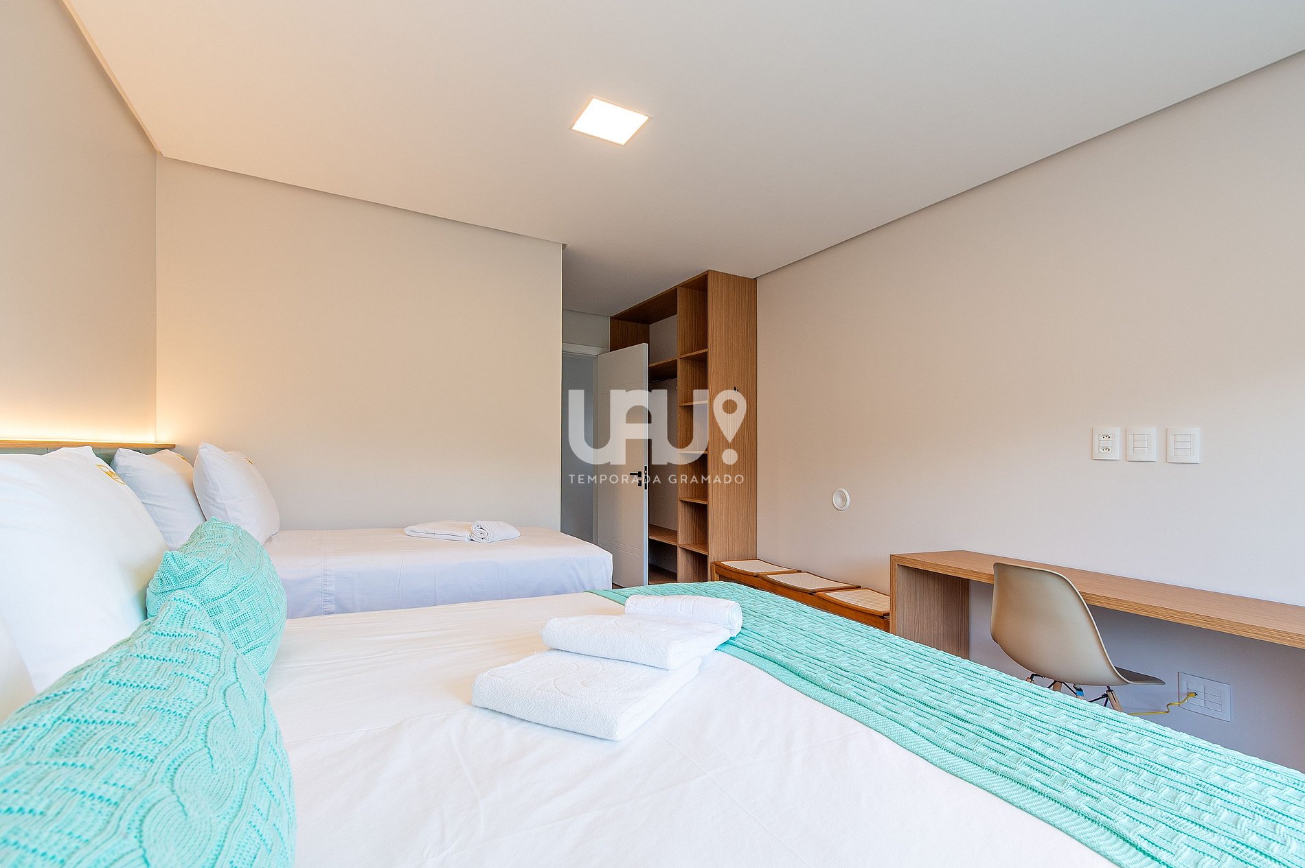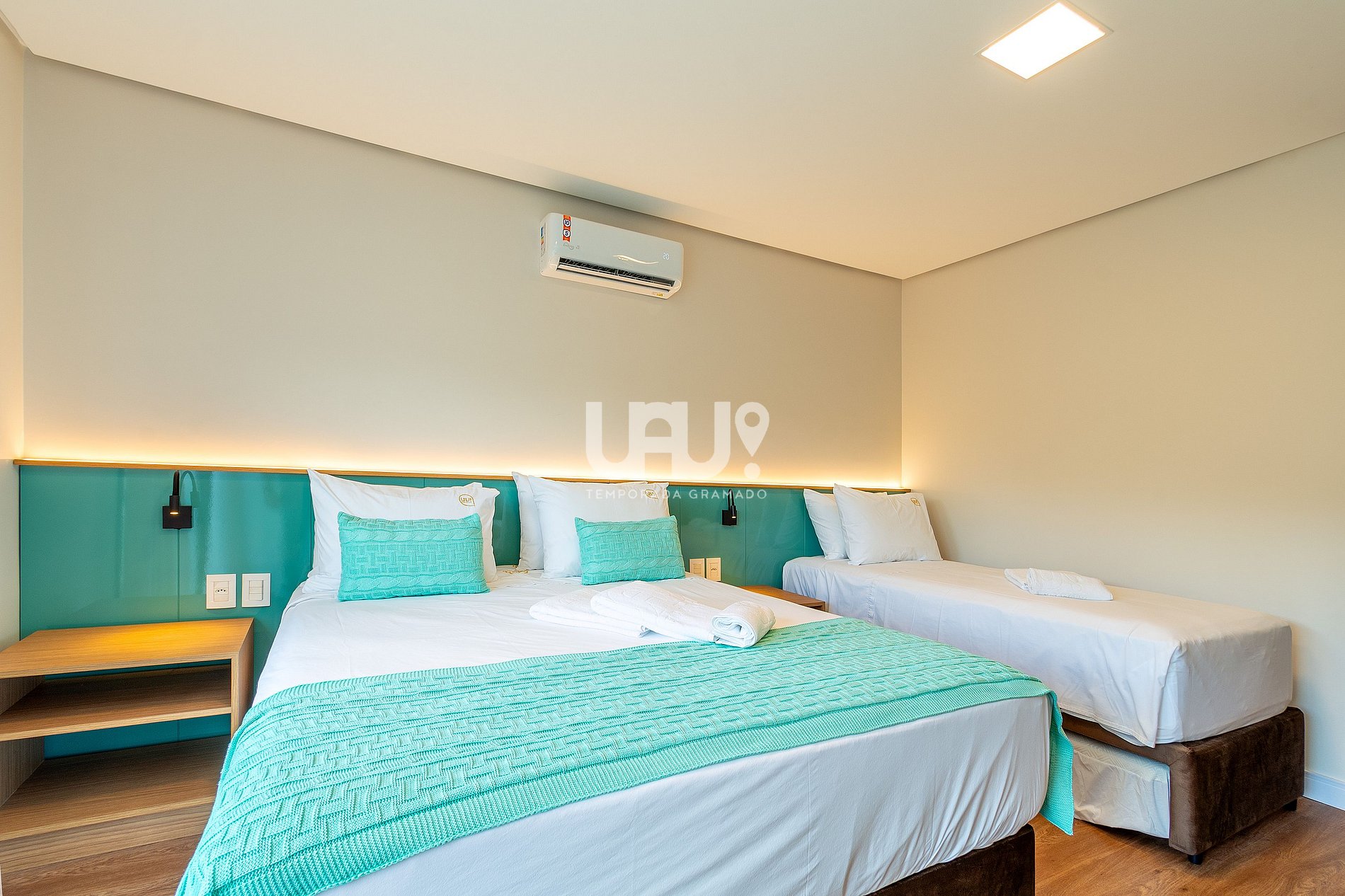 Suíte com uma abordagem que também agrada um público infanto/juvenil contendo (1) Cama casal, (1) beliche cama de solteiro e espaço para interação infantil e jogos, ar-condicionado quente e frio, rouparia completa e banheiro completo.