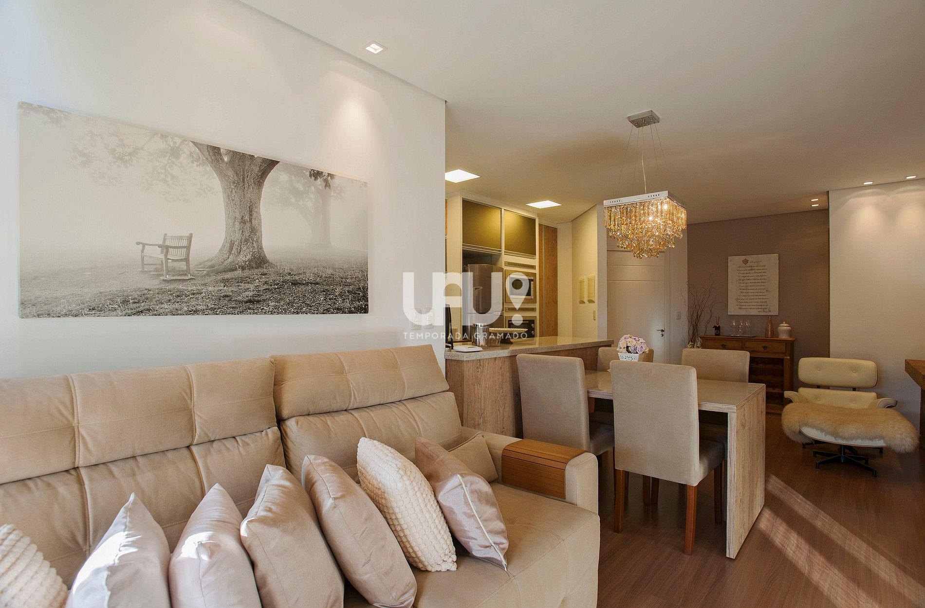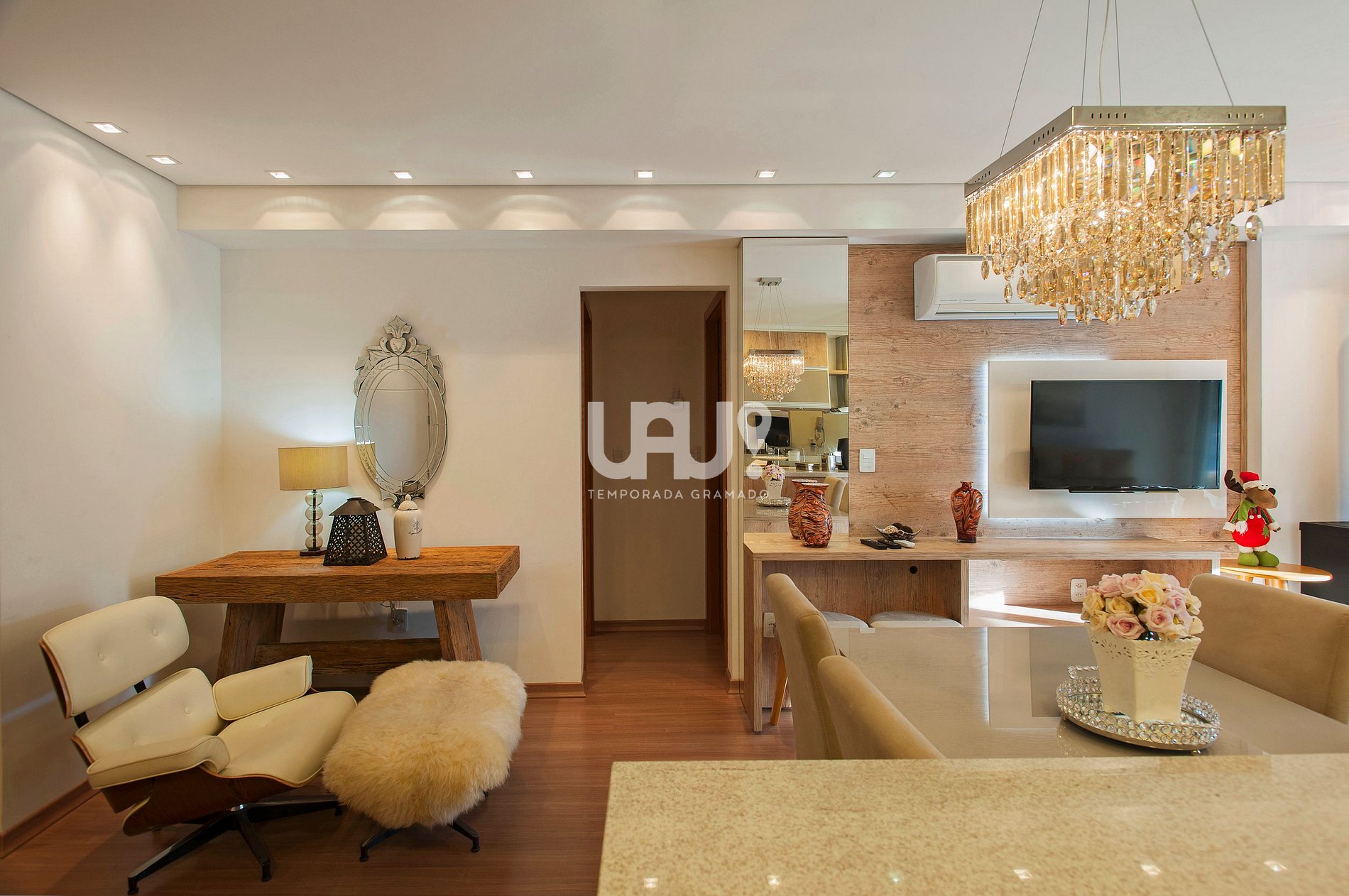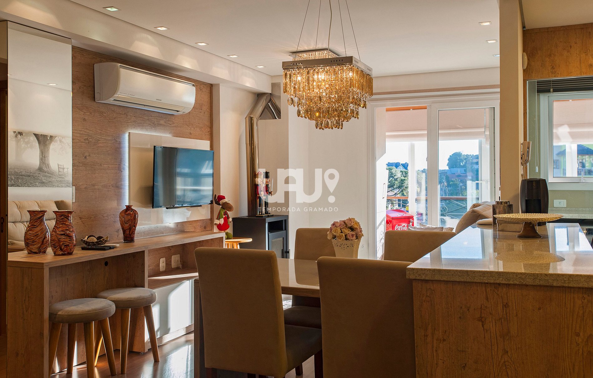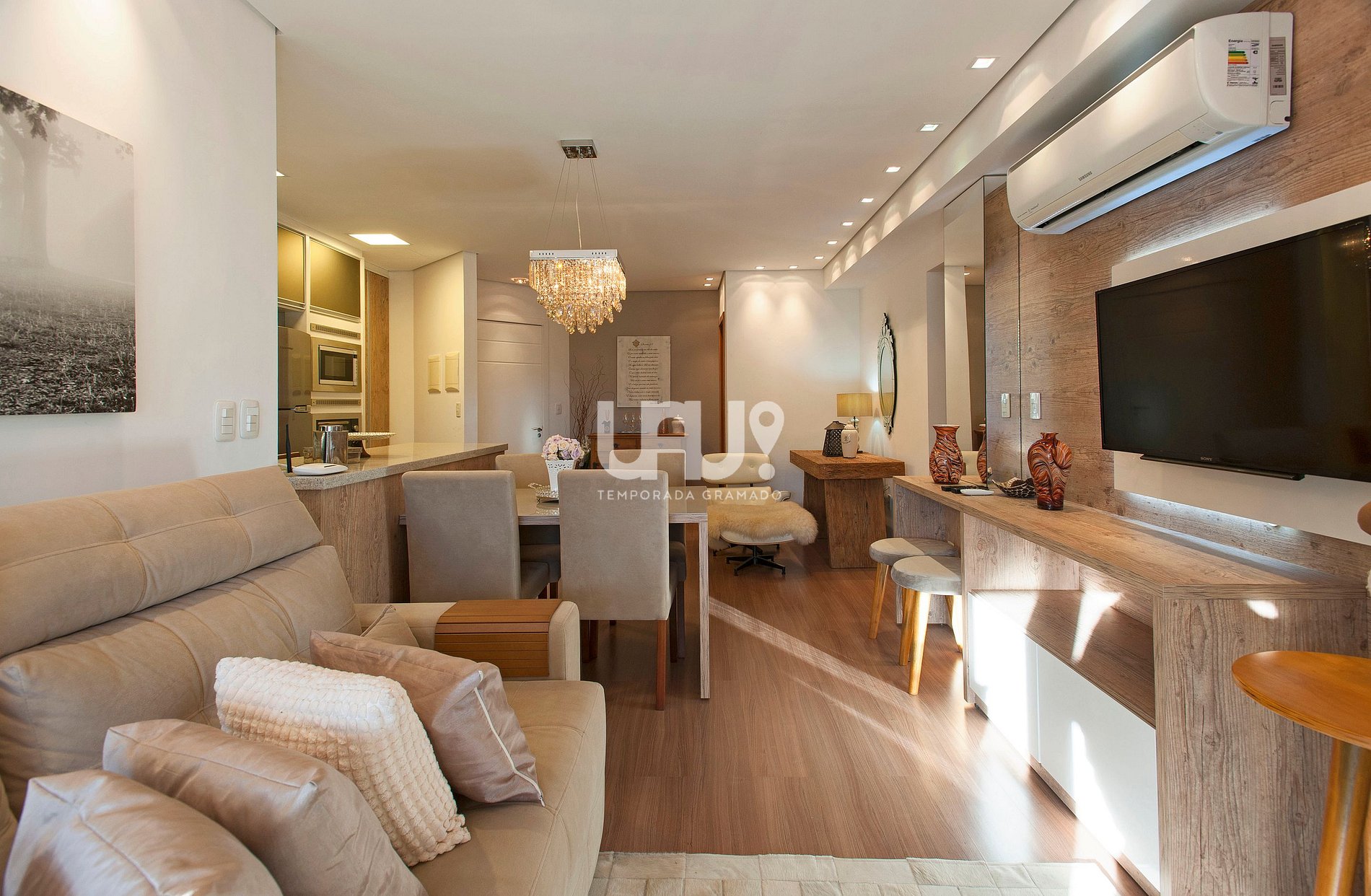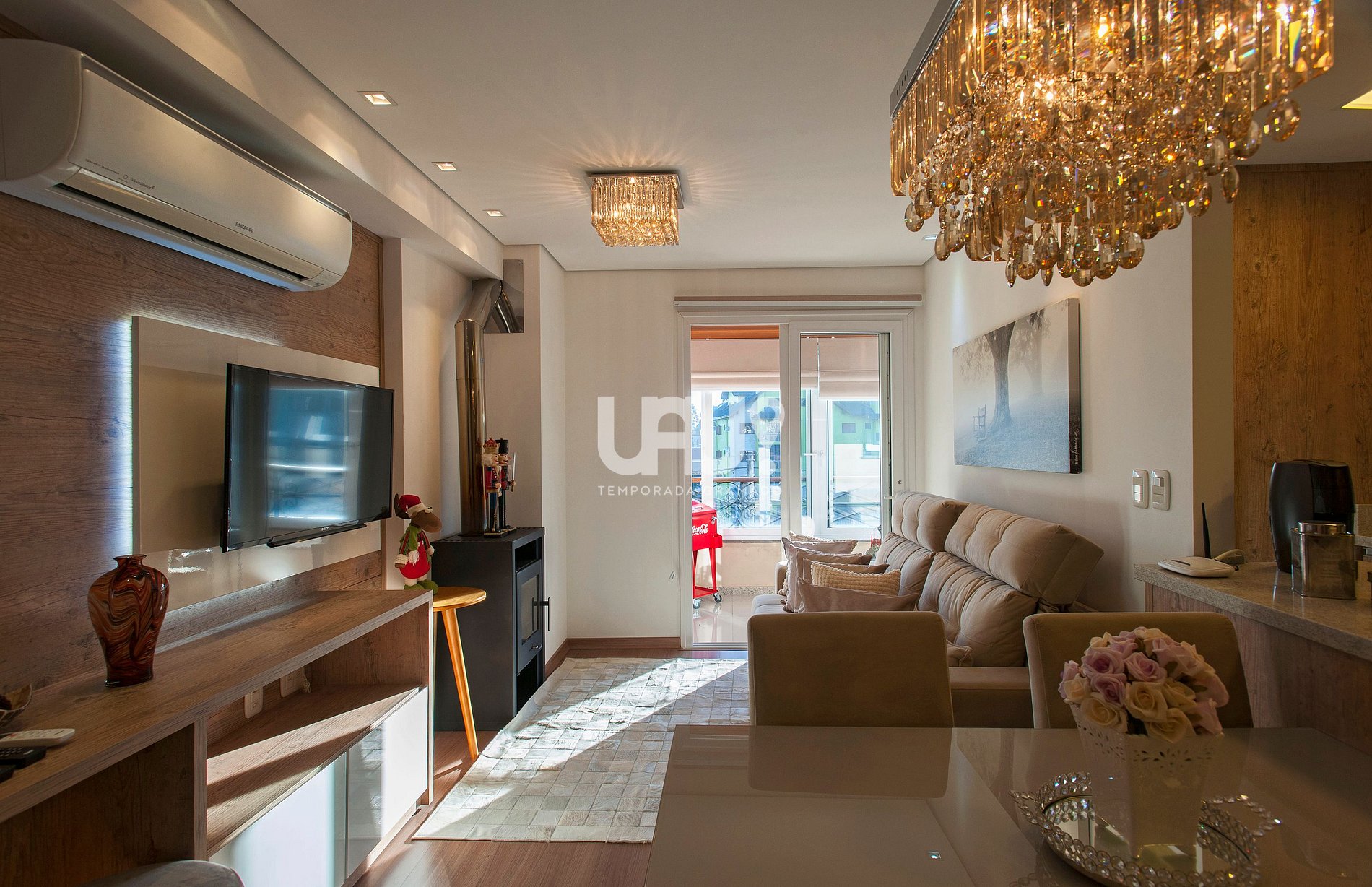Living em 3 ambientes SmartTV 40’, sofá retrátil, split q/f, lareira, sacada integrada com churrasqueira, de frente para a avenida;