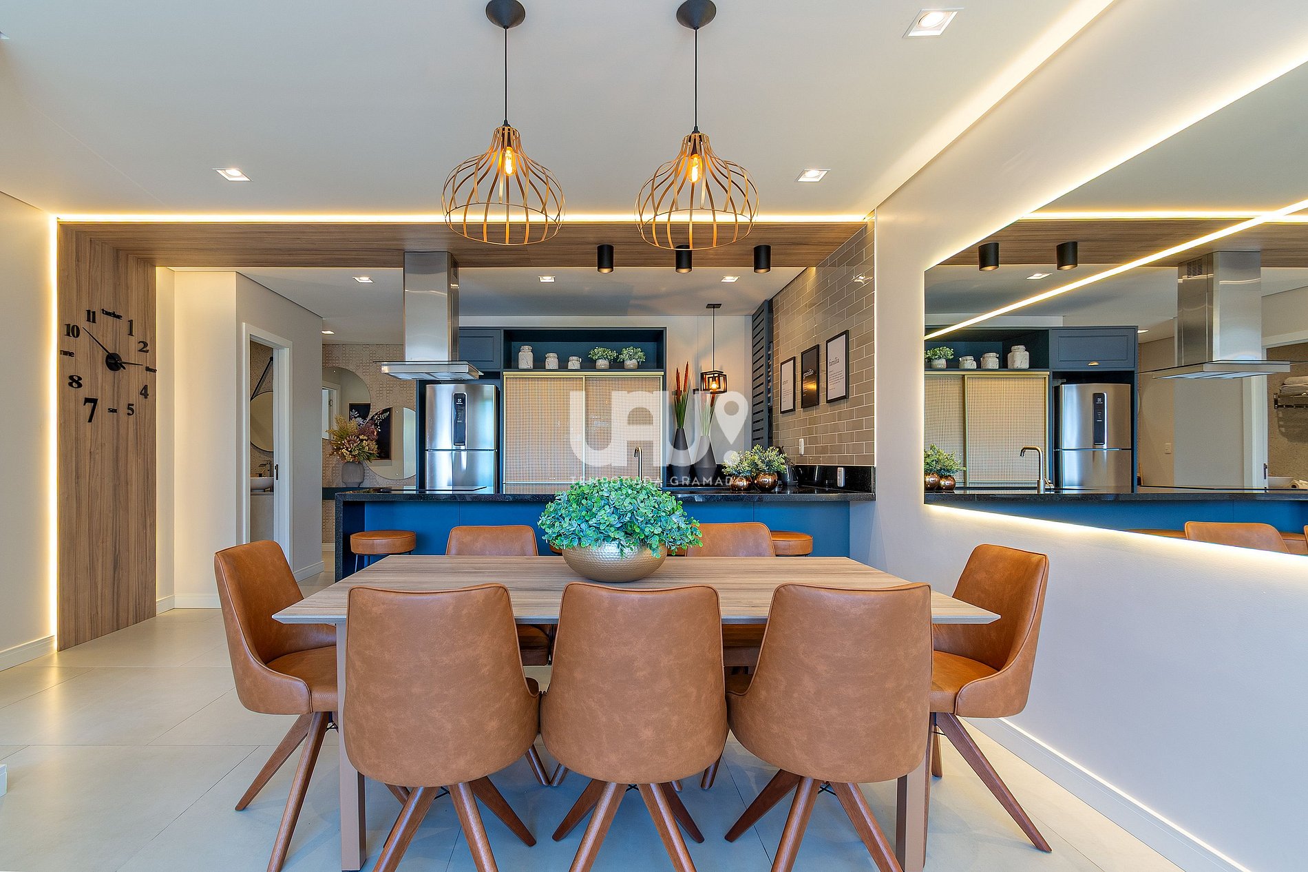 A mesa de jantar, a península com banquetas altas e confortáveis, acomodam tranquilamente