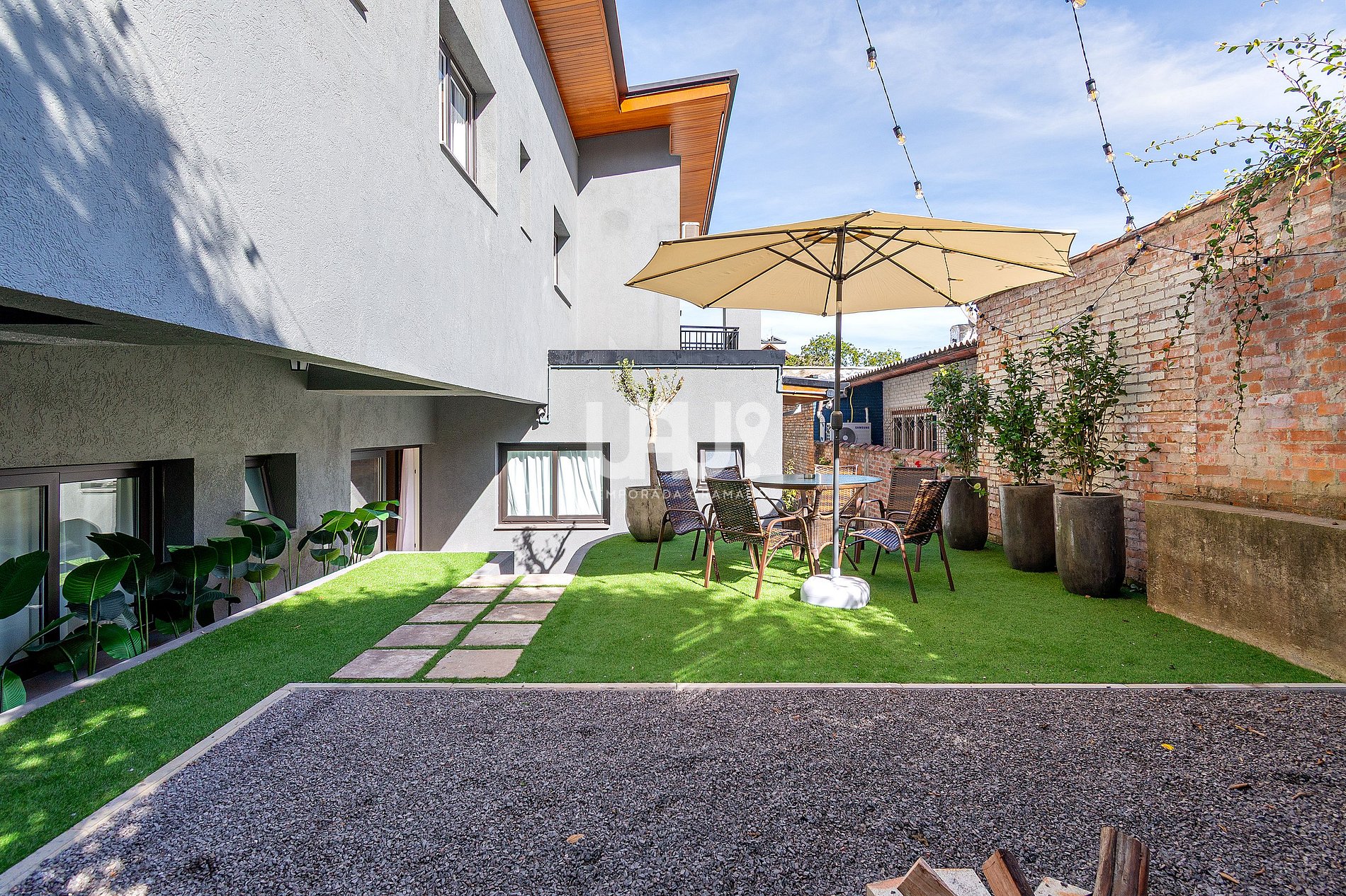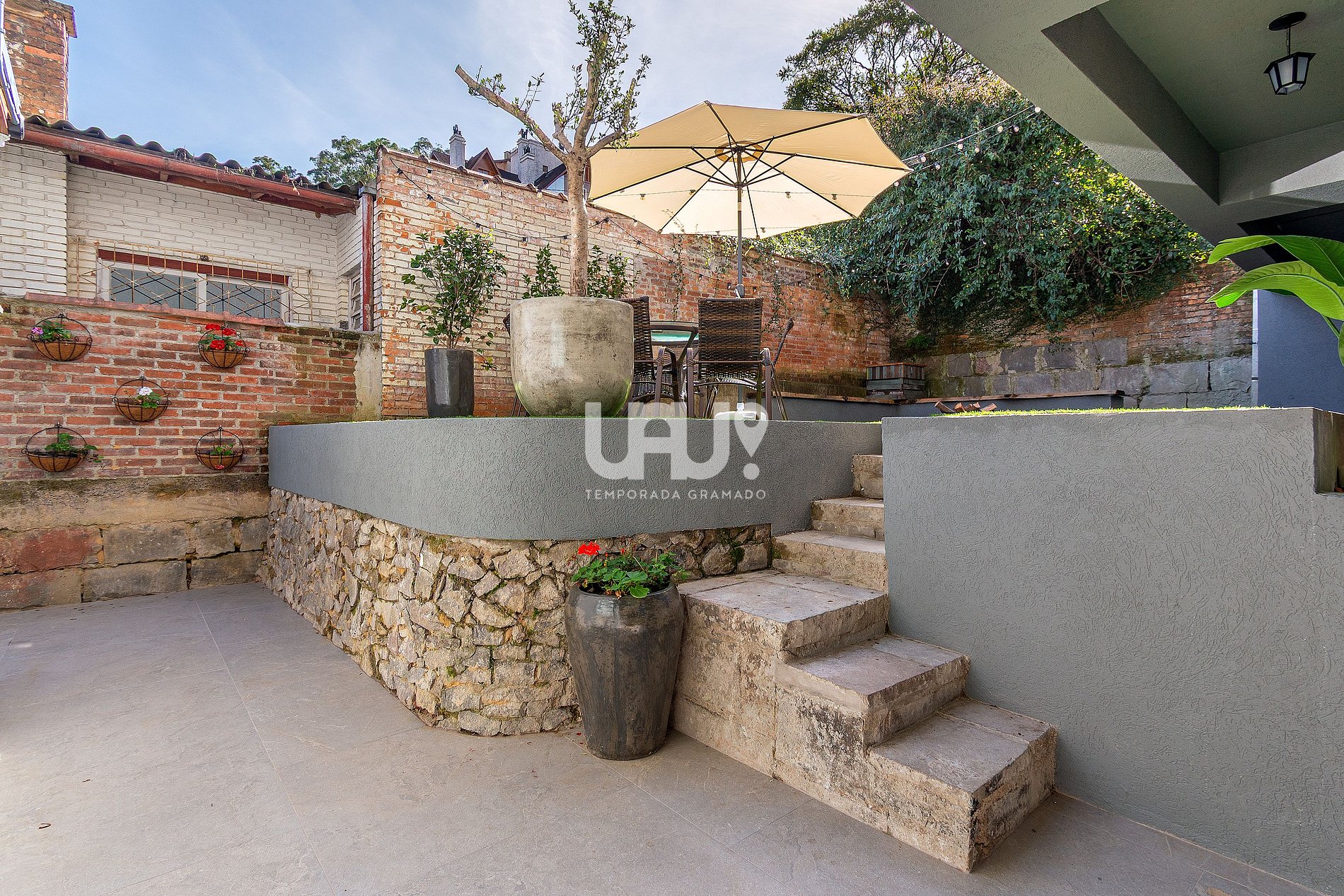 A tranquilidade deste apartamento, amplo e com cores suaves, guarda um segredo encantador: uma verdejante área externa, exclusiva e convidativa, com fogo de chão para curtir o inverno e uma abundante incidência solar junto a natureza, contendo mesa, cadeiras e ombrelone.