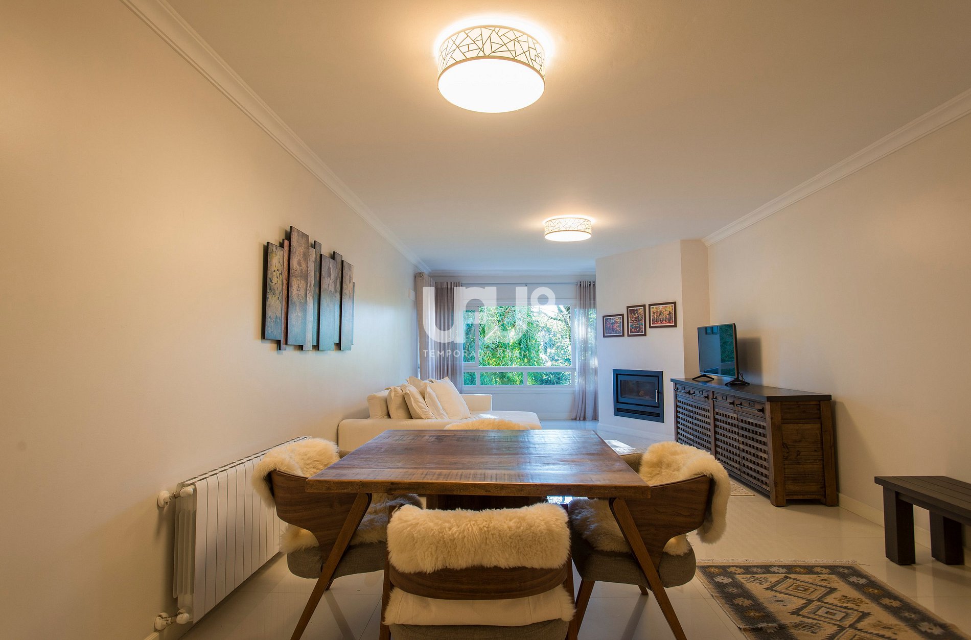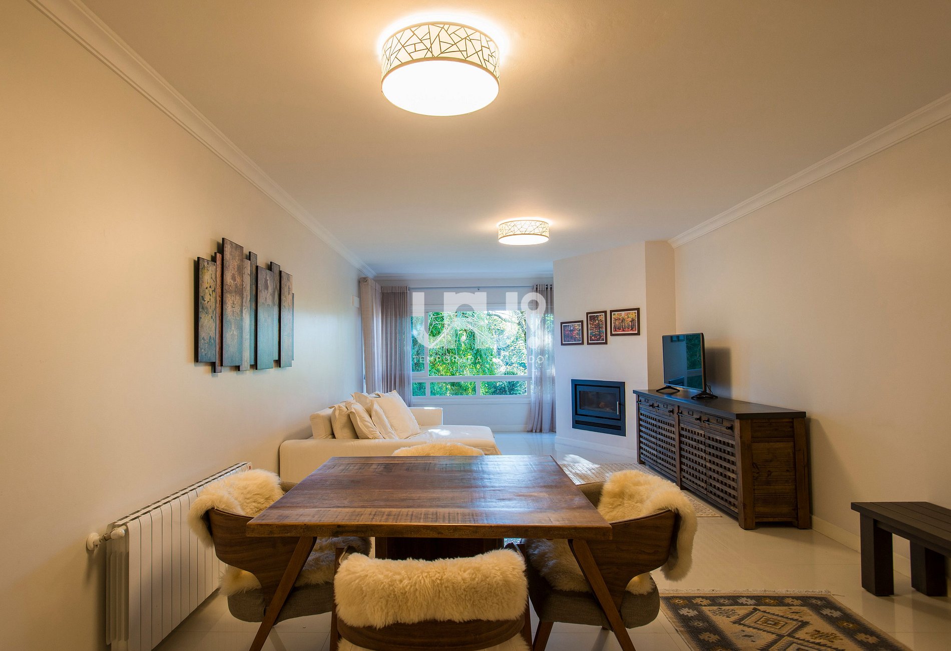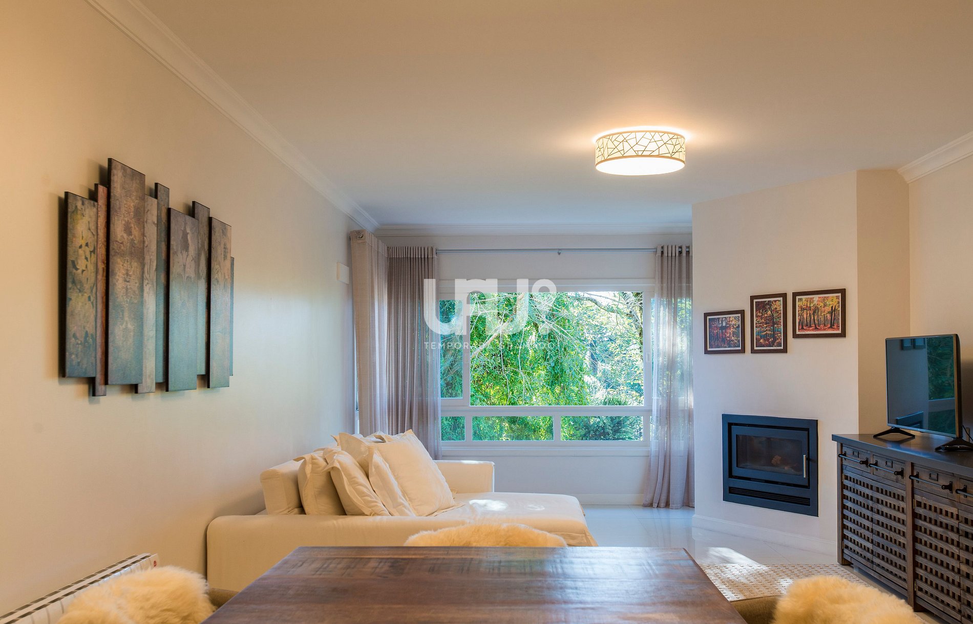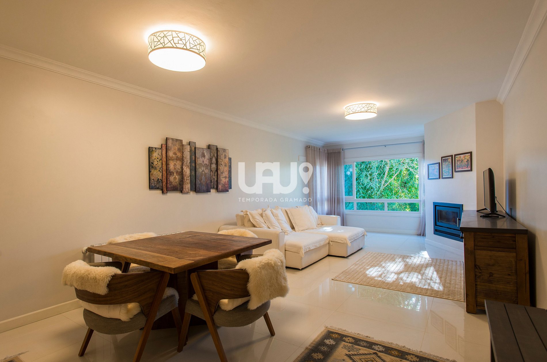 Apartamento com amplo living em dois ambientes, jantar para quatro pessoas, estar com confortável sofá com chaise, SmartTV 50' e linda vista do jardim;