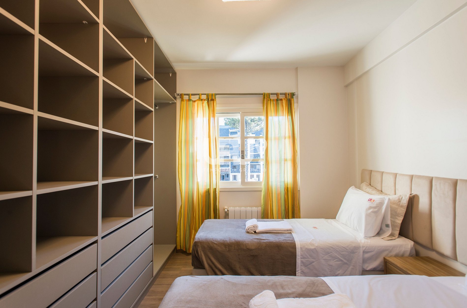 Dormitório com duas camas de solteiro (que unidas formam outra, tamanho Queen Size), cama auxiliar e rouparia (climatizado por aquecedor portátil);