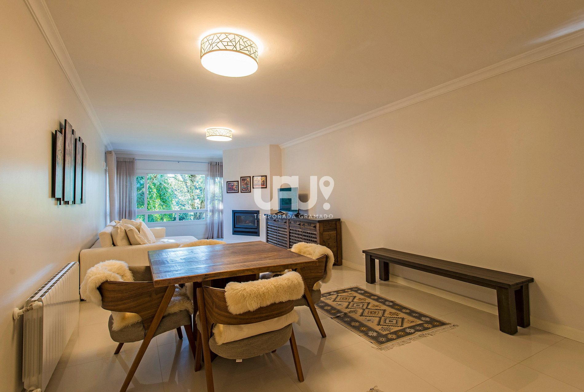 Apartamento com amplo living em dois ambientes, jantar para quatro pessoas, estar com confortável sofá com chaise, SmartTV 50' e linda vista do jardim;