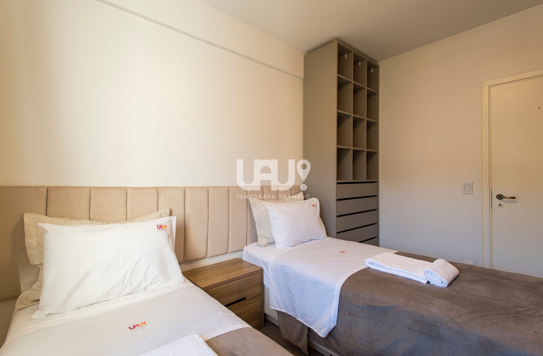 Dormitório com duas camas de solteiro (que unidas formam outra, tamanho Queen Size), cama auxiliar e rouparia (climatizado por aquecedor portátil);