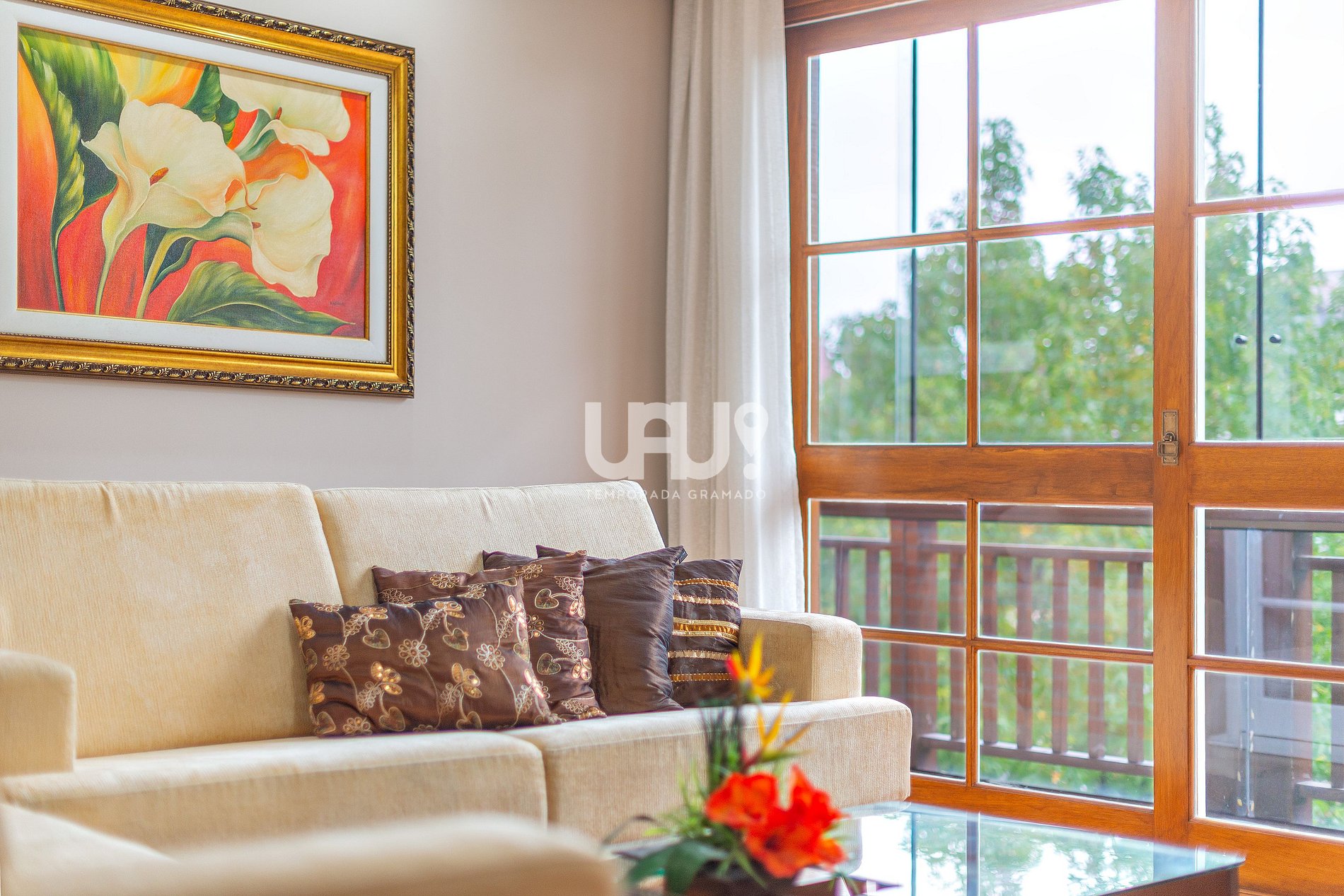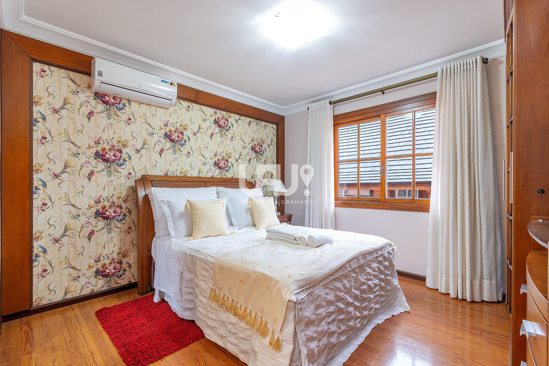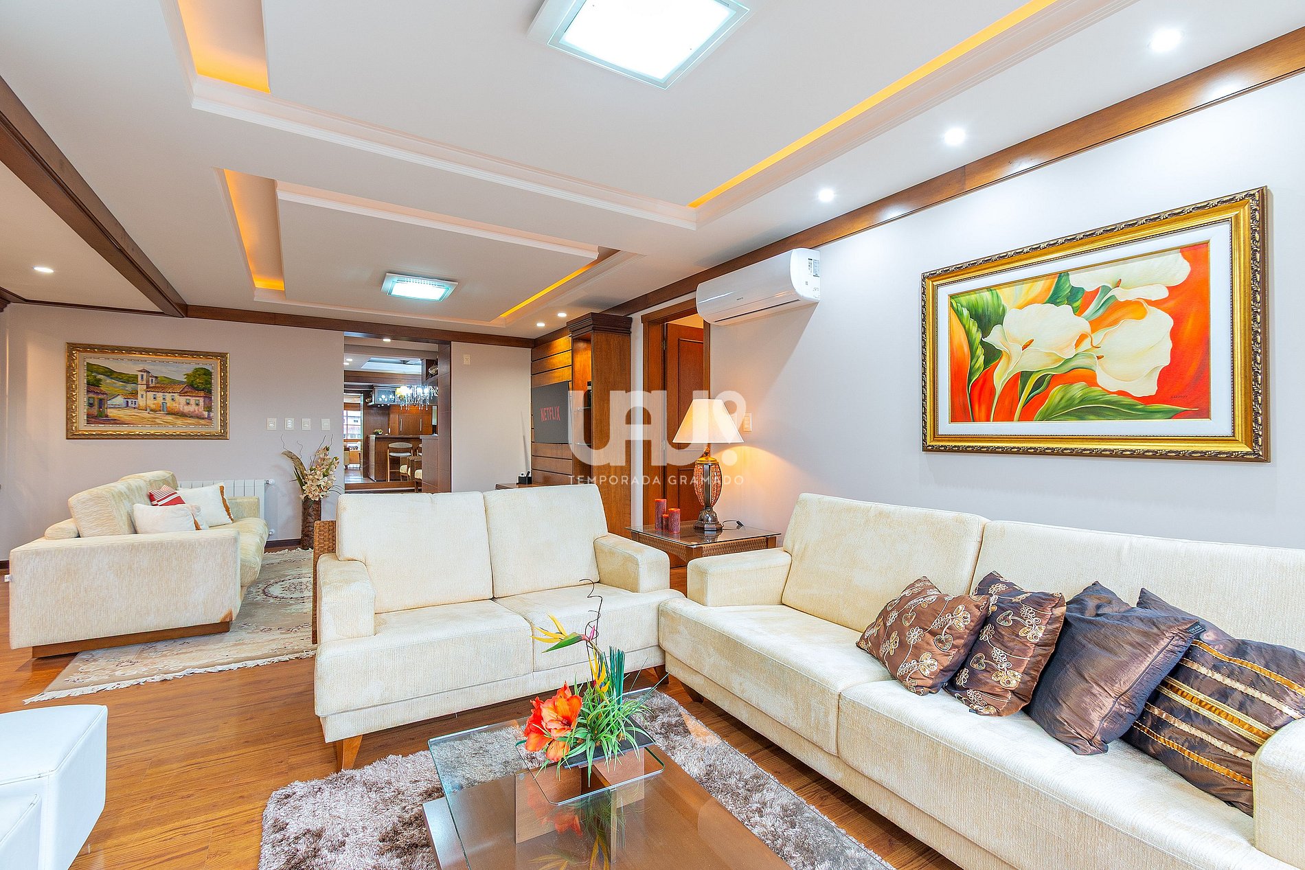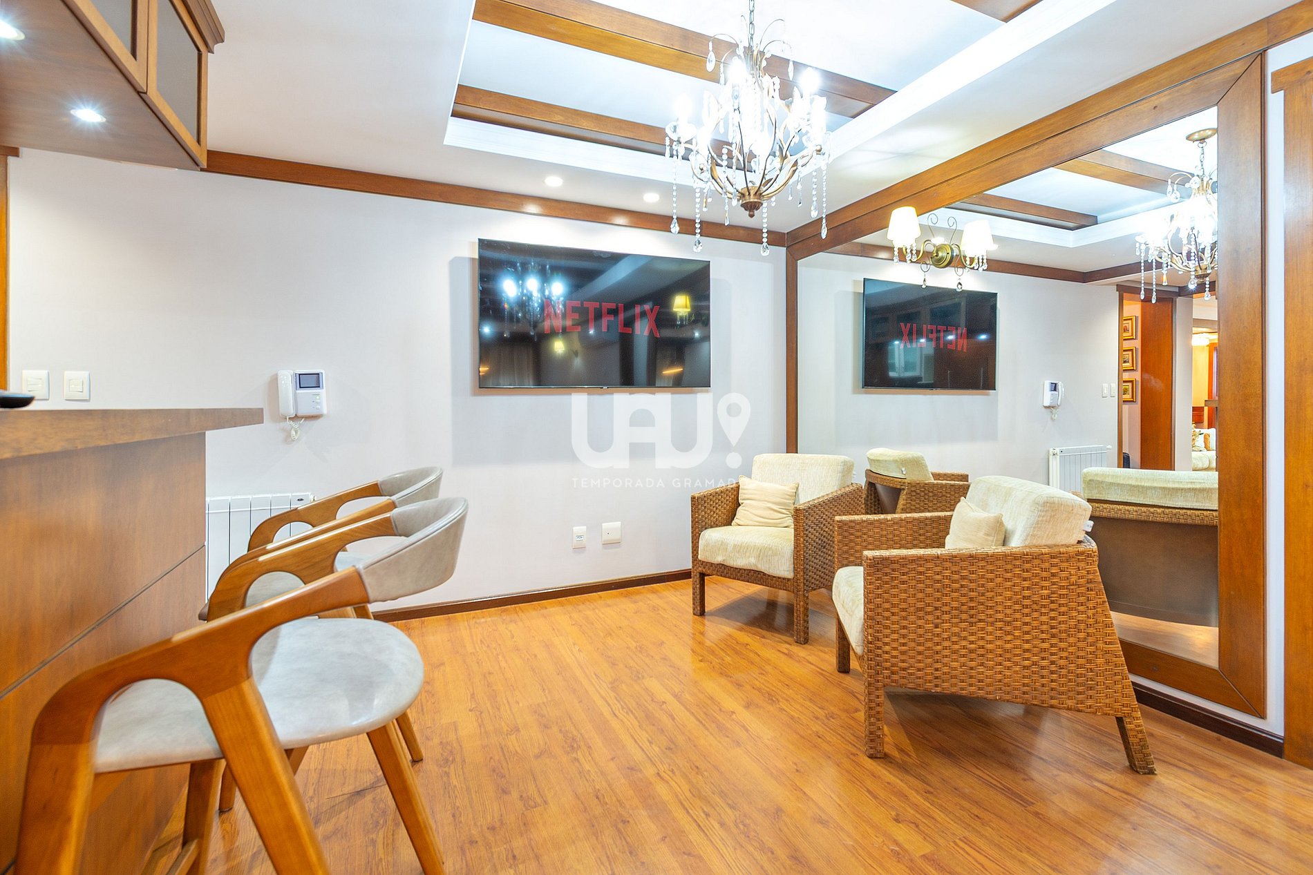 Desse modo, oferecemos acomodações confortáveis para até 16 pessoas, distribuídas em quatro confortáveis suítes, sala de estar em dois ambientes, com lareira, ar condicionado quente e frio e SmartTV 50', varanda com vista para o centro da cidade, sala de jantar para 12 pessoas, bancada alta próxima à churrasqueira, SmartTV 50', ar condicionado quente e frio, anexa à cozinha totalmente equipada, inclusive com churrasqueira a carvão.