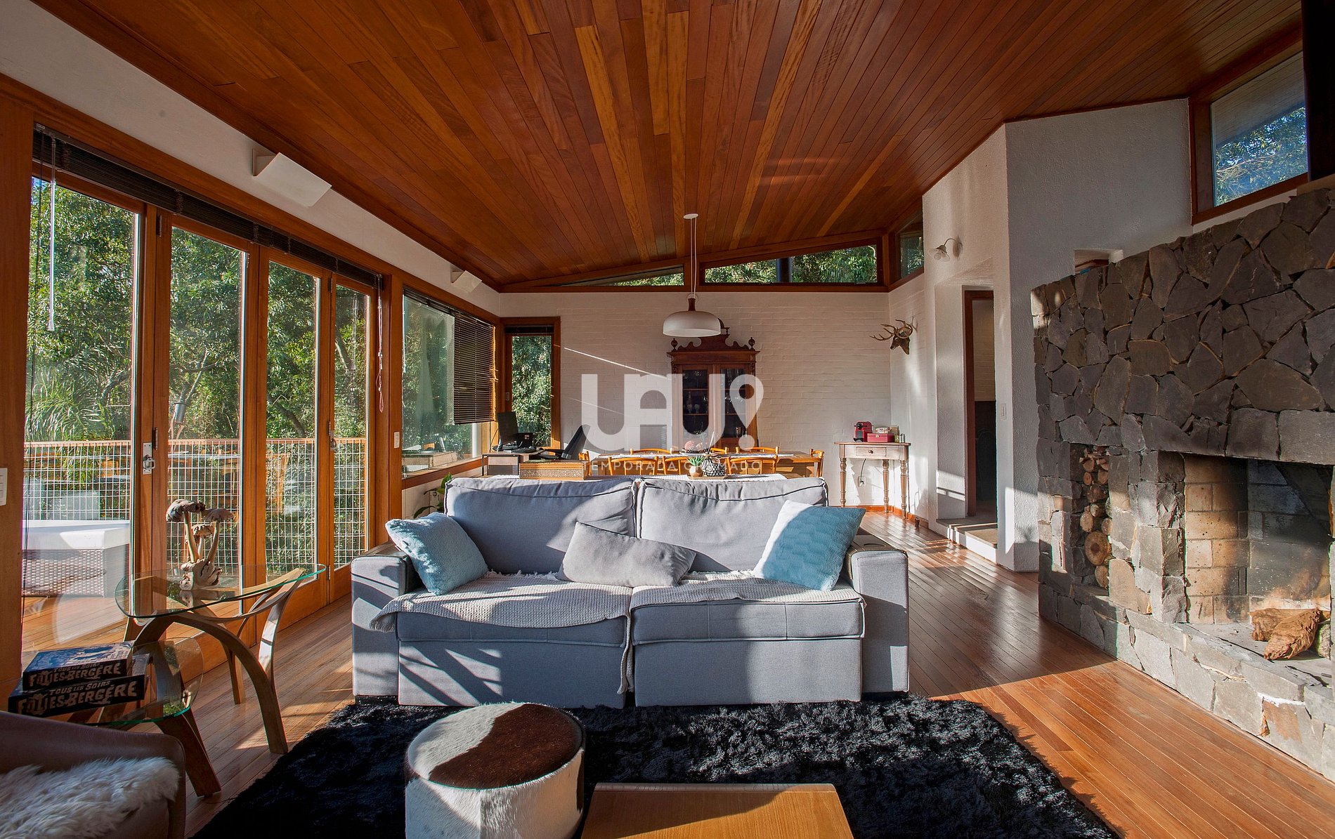 Sala de estar com lareira, integrada ao deck com a mais incrível vista do por do sol da cidade e lavabo...