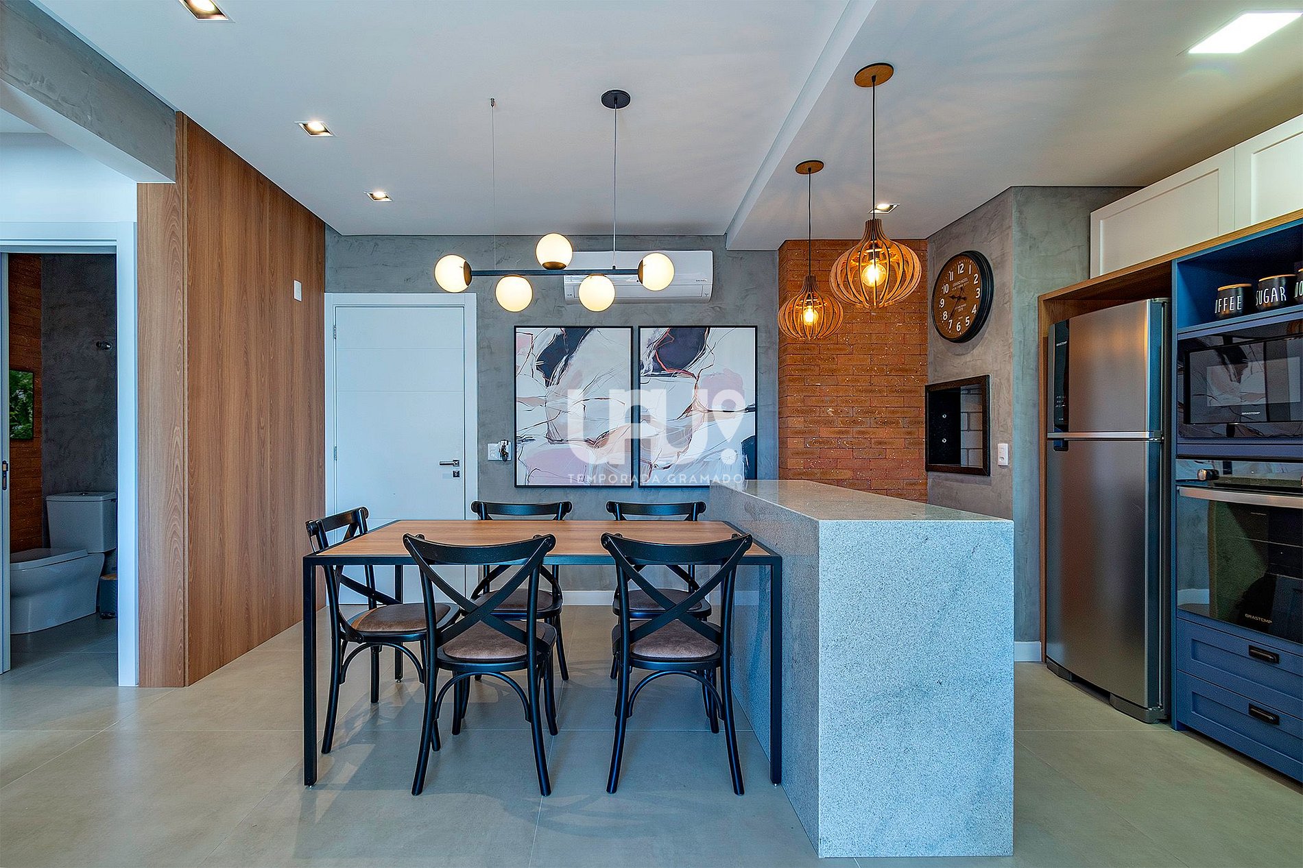 Jantar com mesa para 5 pessoas, bancada de apoio à churrasqueira integrada à cozinha, totalmente equipada;