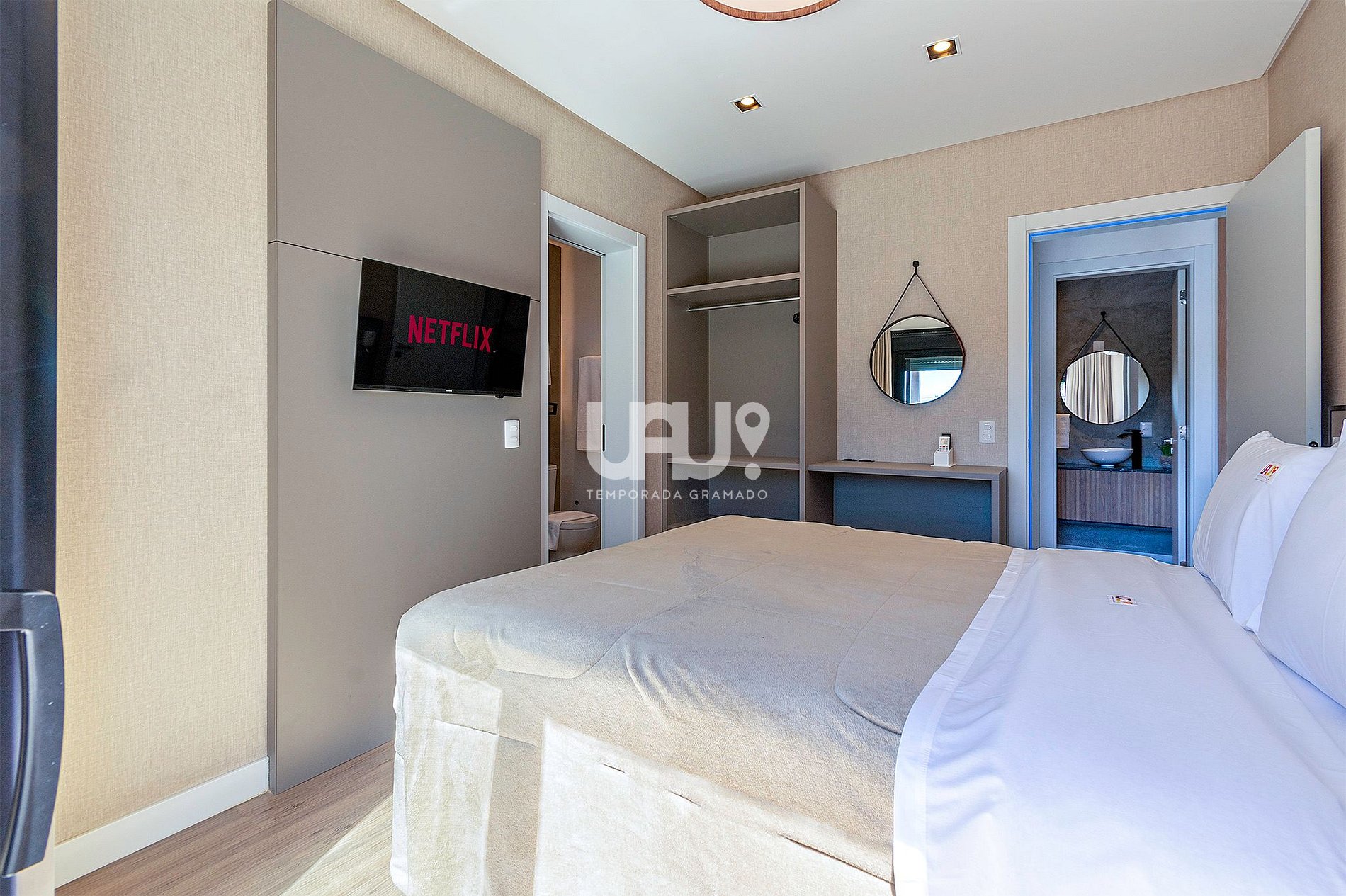 Suíte com cama Queen Size, duas camas auxiliares, SmartTV 32', rouparia completa e ar condicionado quente e frio;