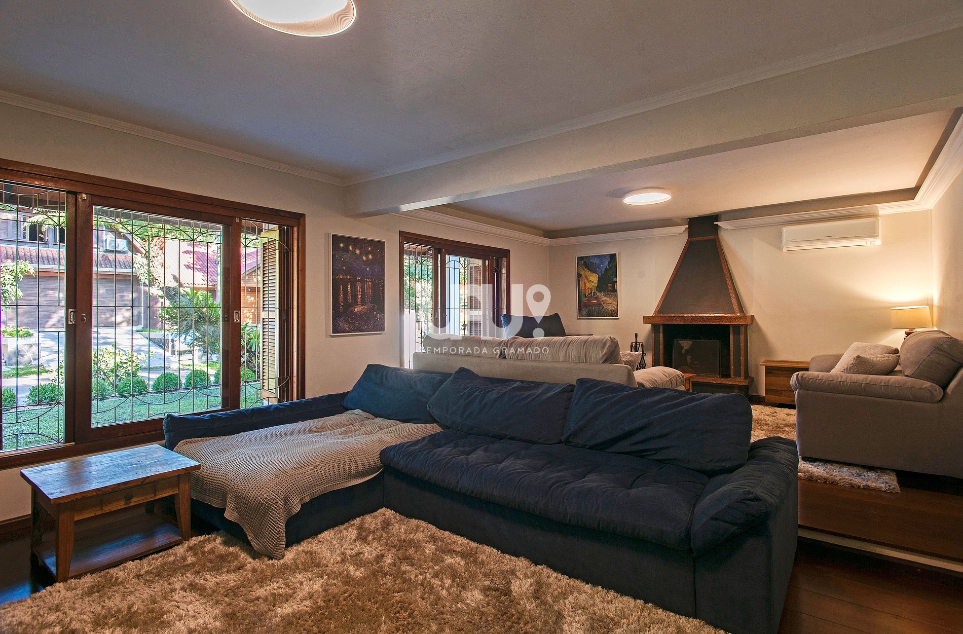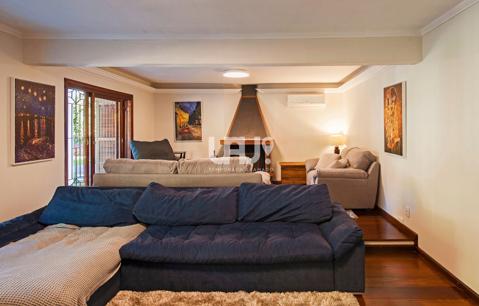Living em dois ambientes, com sala de TV (smarTV 50') e sala de estar, com lareira;