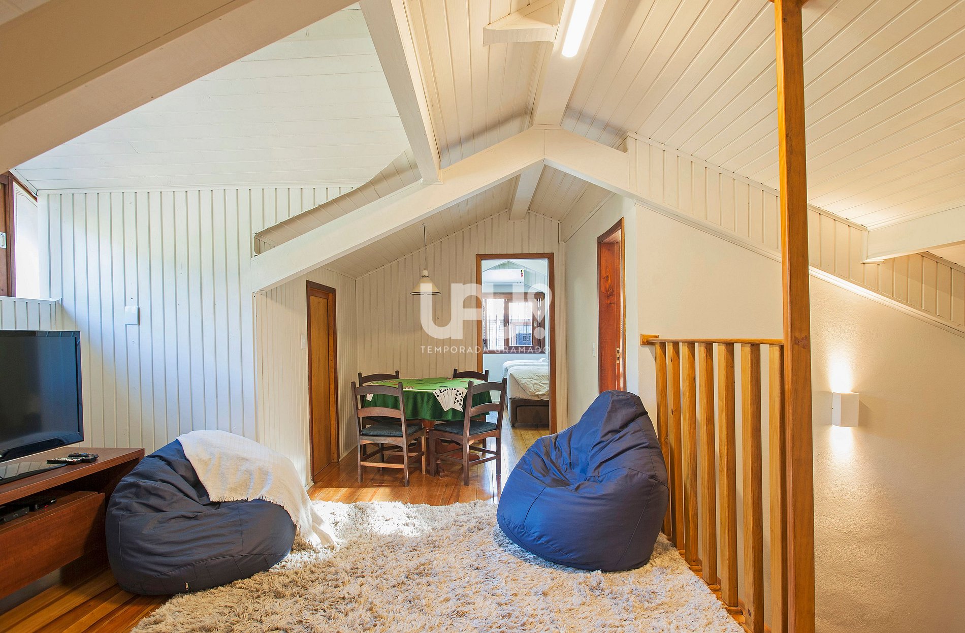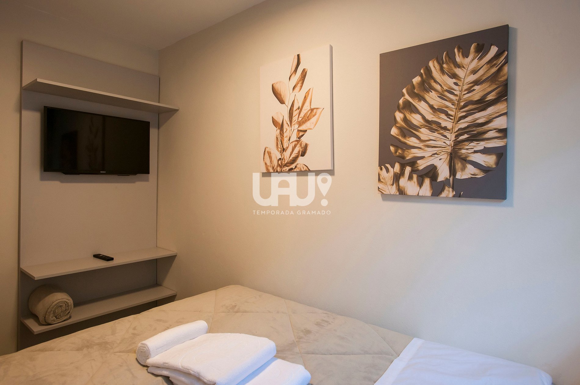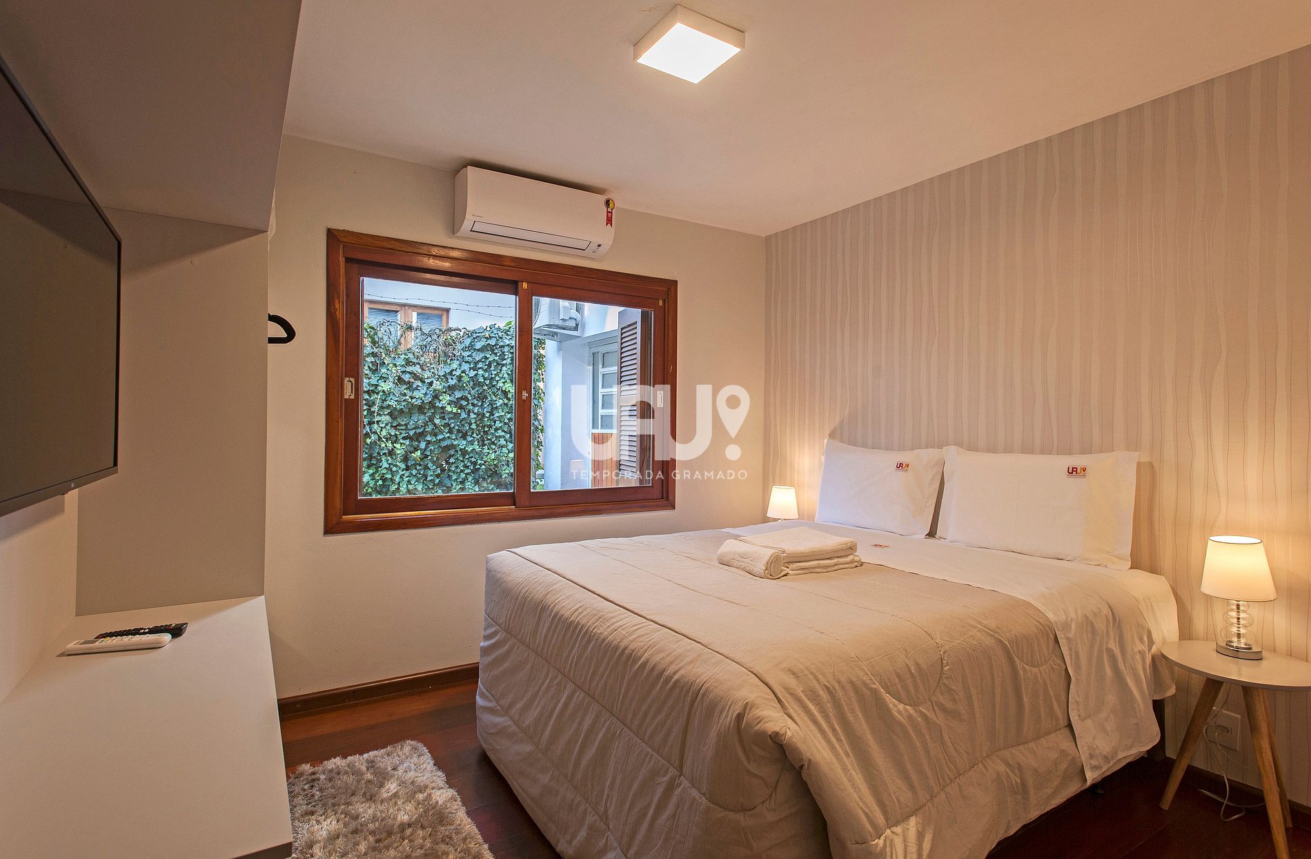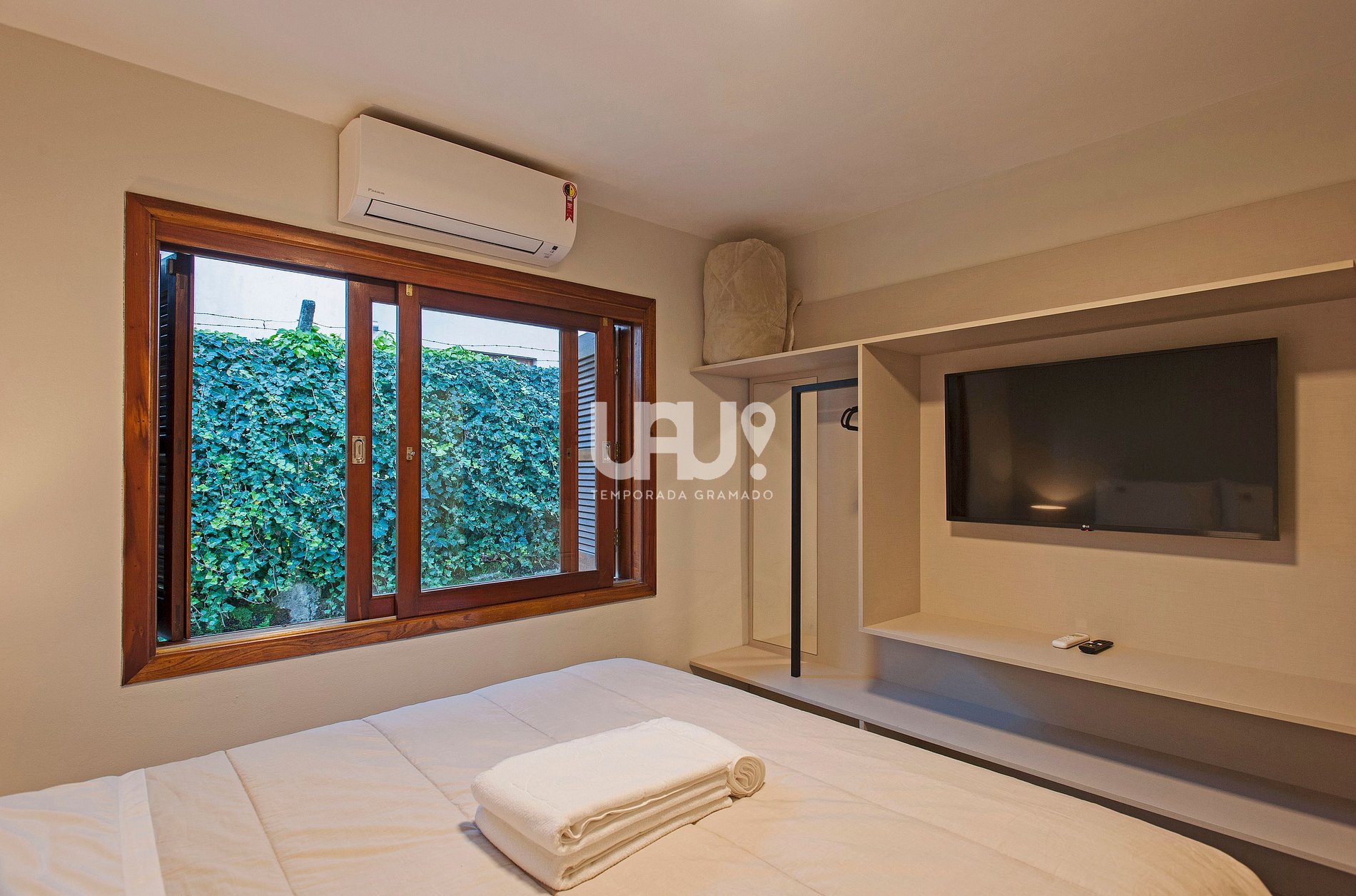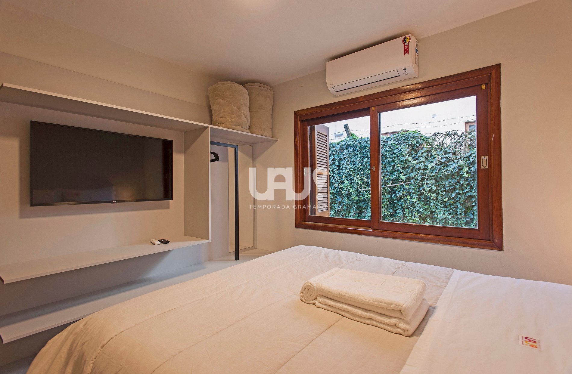 Dormitório com cama Queen Size, duas camas auxiliares e rouparia completa;