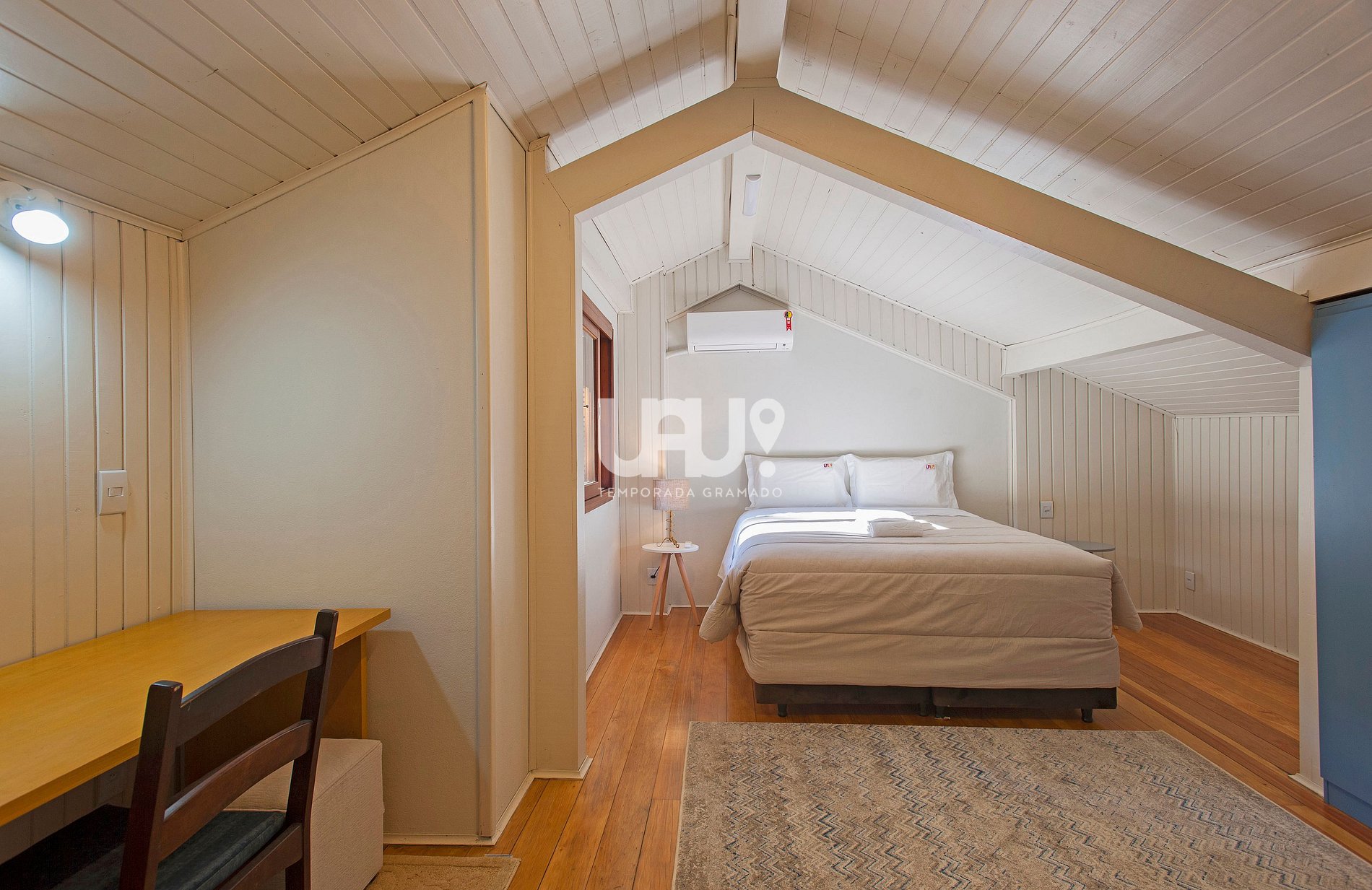 Suíte com cama Queen Size, duas camas auxiliares e rouparia completa, além de escritório para trabalho/estudo e banho completo;