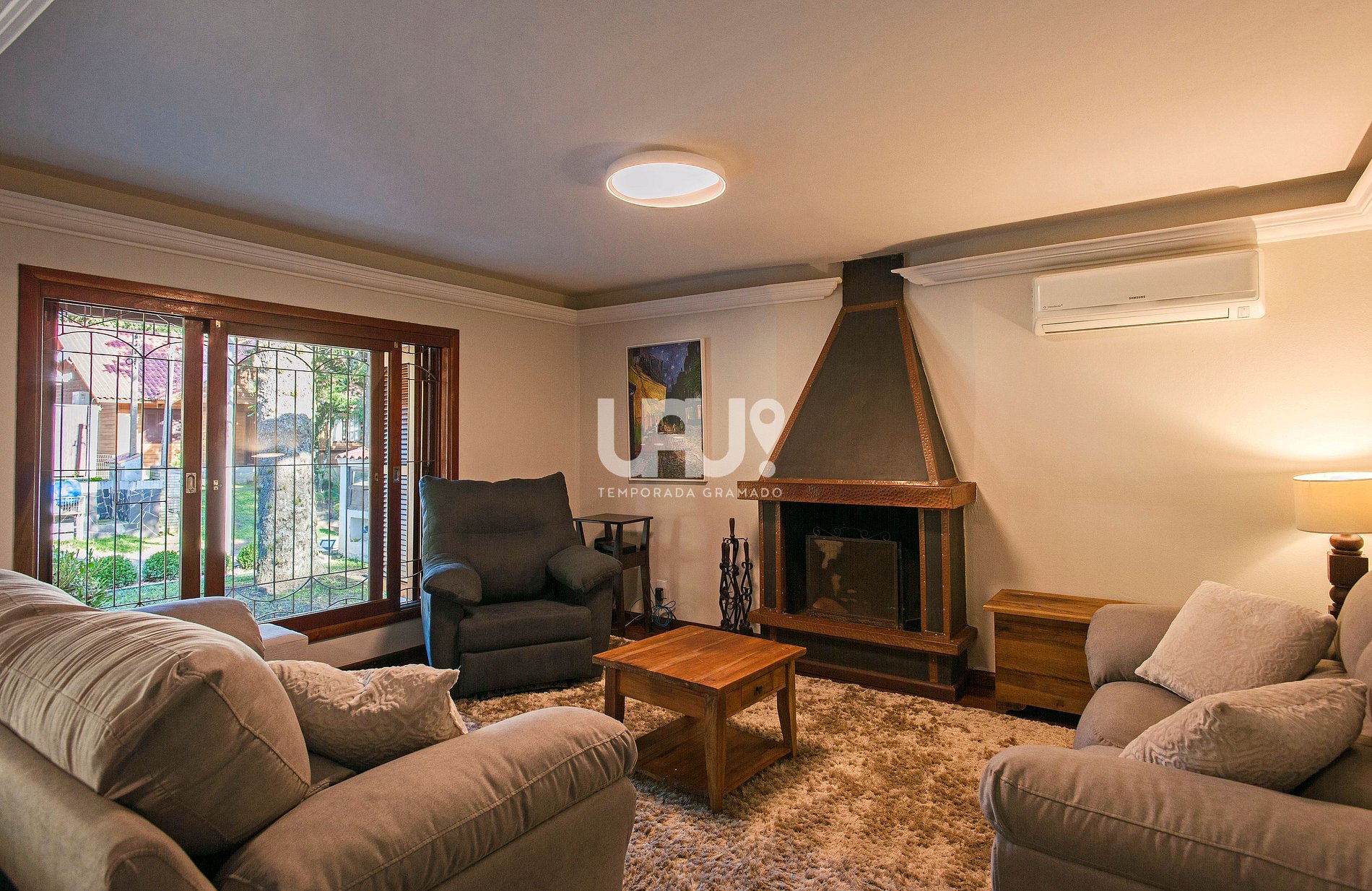 Living em dois ambientes, com sala de TV (smarTV 50') e sala de estar, com lareira;