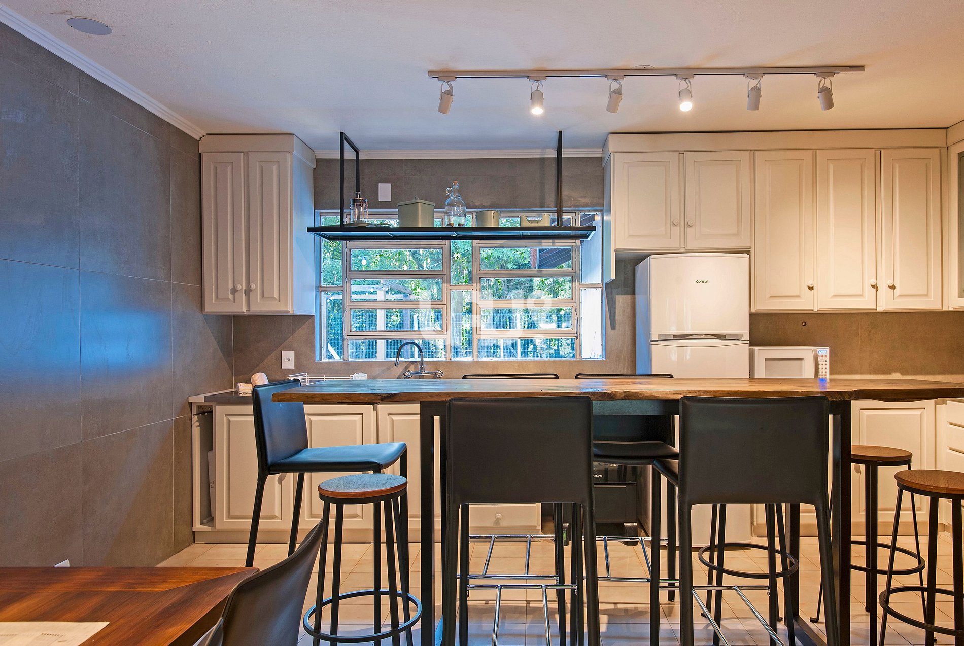 Cozinha completa em estilo americano, com todos os utensílios e eletrodomésticos e mesas de jantar para grandes grupos;