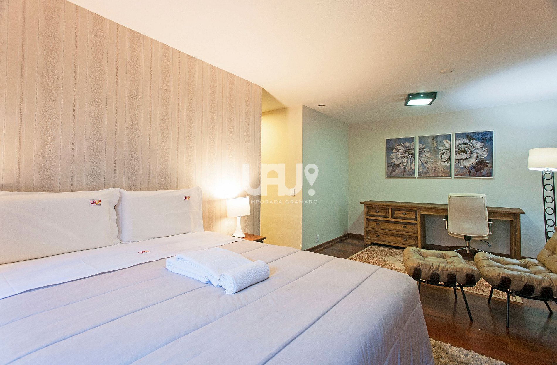 Suíte com cama Queen Size, duas camas auxiliares e rouparia completa, além de escritório para trabalho/estudo e banho completo;