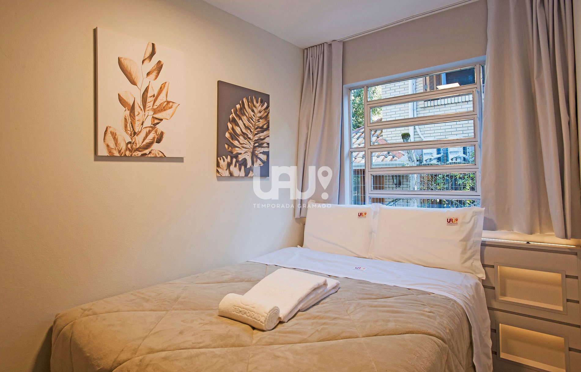 Dormitório com cama Queen Size, duas camas auxiliares e rouparia completa;