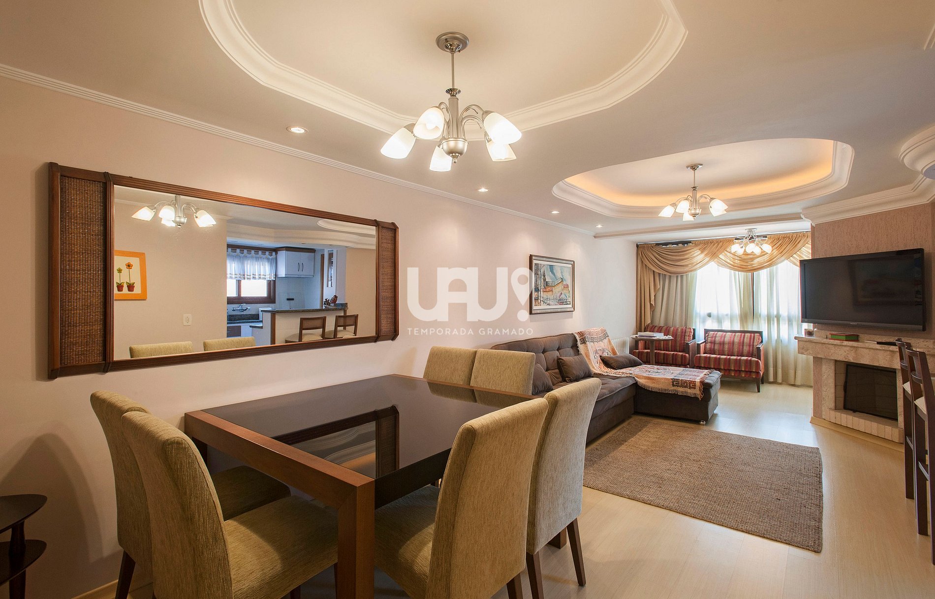 Exuberante Cobertura com 3 dormitórios, sendo uma suíte, no coração de Gramado, a menos de 100m da Rua Coberta. Amplo living com com sala de estar, jantar para 6 pessoas, confortável sofá cama, churrasqueira e lareira;