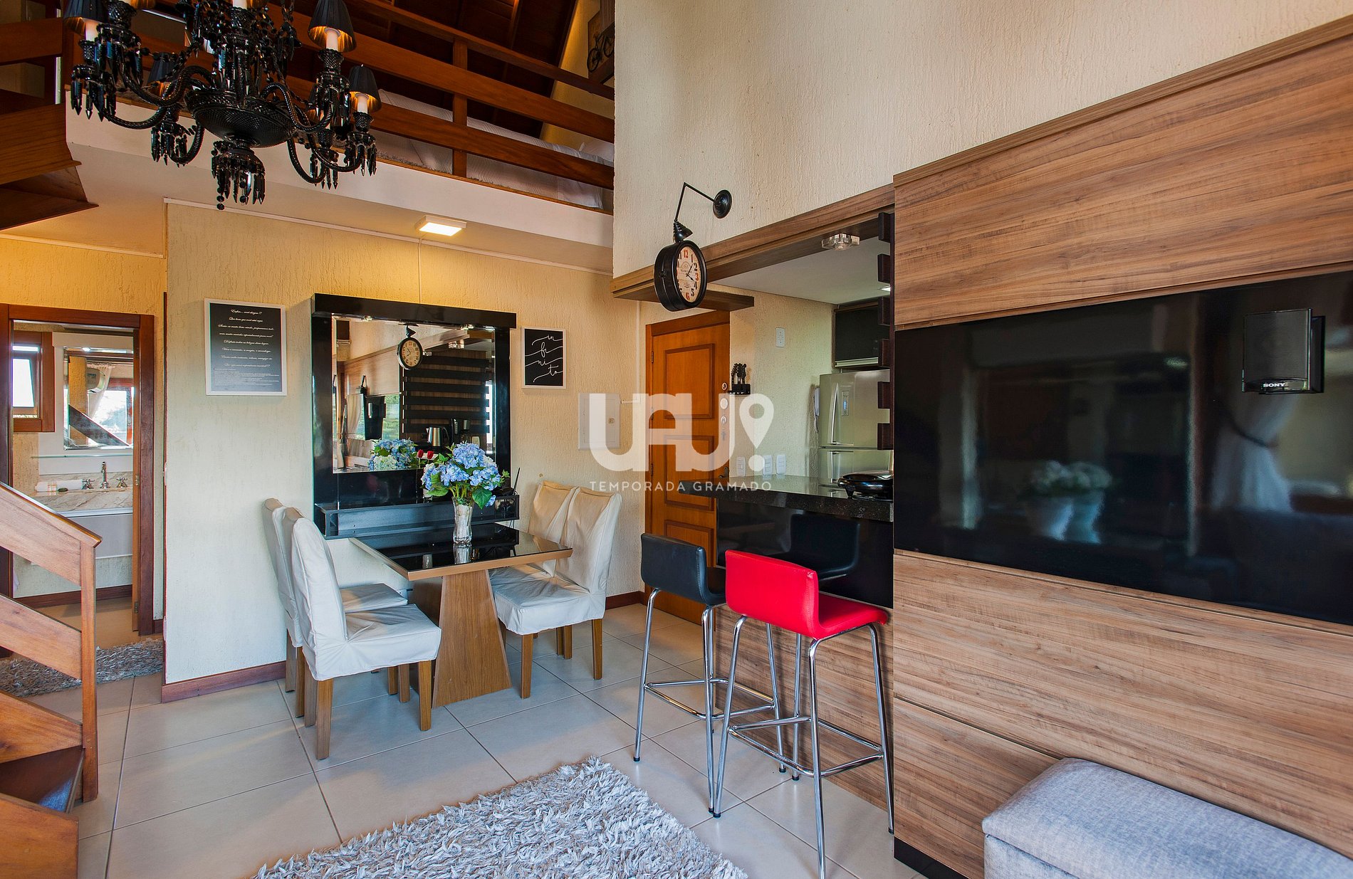 Cobertura Duplex totalmente mobiliada e equipada, em Condomínio fechado , próximo ao centro. Living em 2 ambientes com lareira, sala de estar/TV, cozinha completa/lavanderia; Demi-suíte com 2 camas de solteiro e puff que se transforma em cama de solteiro; Banho Social; Suíte com cama King Size; Cobertura com cama de Casal, puff que se transforma em cana de casal e banho completo; Wi-Fi; 2 garagens.