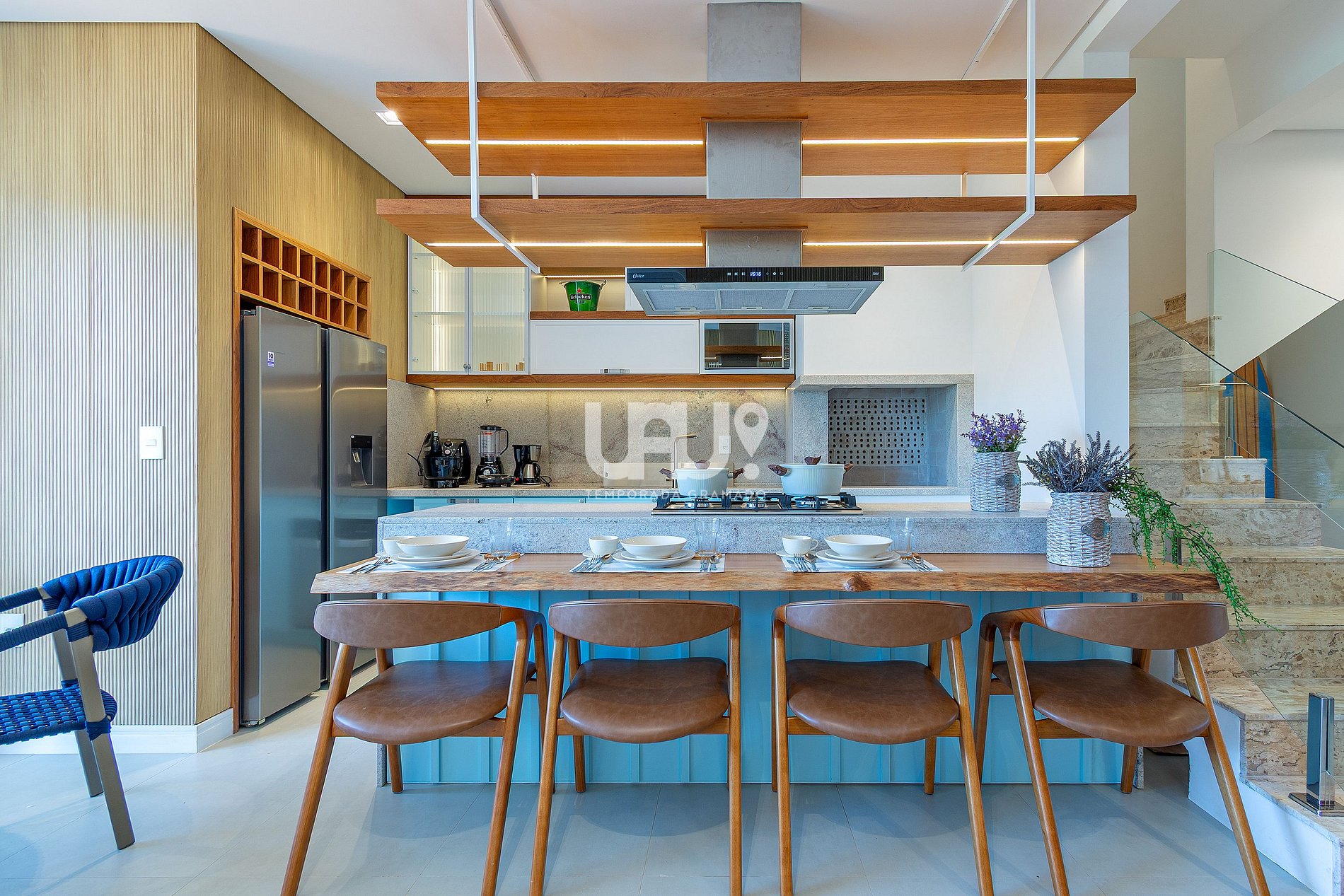 Bancada ampla e ilha, perfeita para cozinhar com conforto ou servir petiscos em clima de happy hour;