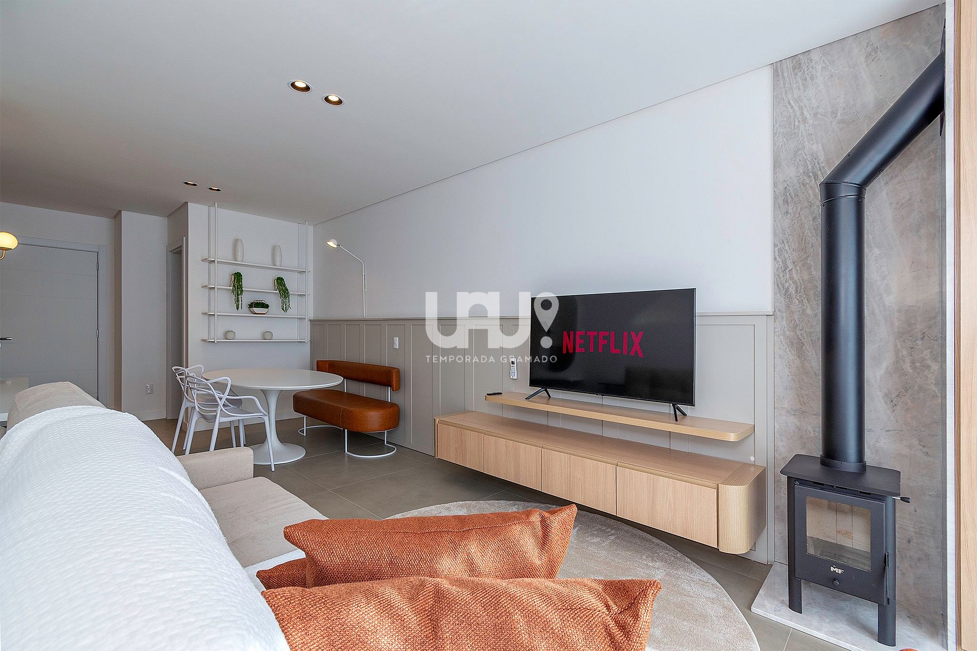 Living em dois ambientes SmartTV 55’, sofá cama, split q/f, lareira/estufa à lenha e mesa de jantar para até 6 pessoas;