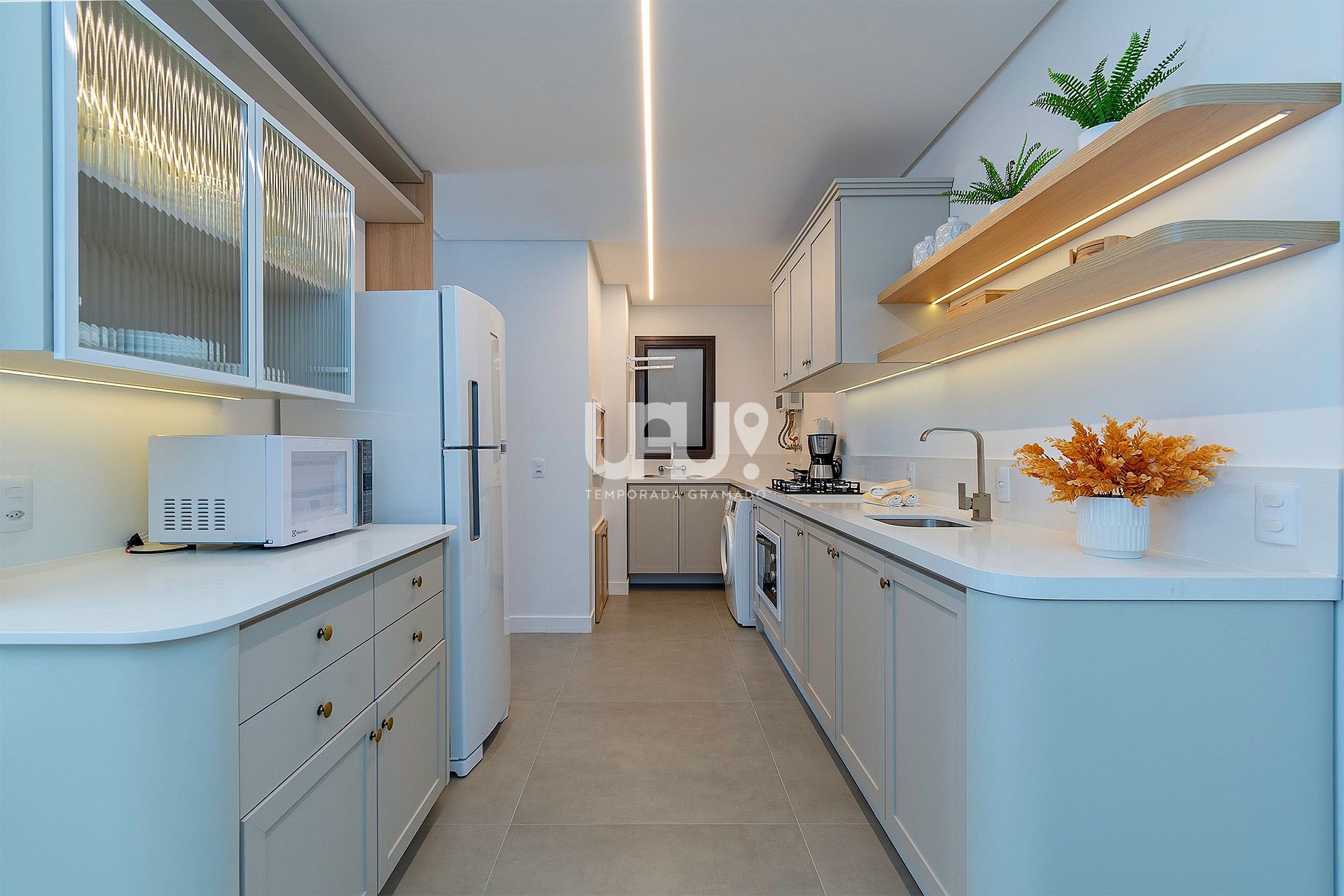 Cozinha completa, com churrasqueira e lavanderia com máquina lava e seca;