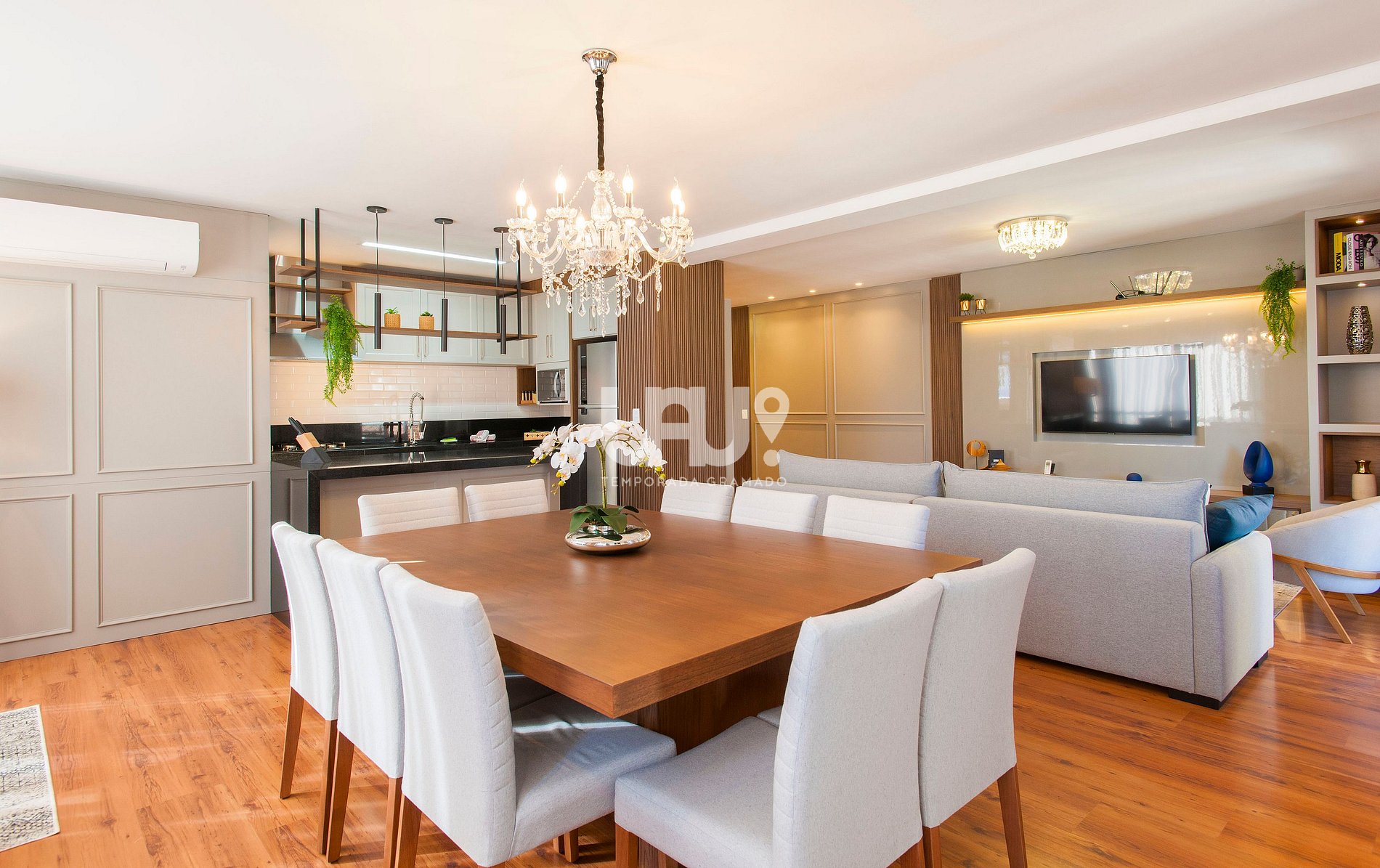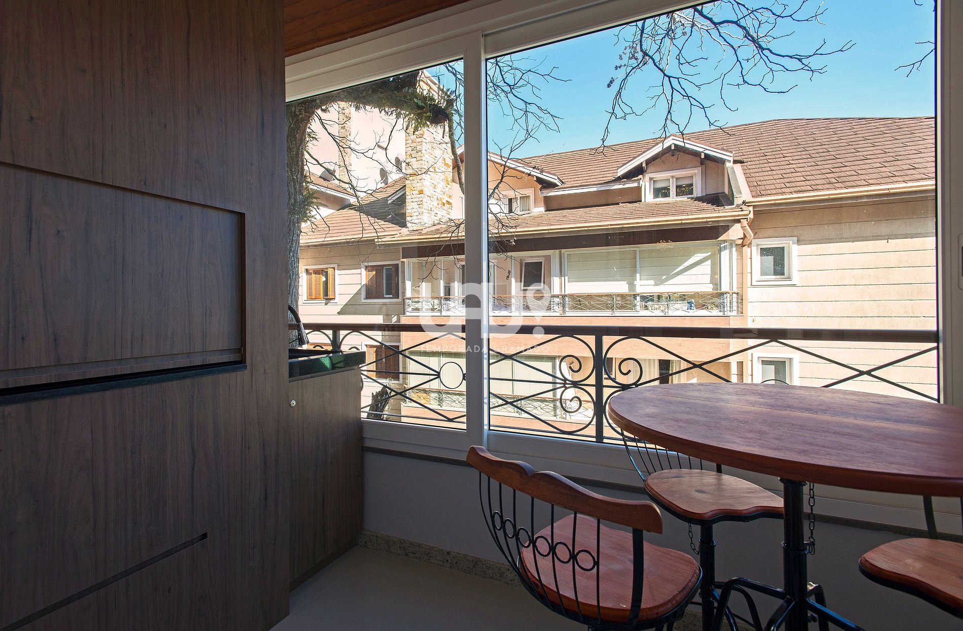 Living em três ambientes com hall de entrada, sala de estar/TV com SmartTV 60', jantar para 10 pessoas, área de leitura e bancada integrada à cozinha, em estilo americano. Adega climatizada, split quente e frio e estufa à lenha. Sacada integrada, com churrasqueira;