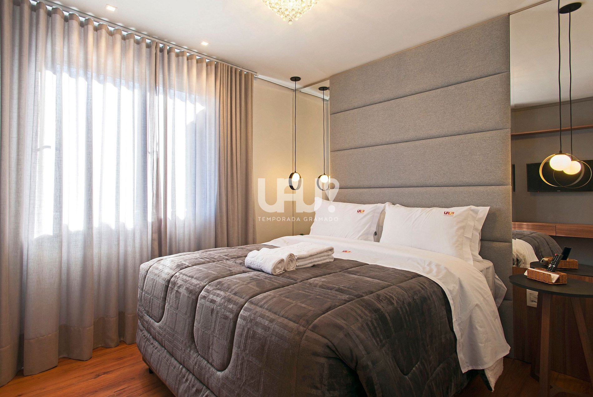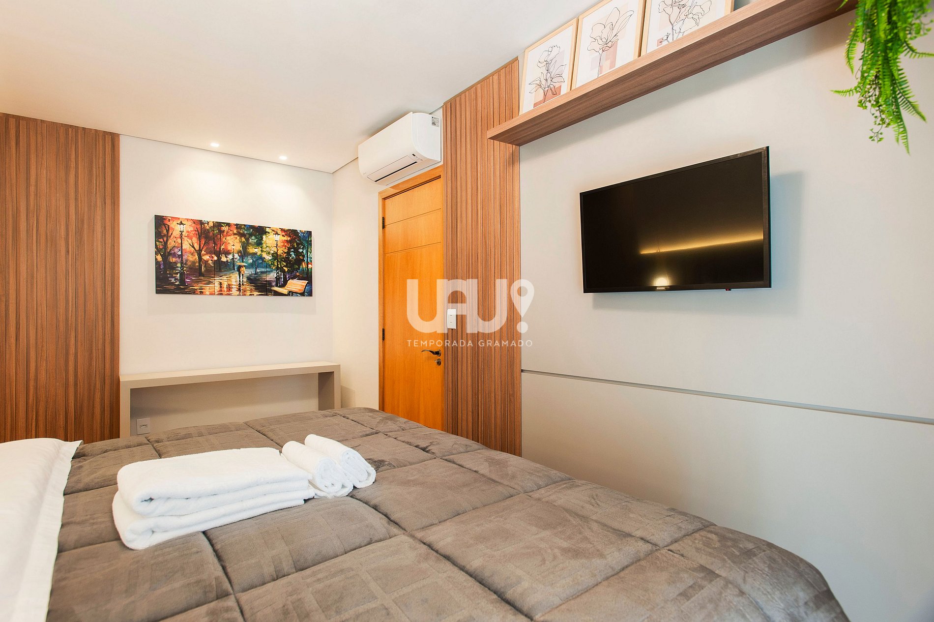 Suíte principal com cama King Size, duas camas auxiliares, split quente e frio, SmartTV 32', closet e sacada fechada, além de banho completo;
