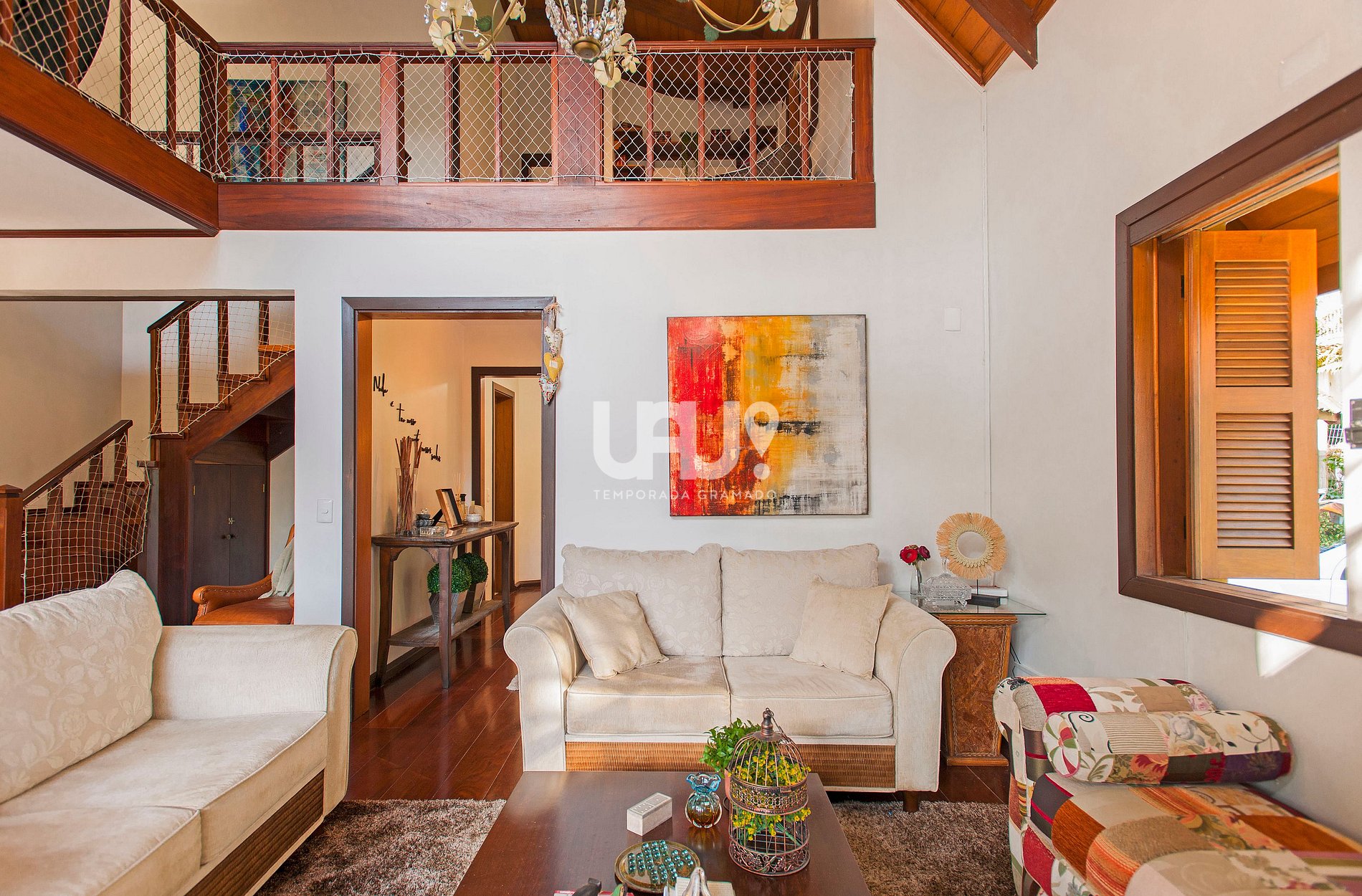 Living em dois ambientes: sala de estar com lareira, mesa jantar para 8 pessoas, ar condicionado quente e frio e SmartTV 50';