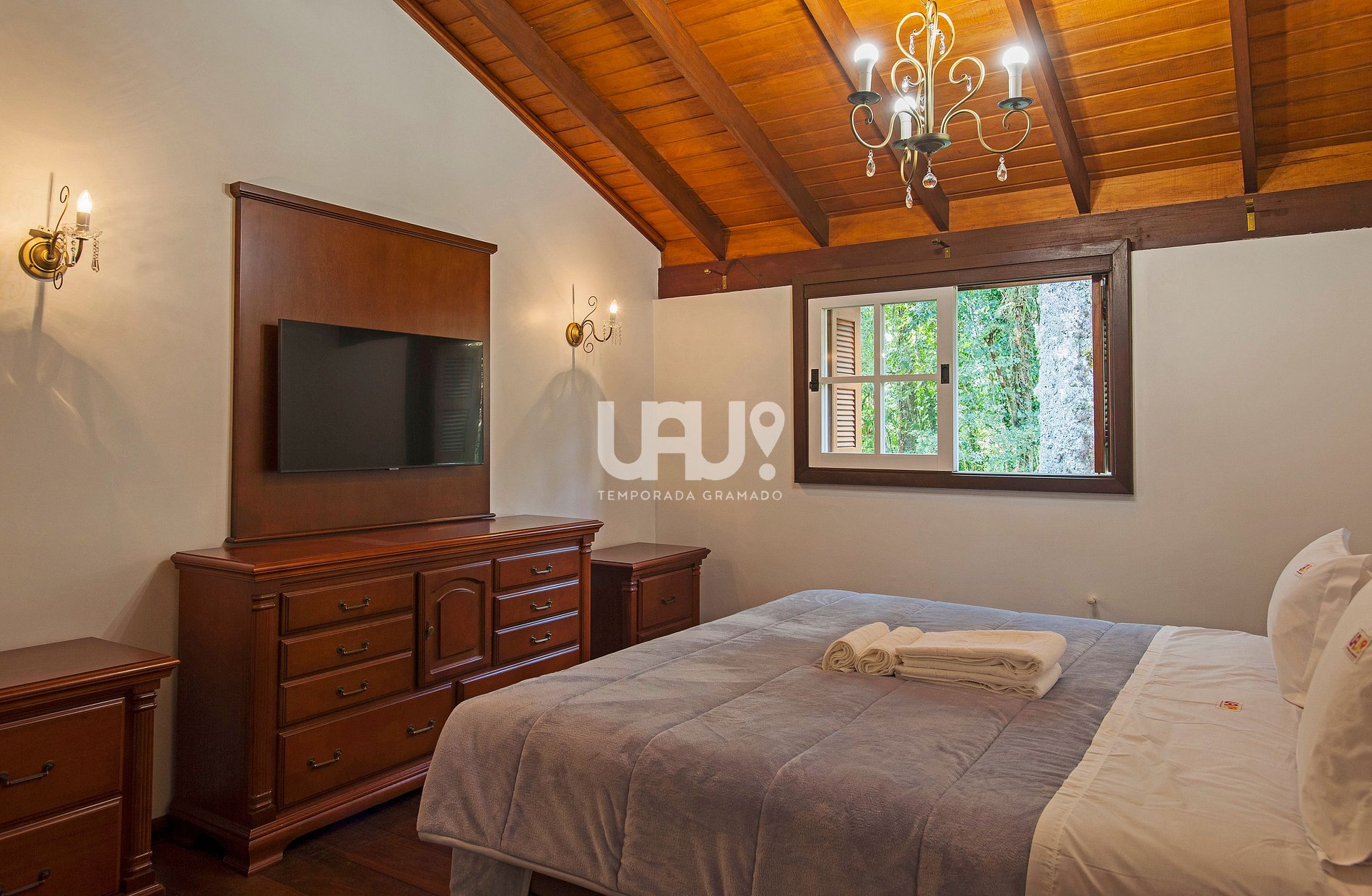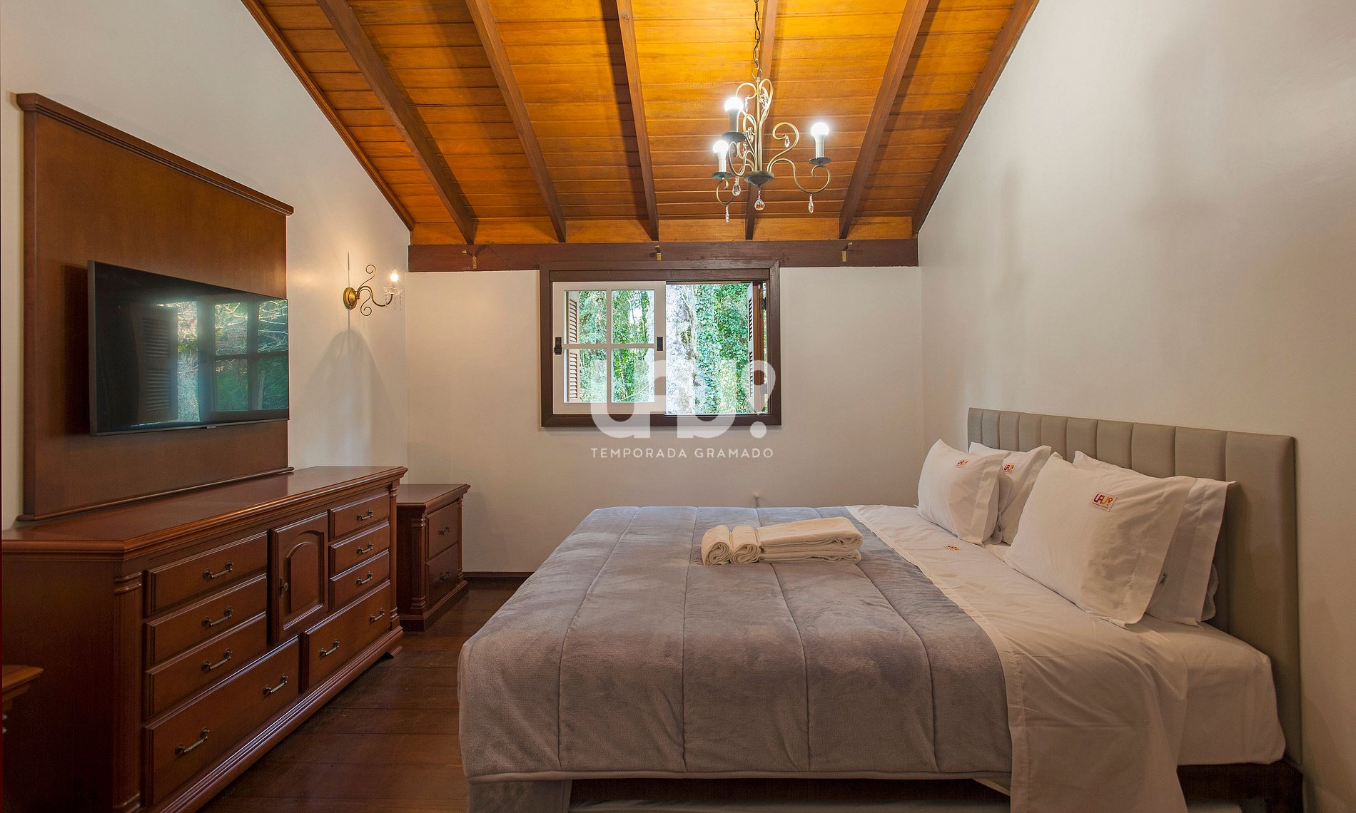 Suíte com cama Queen Size, duas camas auxiliares, SmartTV 50', ar condicionado quente e frio, closet e banho completo, com banheira de hidromassagem;