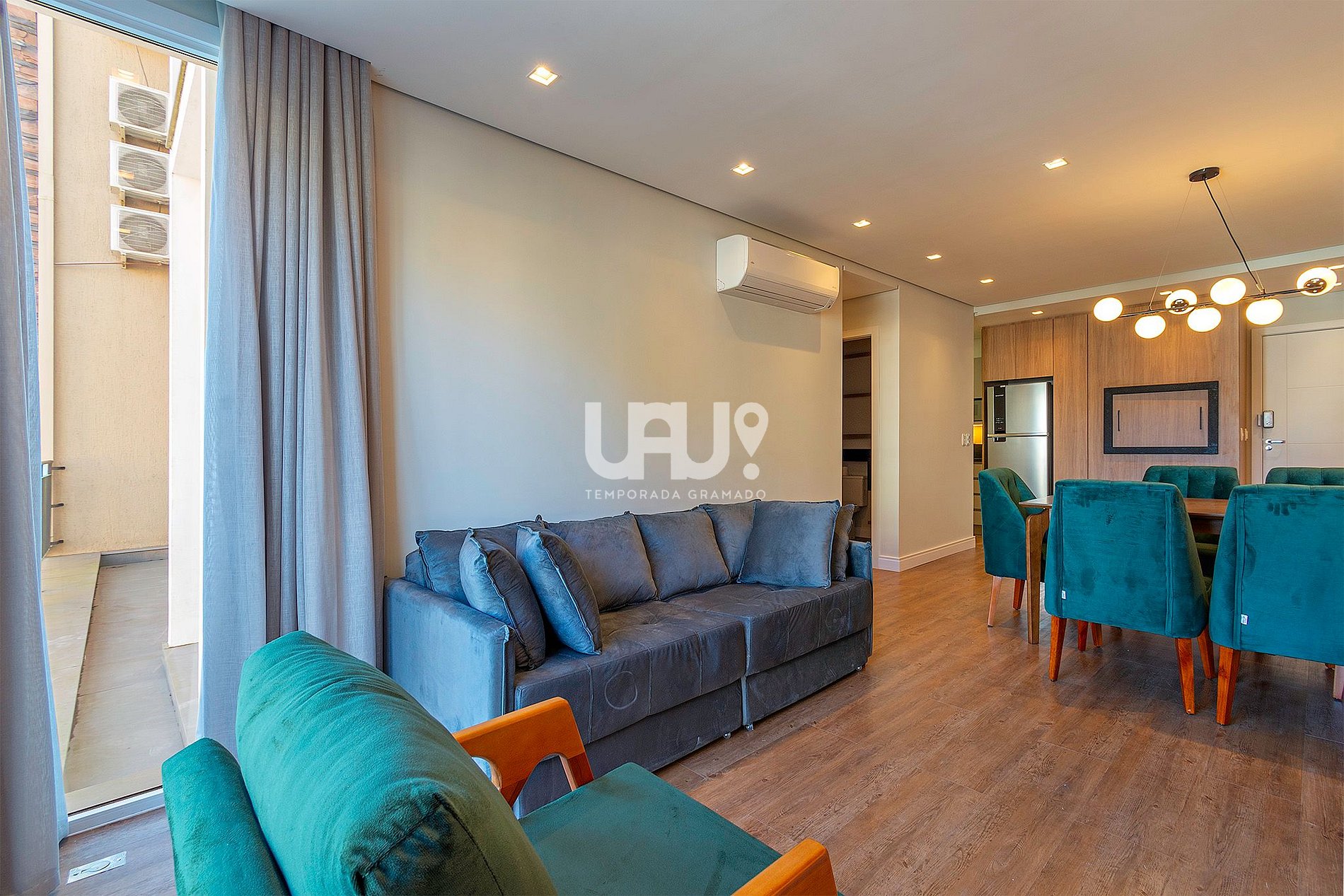 Living em 2 ambientes com jantar para 4 pessoas, confortável sofá cama, SmartTV 60' e split quente e frio;