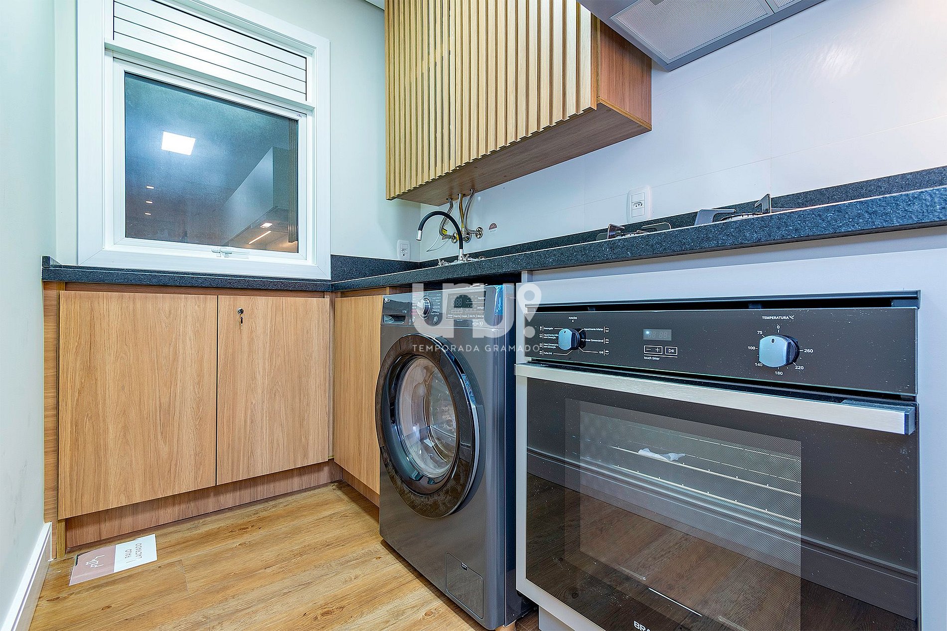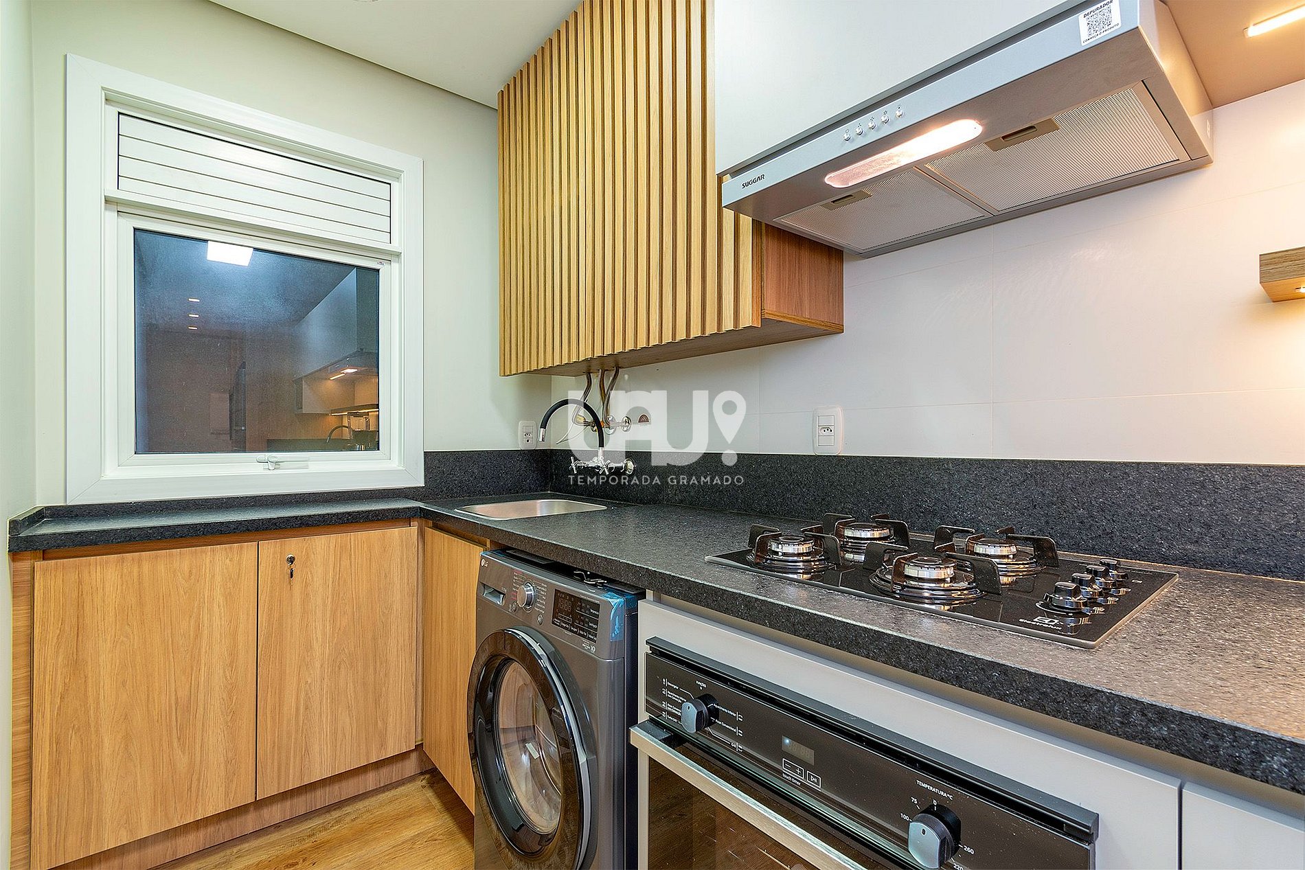 Cozinha completa em estilo americano, com churrasqueira, lavanderia com máquina lava e seca e lavabo.