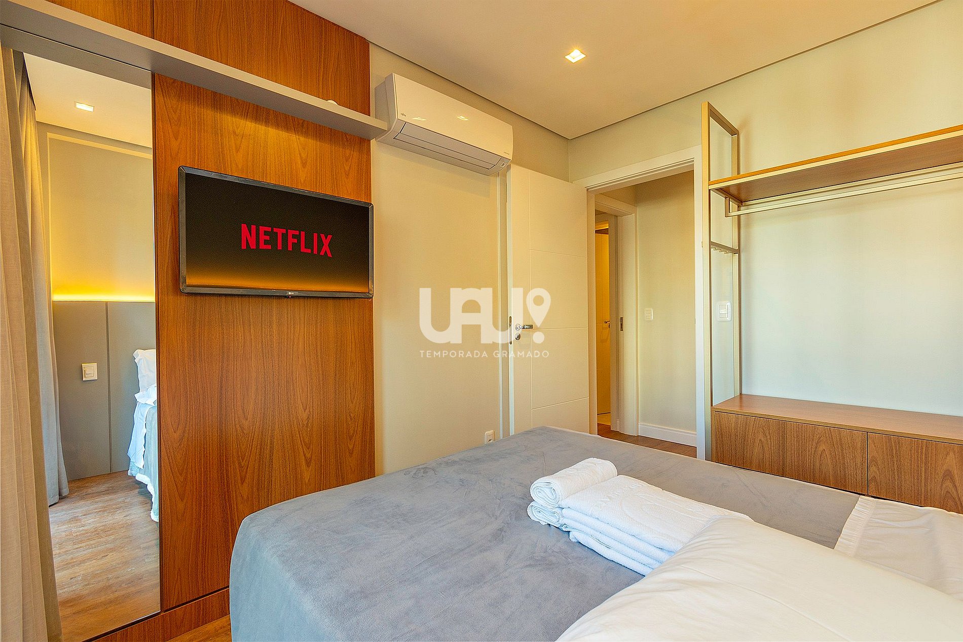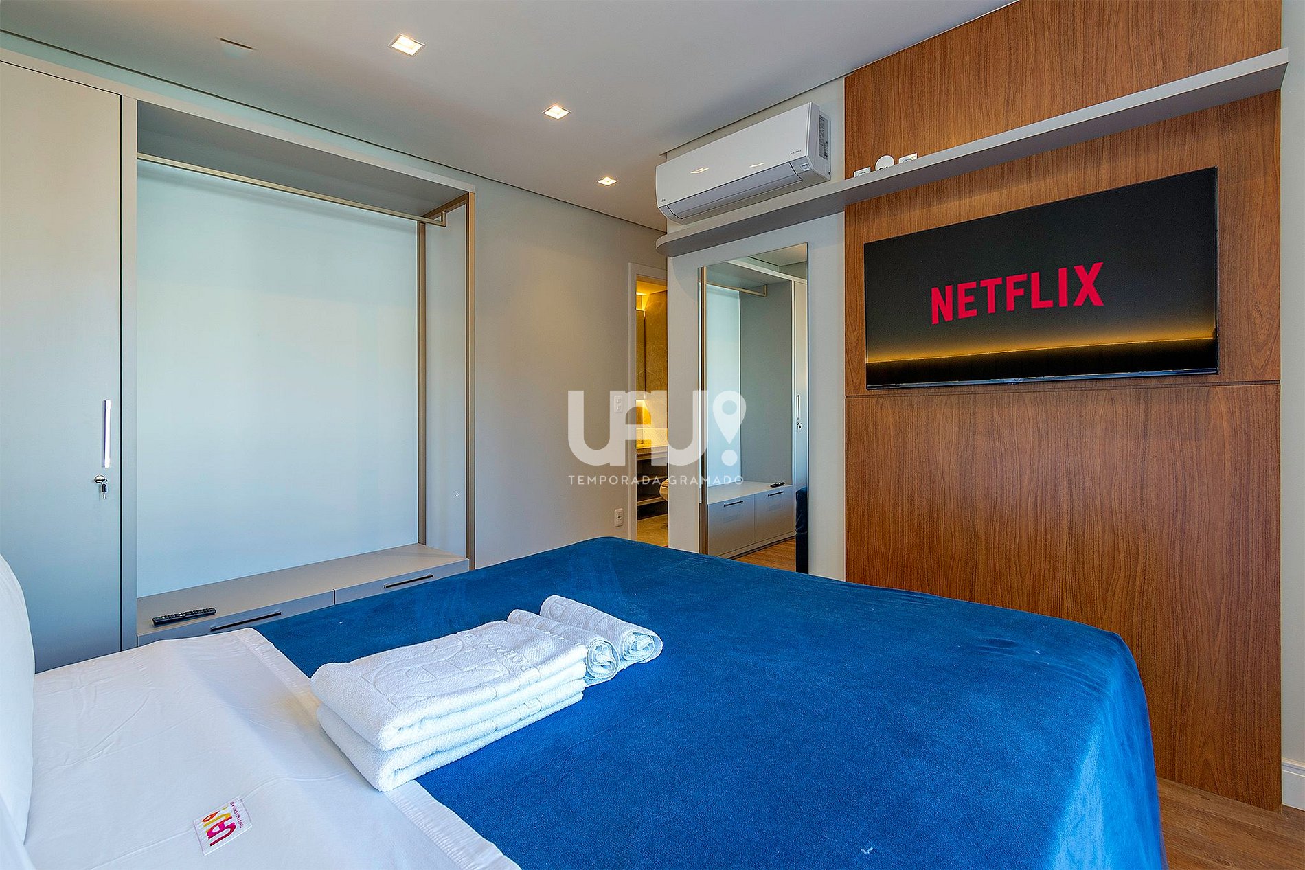 Suíte com cama Queen Size e duas camas auxiliares, rouparia completa, split quente e frio e smartTV; banho completo;