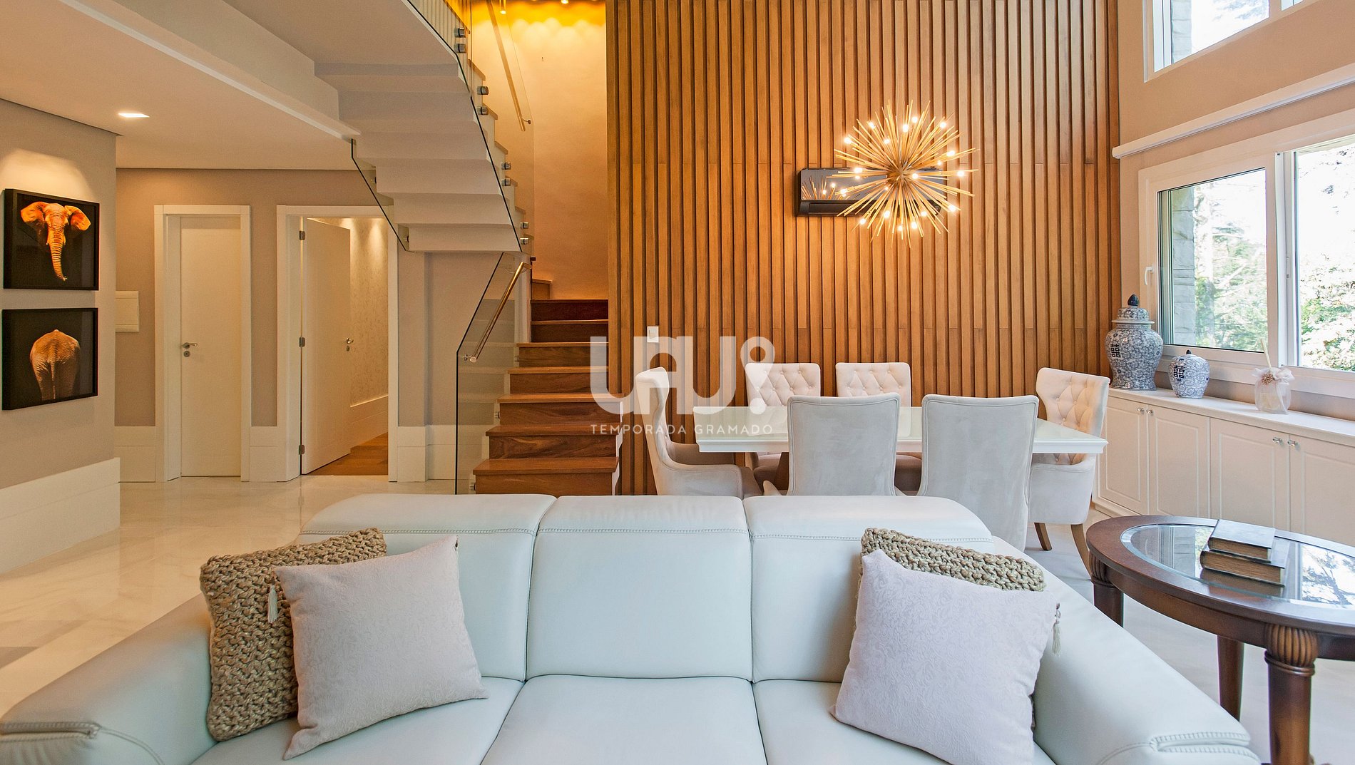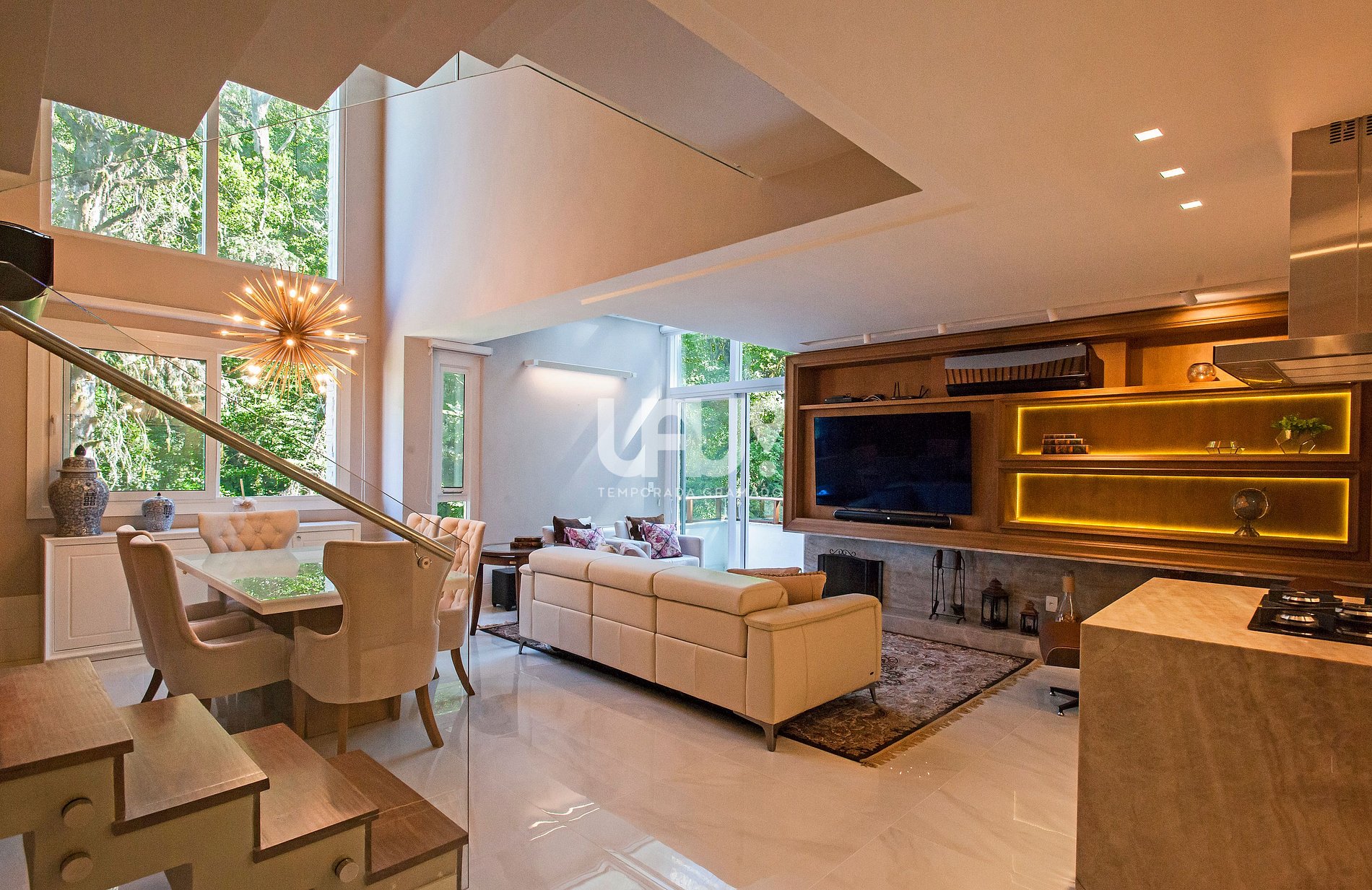 Living com pé direito duplo, jantar e estar decorados com sofisticação, climatização para inverno e verão...