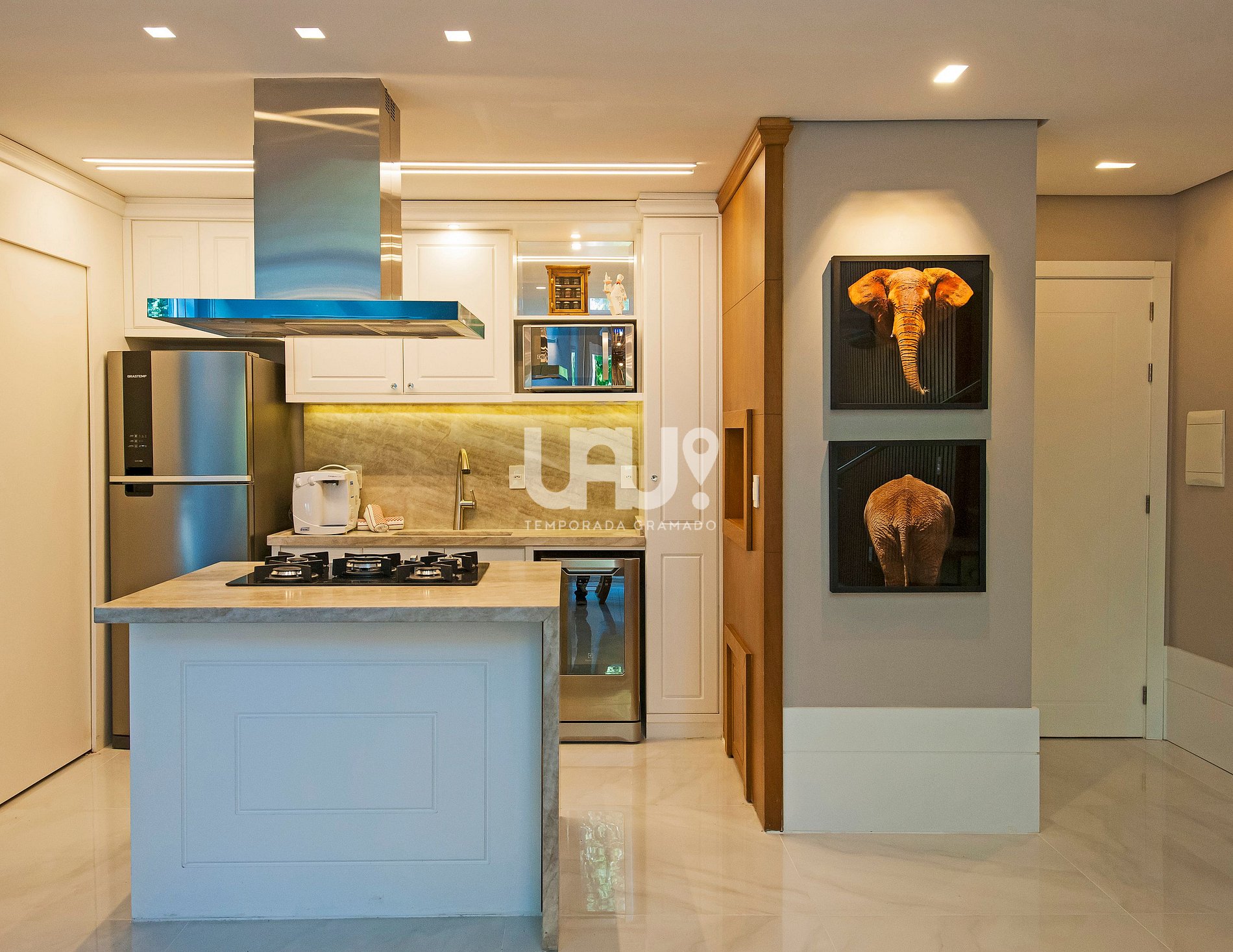 Ah! Para quem gosta de preparar aquele jantar especial, uma cozinha em estilo americano, totalmente equipada, com churrasqueira, integrada ao living...