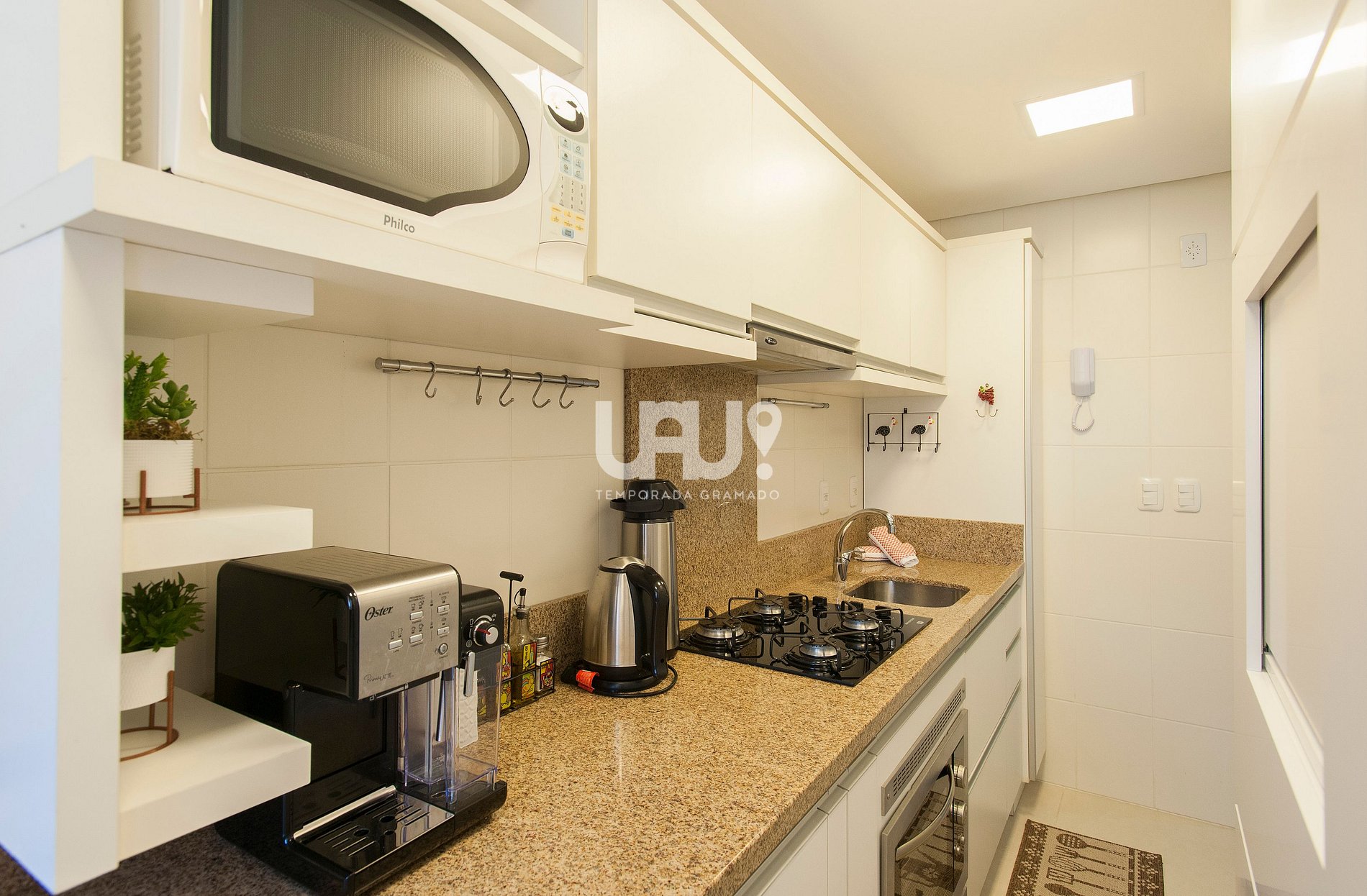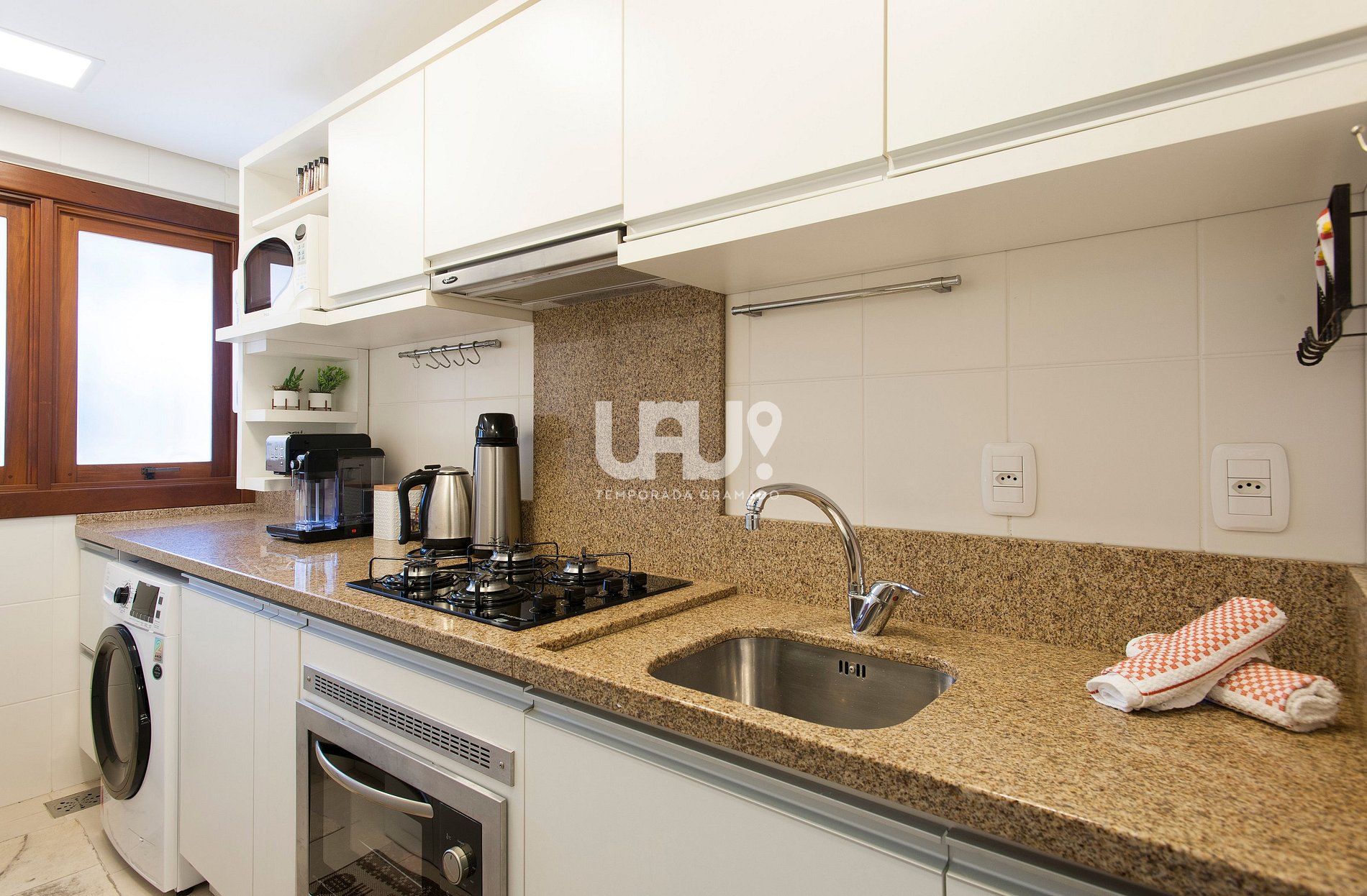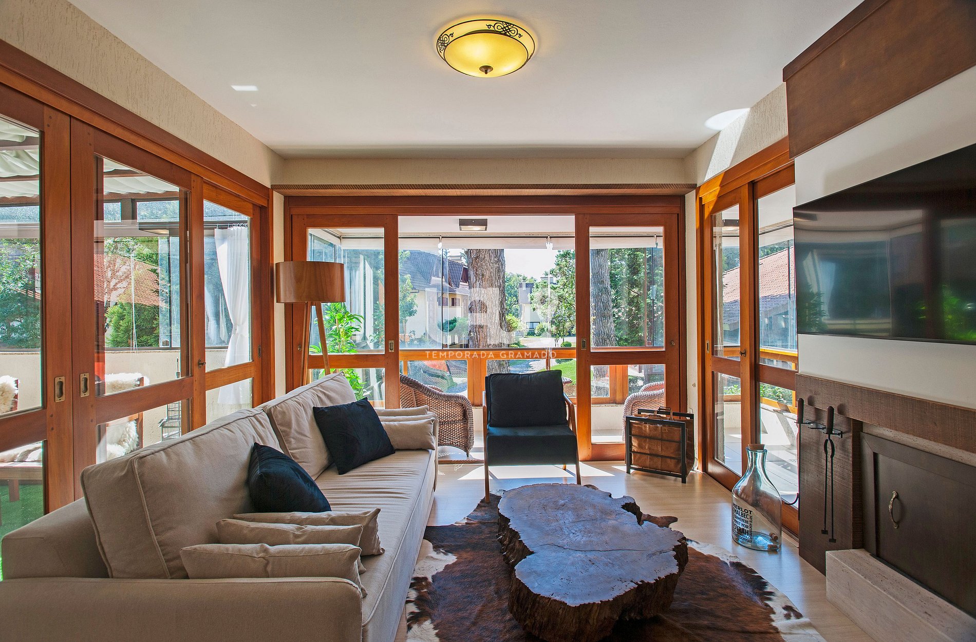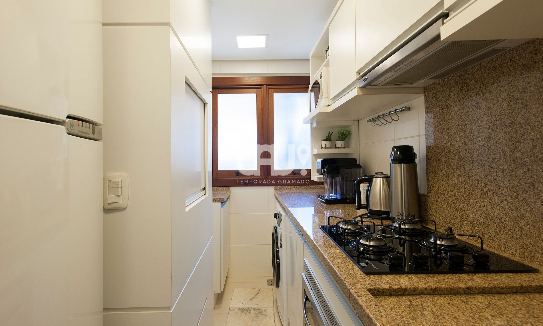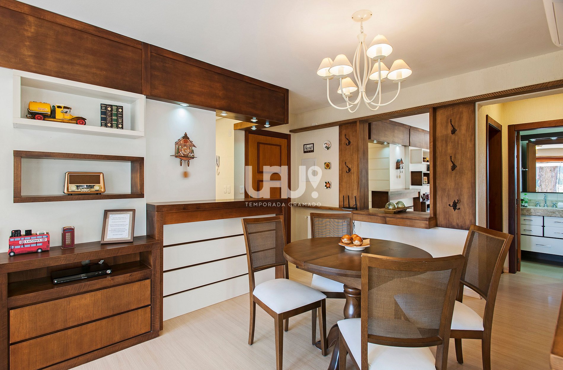 Living em 2 ambientes com confortável sofá cama, lareira, sala de estar/TV, mesa de jantar com 4 cadeiras, Ar Condicionado Q/F, bancada integrada à cozinha, totalmente equipada, área de lavanderia composta com máquina lava e seca ;