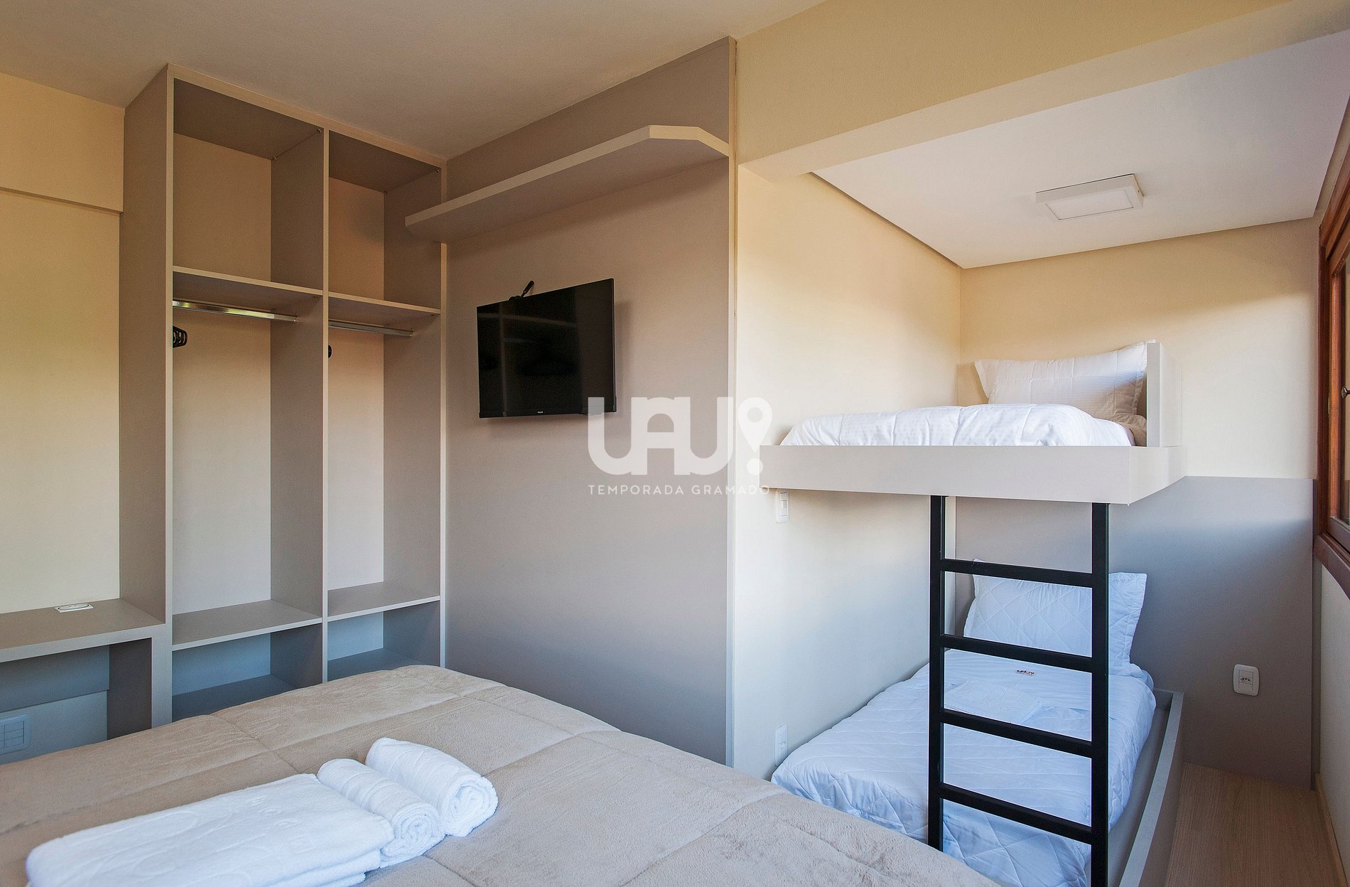 Dormitório com cama Queen Size, duas camas auxiliares, beliche, rouparia completa, SmartTV e Ar Condicionado Q/F;