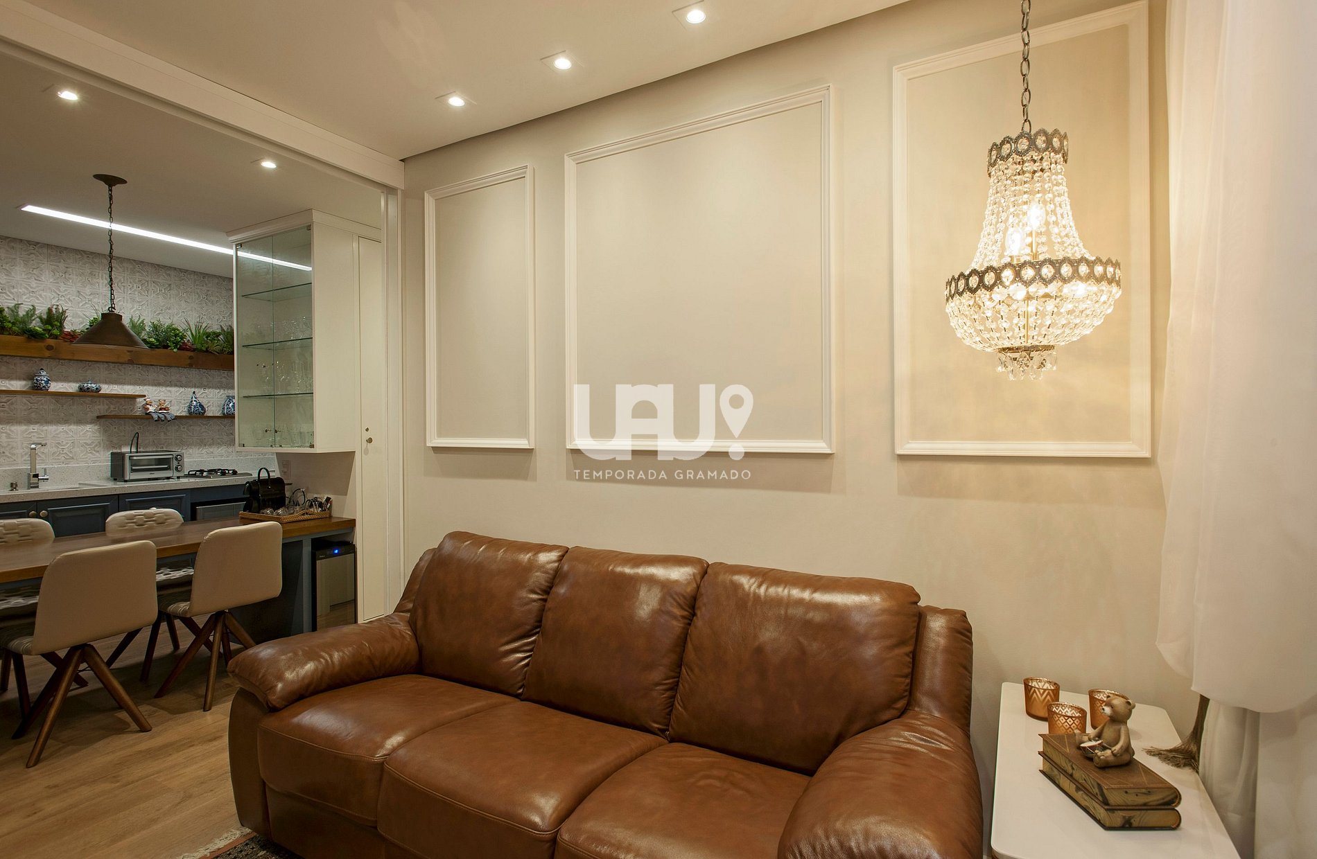 IMÓVEL ÚNICO EM GRAMADO!!! Living em 2 ambientes com sofá cama em couro e sacada com vista para o centro da cidade (com porta para máxima privacidade de quem ali dormir), SmartTV e Split Q/F; jantar com 4 cadeiras; cozinha em estilo americano totalmente equipada, dormitório com cama Queen Size, Split Q/F, rouparia e SmartTV, Banho completo; Garagem coberta; Wi-Fi, 33Mb.Não possui calefação .