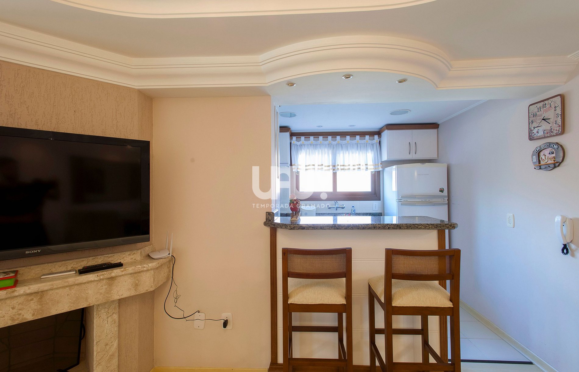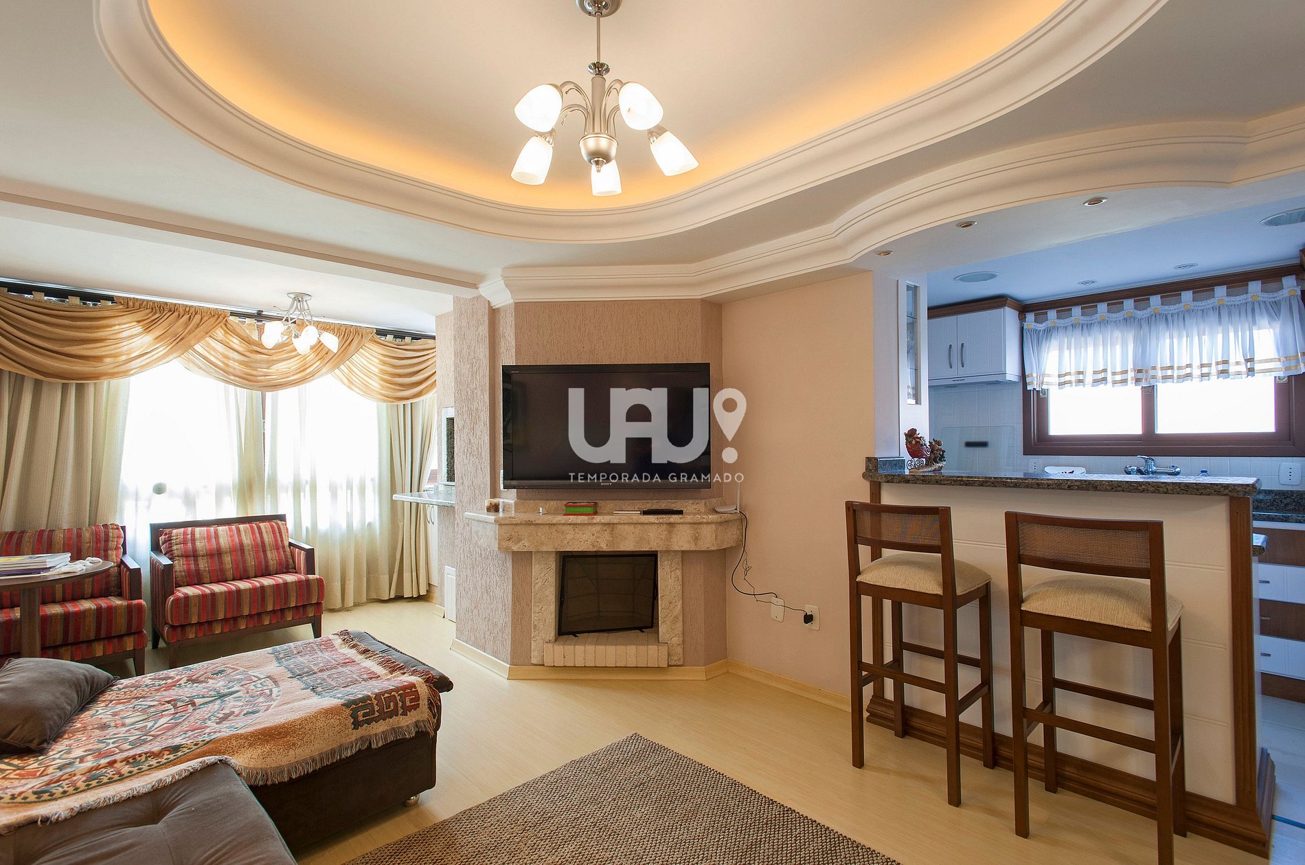Exuberante Cobertura com 3 dormitórios, sendo uma suíte, no coração de Gramado, a menos de 100m da Rua Coberta. Amplo living com com sala de estar, jantar para 6 pessoas, confortável sofá cama, churrasqueira e lareira;