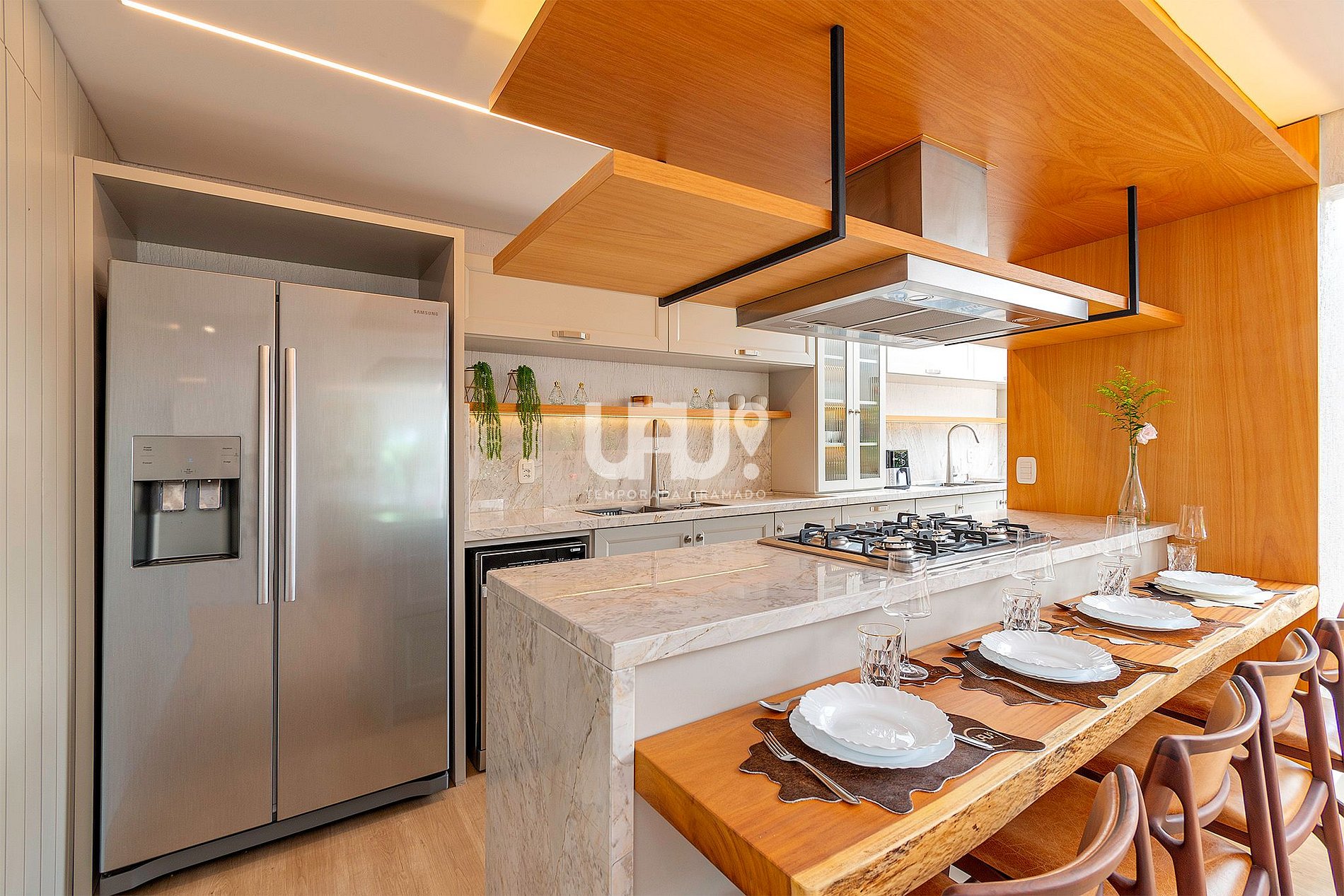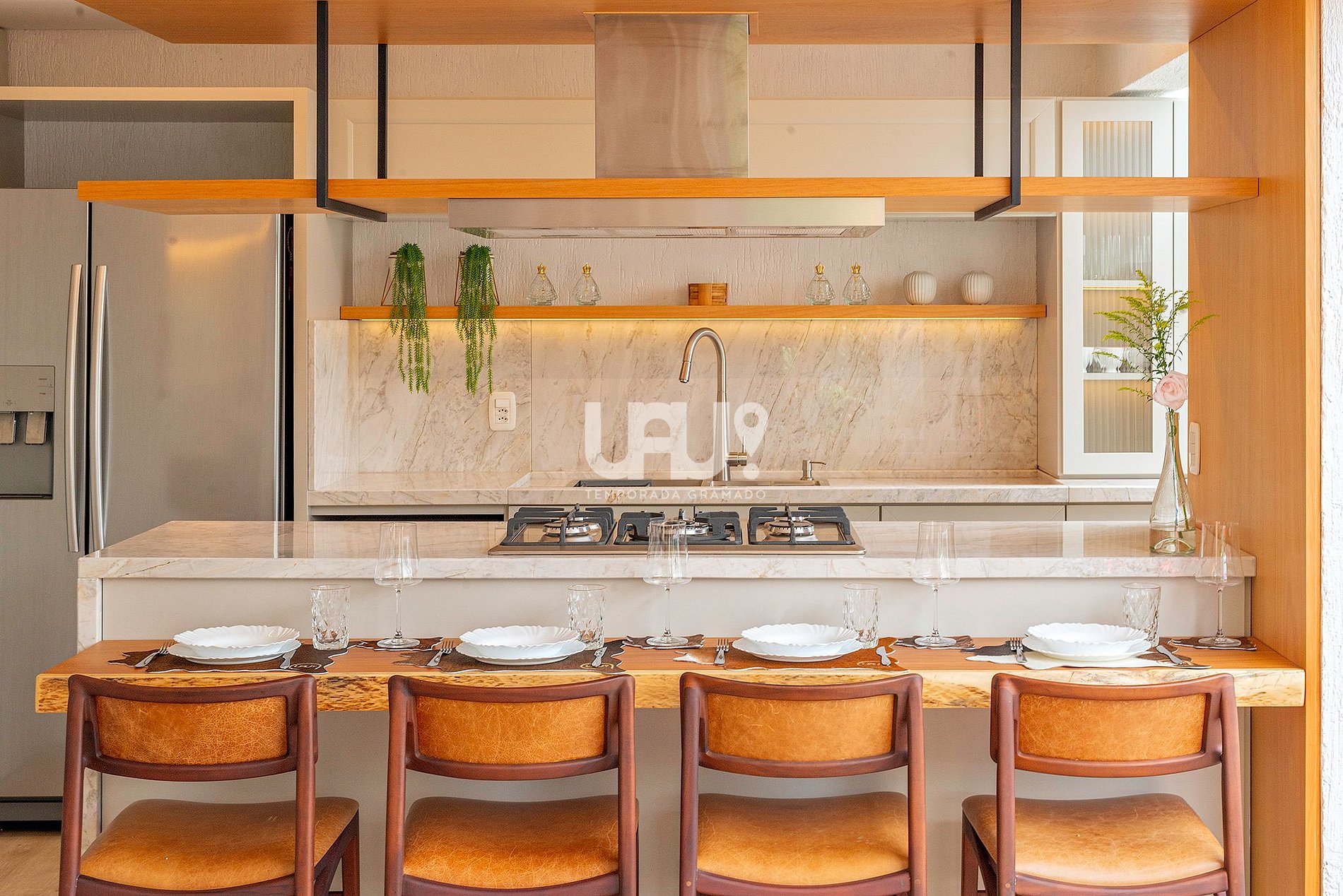 Cozinha em estilo americano com ilha e bancada de refeições, refrigerador Side By Side, forno elétrico 84l, microondas, lavadora de louças 14 serviços, Air Fryer, Nespresso, cafeteira elétrica, sanduicheira, liquidificador, jarra elétrica e todos os utensílios para o preparo de refeições;