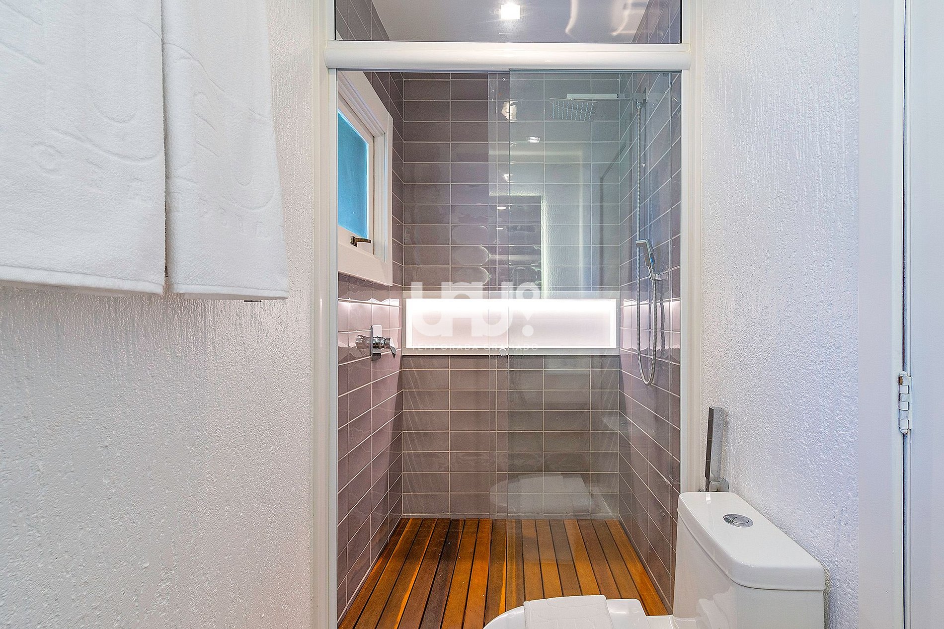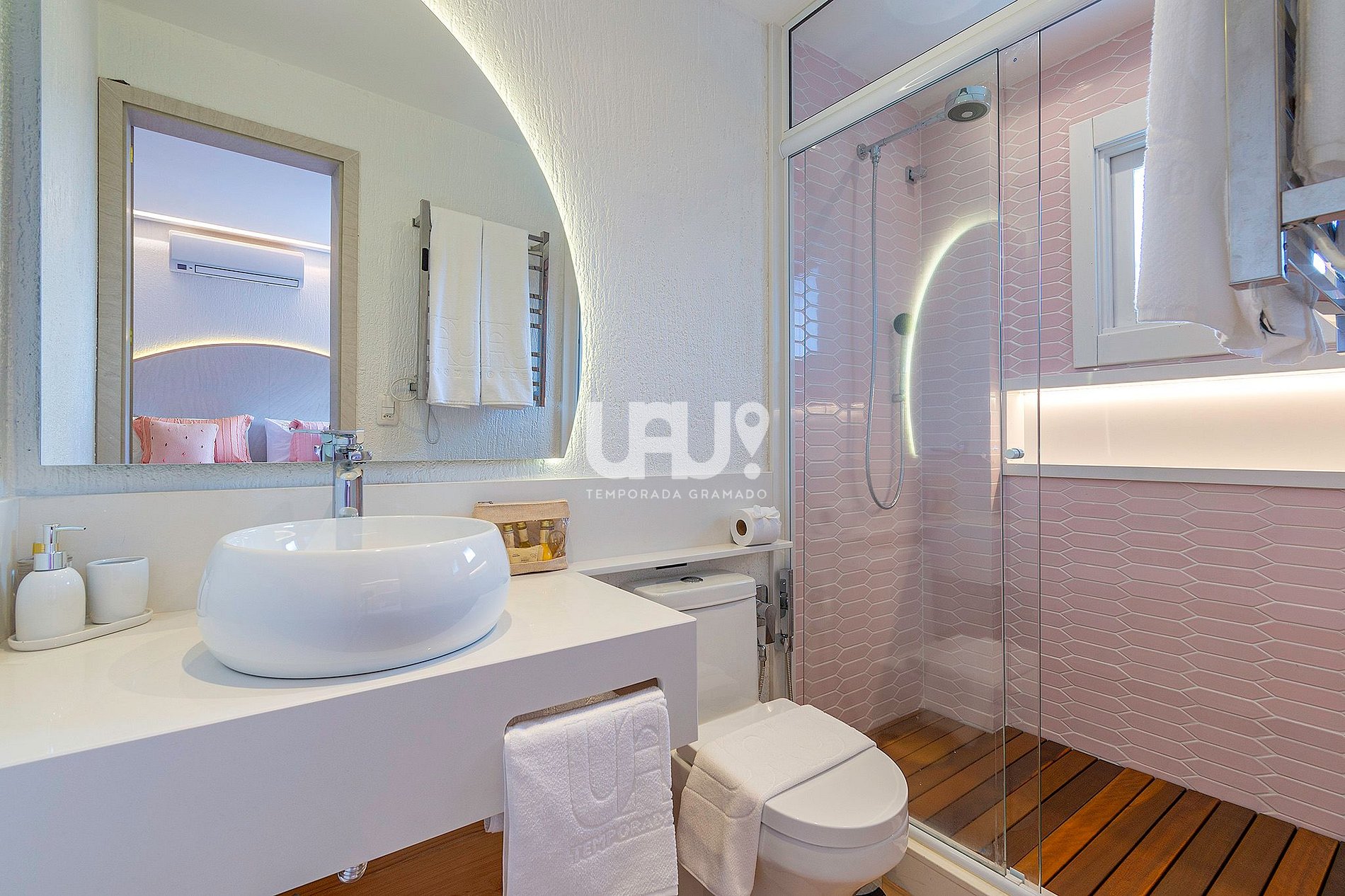Banho completo com ducha higiênica, toalheiro elétrico e secador de cabelo e acesso às duas Demi-Suítes;