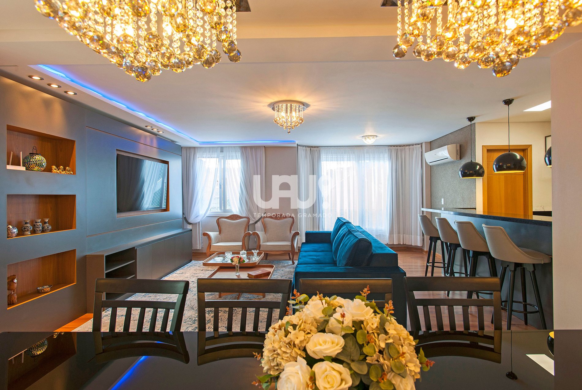 Amplo living em 3 ambientes com jantar para 10 pessoas, estar com SmartTV 50', split quente e frio, integrada à cozinha, em estilo americano, com bancada ;