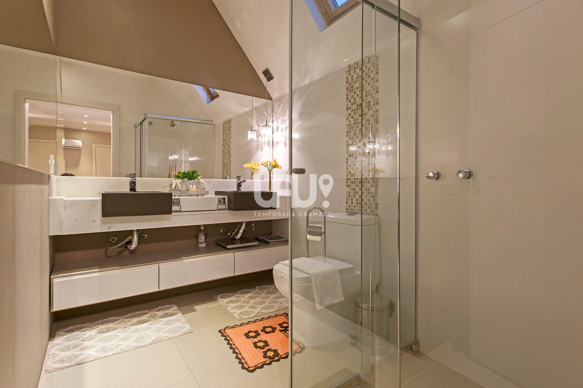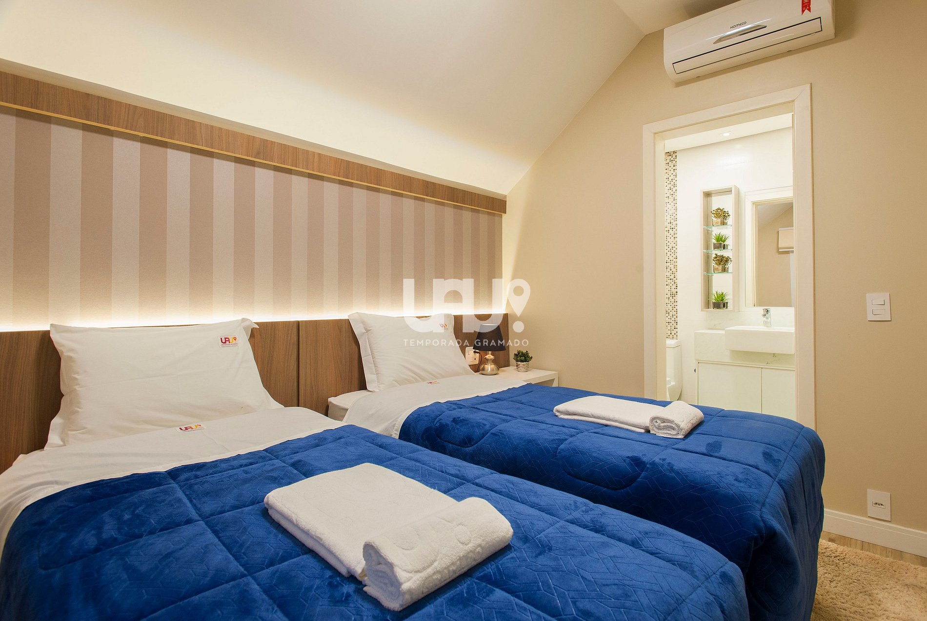 Suíte com duas camas de solteiro (que, unidas, formam outra tamanho Queen Size), rouparia completa e Split Q/F;