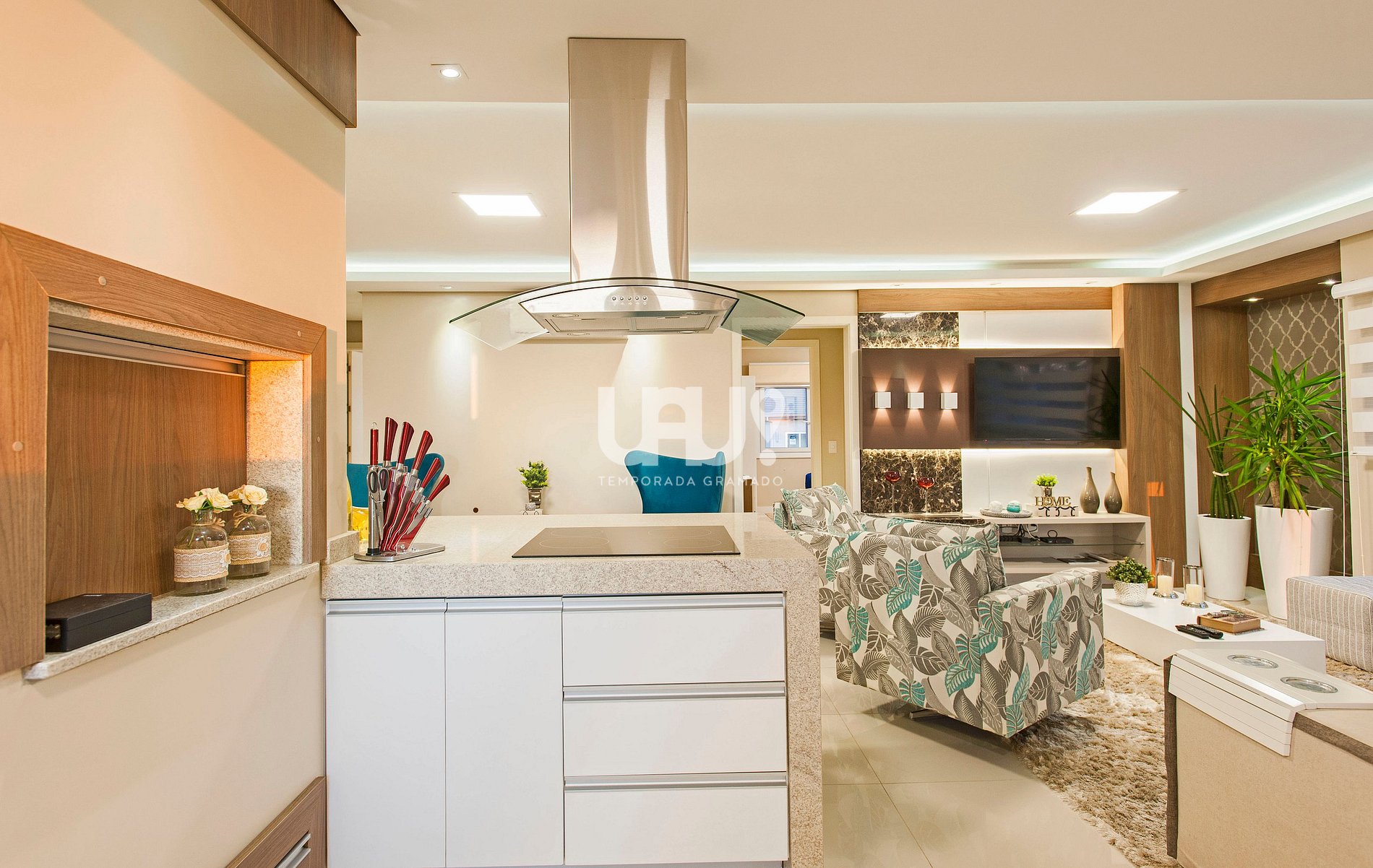 Cozinha em estilo americano totalmente equipada, bancada de apoio para 4 pessoas, utensílios e eletrodomésticos;