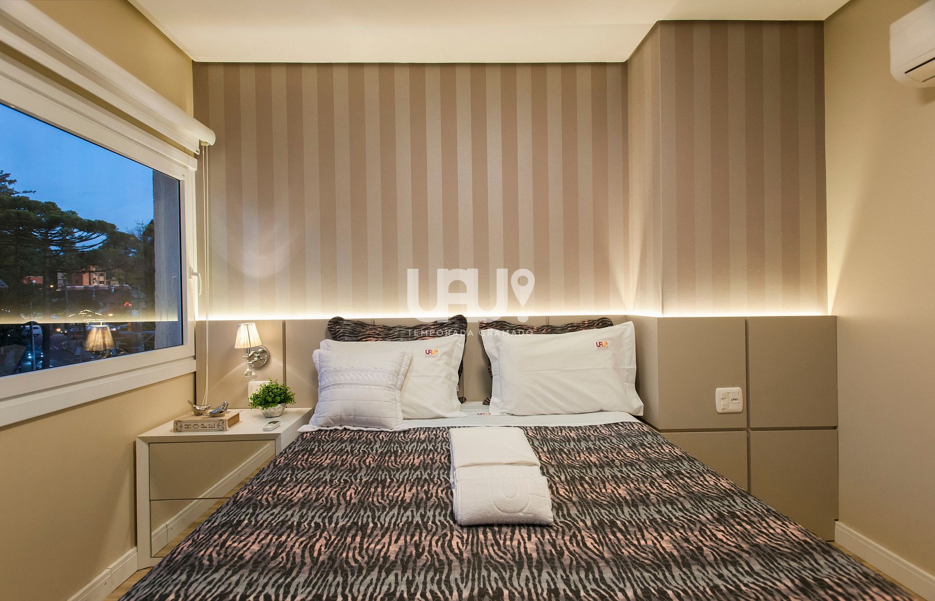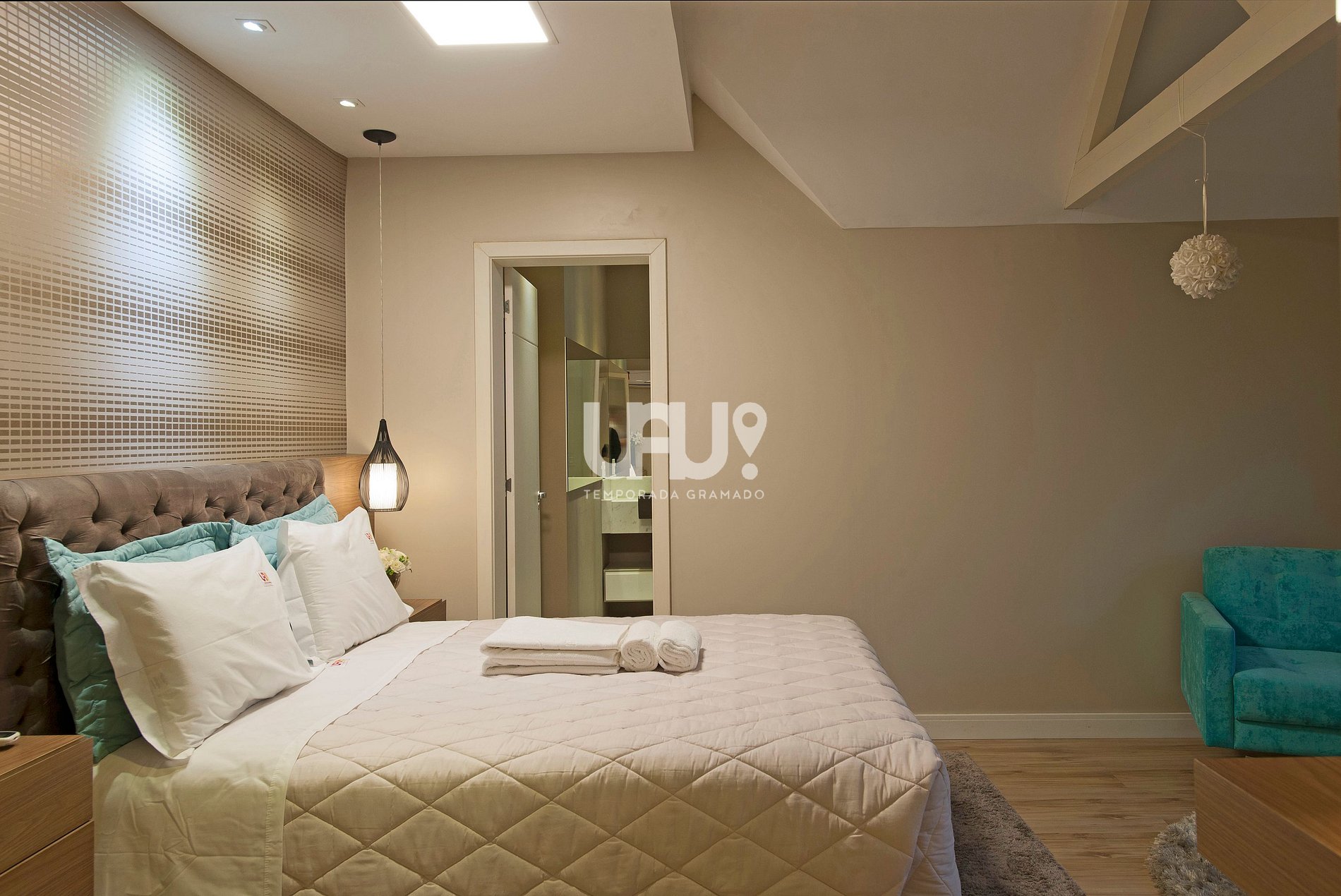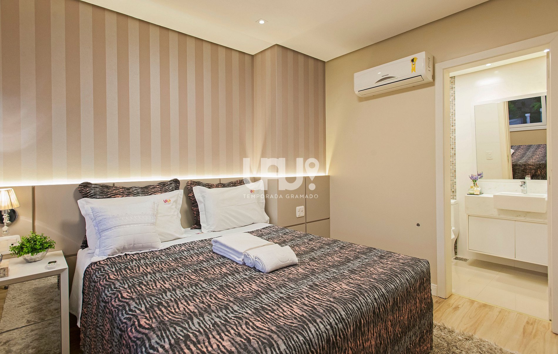 Suíte master com cama Queen Size, rouparia completa e Split Q/F;
