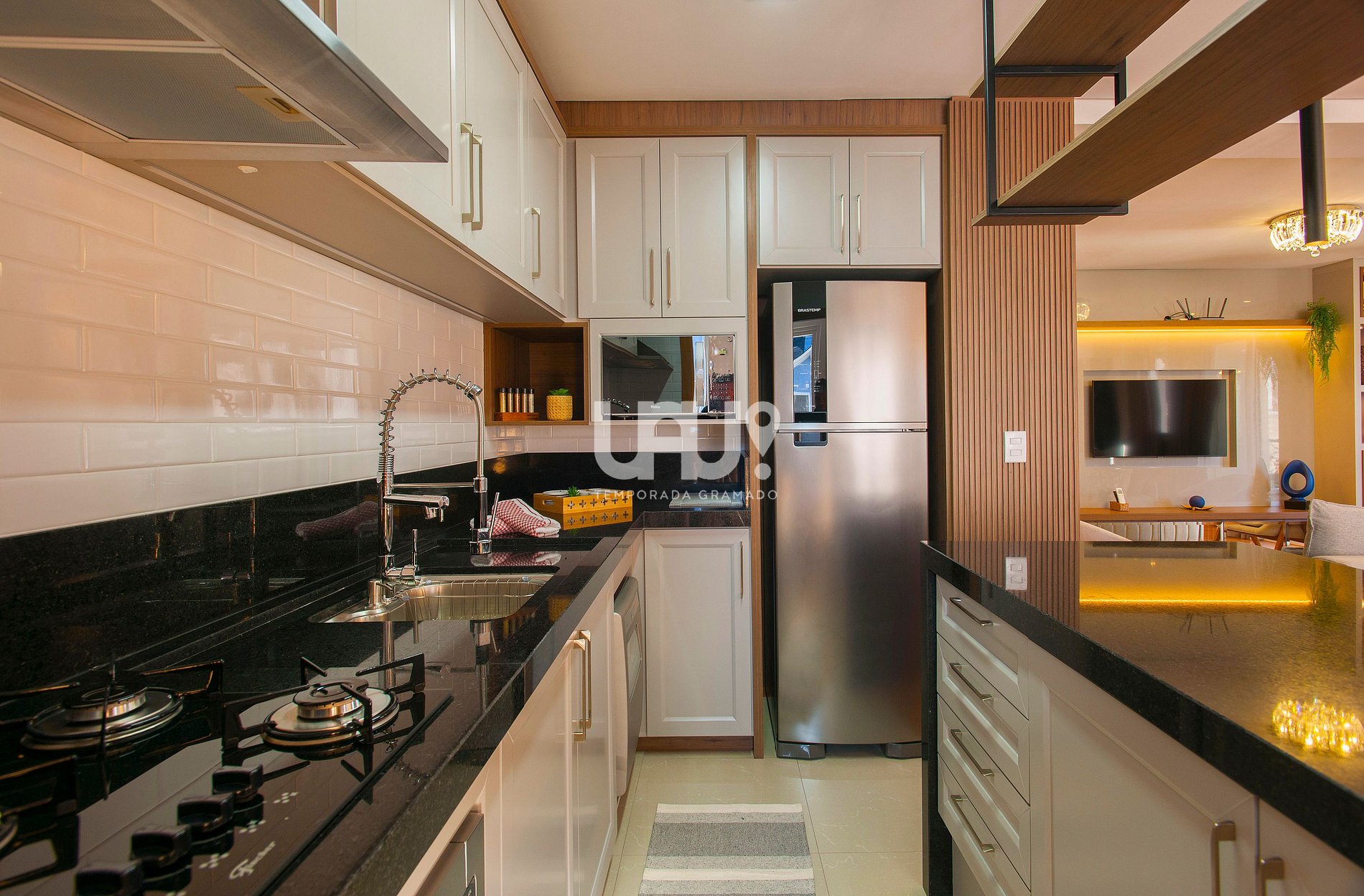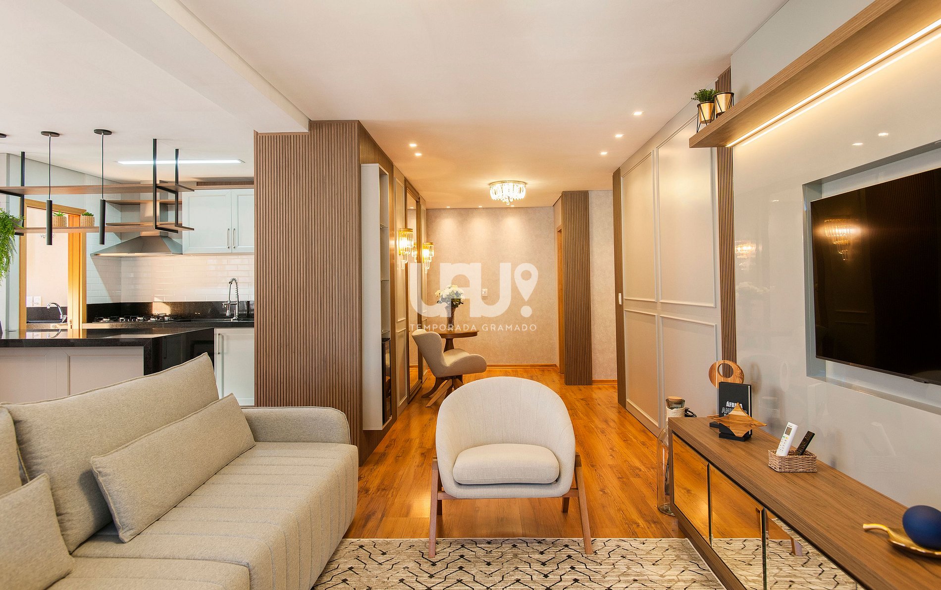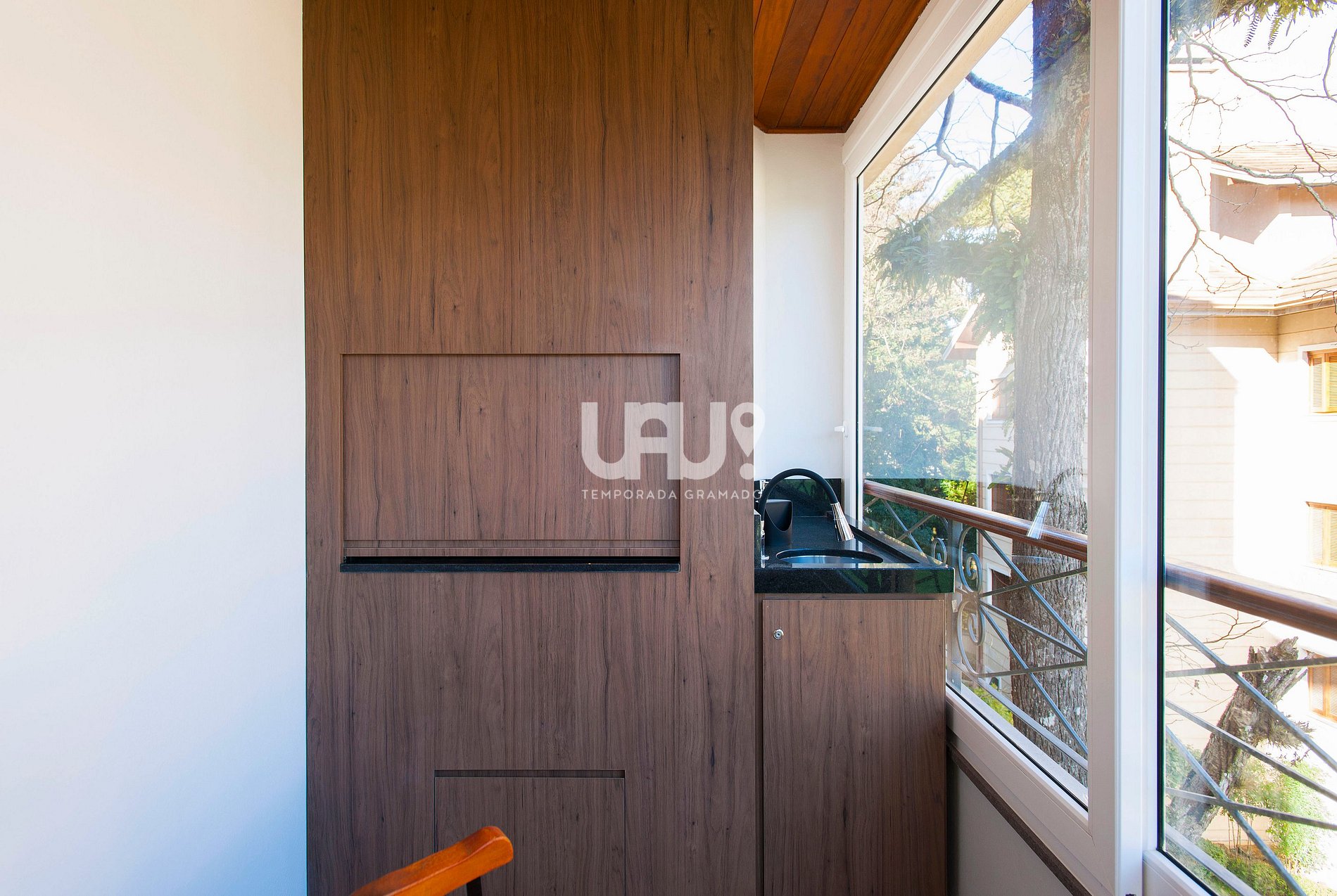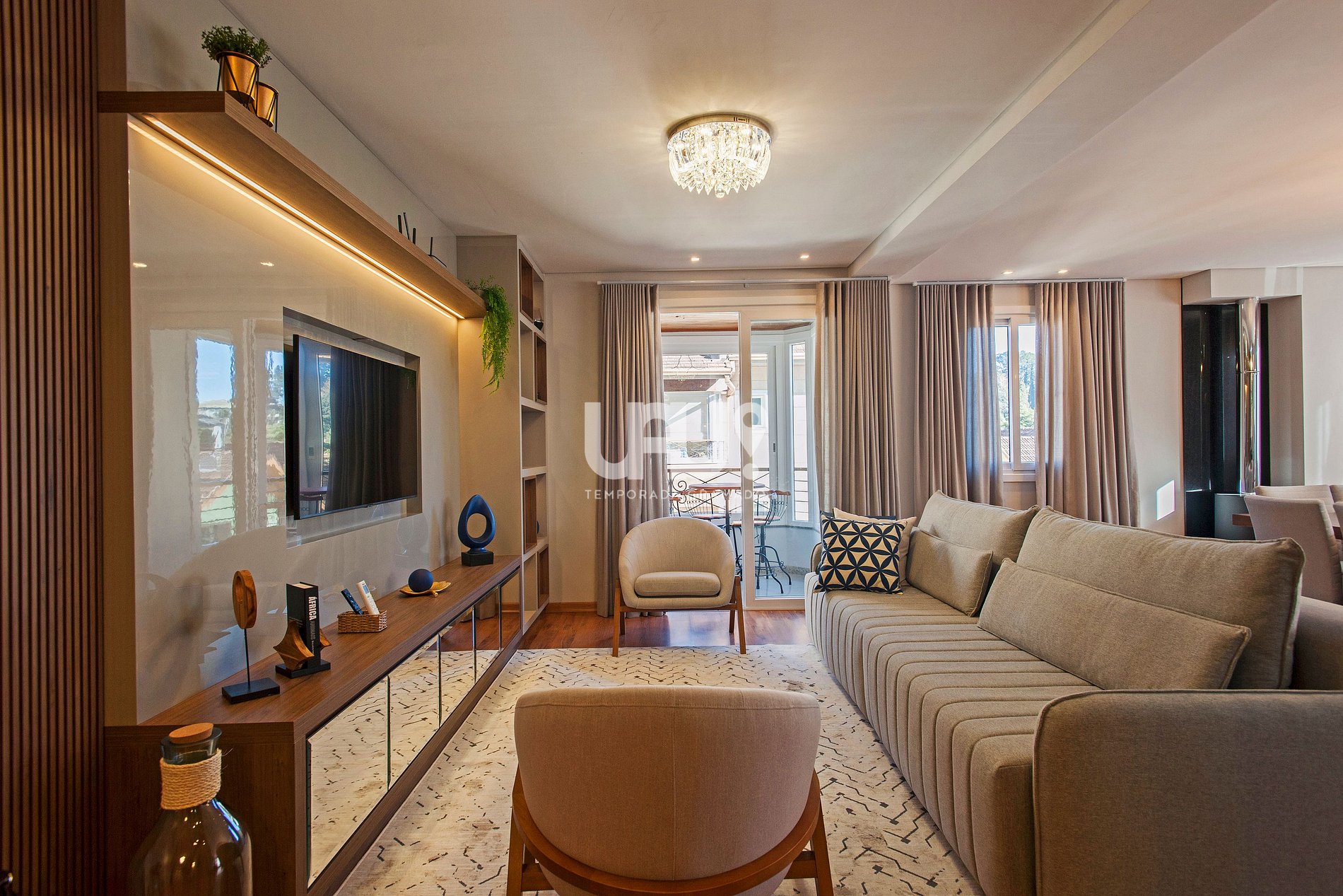 Living em três ambientes com hall de entrada, sala de estar/TV com SmartTV 60', jantar para 10 pessoas, área de leitura e bancada integrada à cozinha, em estilo americano. Adega climatizada, split quente e frio e estufa à lenha. Sacada integrada, com churrasqueira;