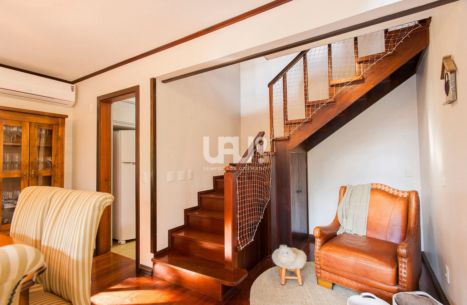 Living em dois ambientes: sala de estar com lareira, mesa jantar para 8 pessoas, ar condicionado quente e frio e SmartTV 50';