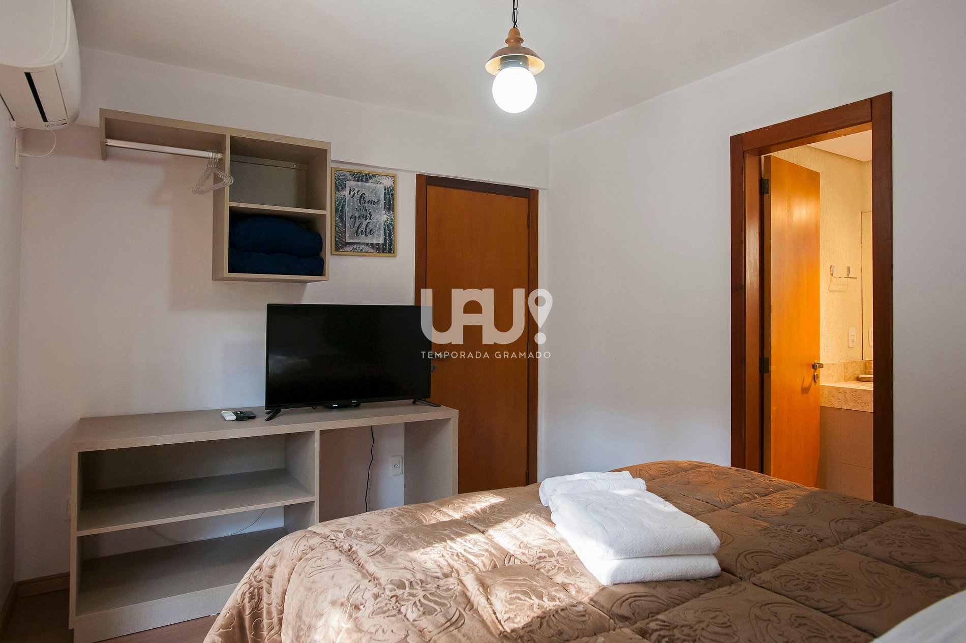 Suíte com cama Queen Size, 2 camas auxiliares, rouparia e Ar Condicionado Q/F;
