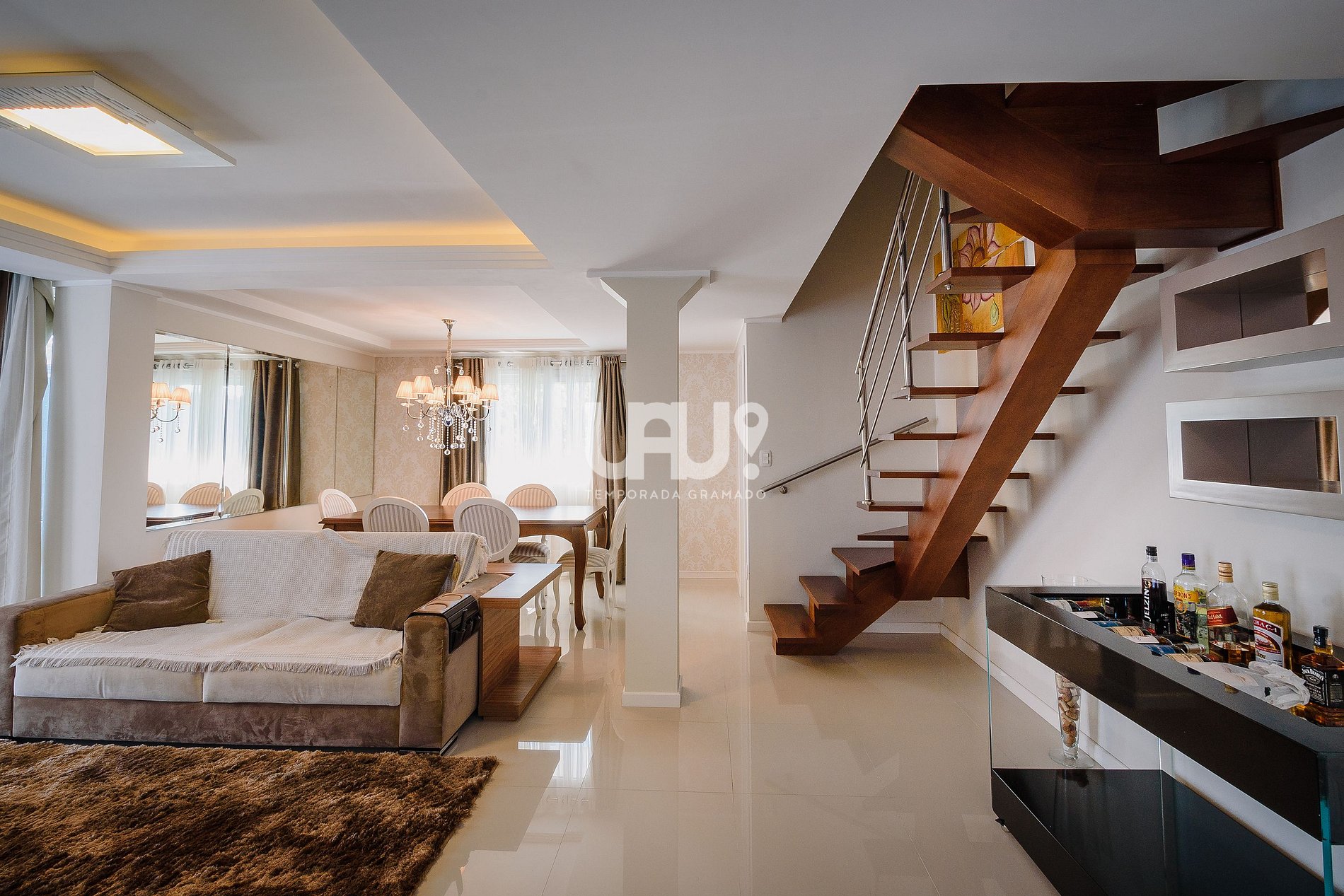 Cobertura Duplex finamente mobiliada com living em 2 ambientes: sala de estar com confortável sofá cama, poltronas, SmartTV e split q/f; jantar para 6 pessoas, integrado à cozinha, em estilo americano, totalmente equipada, com churrasqueira e eletrodomésticos;